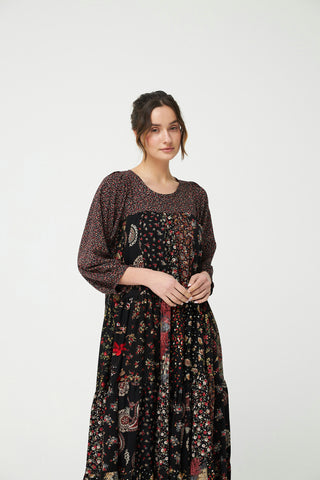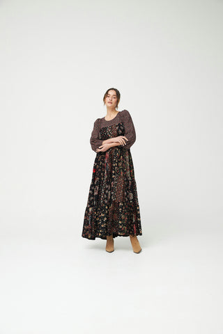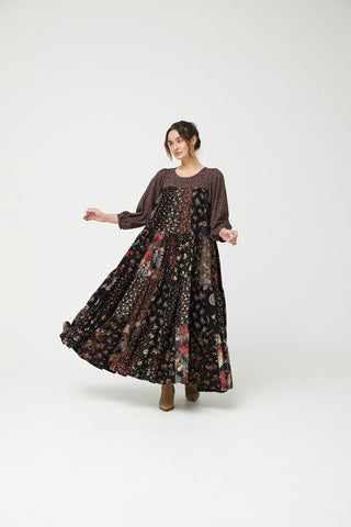 Loose cut tiered long dress with 3/4 gusset sleeves. Patchwork is made of 6 distinct prints that are picked based on materials available, preserving a color symmetry and overall aesthetic sincerity. The material is rayon.
