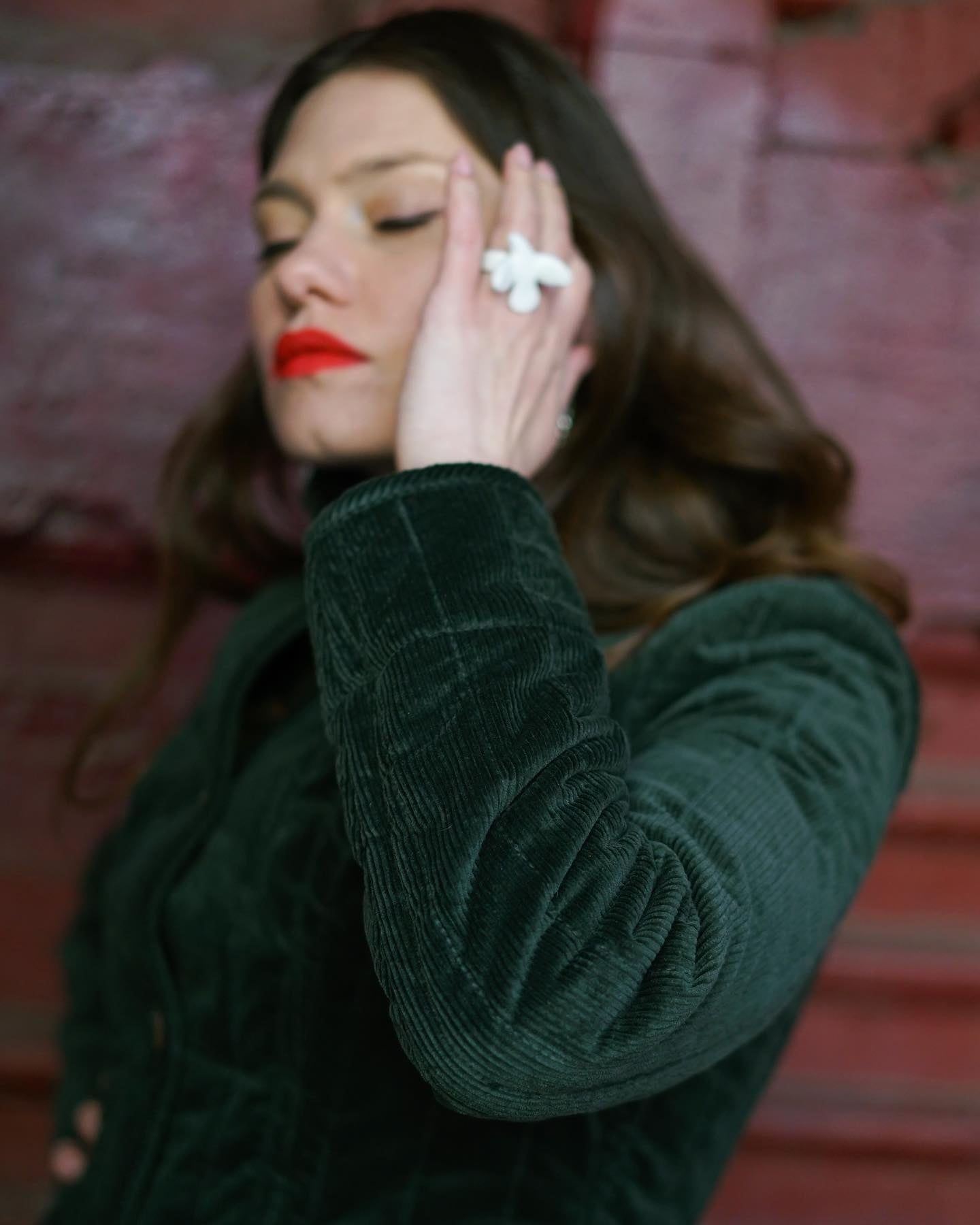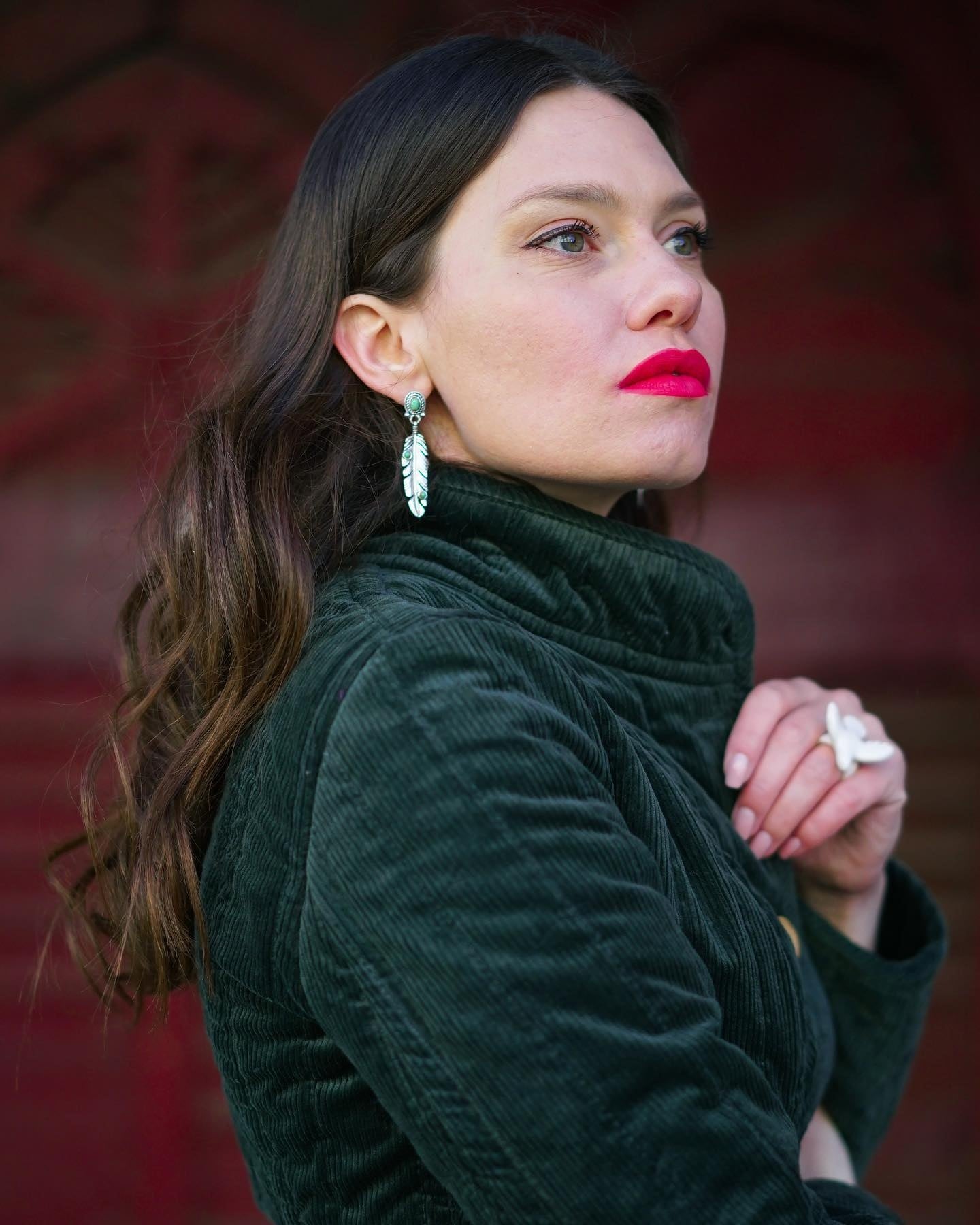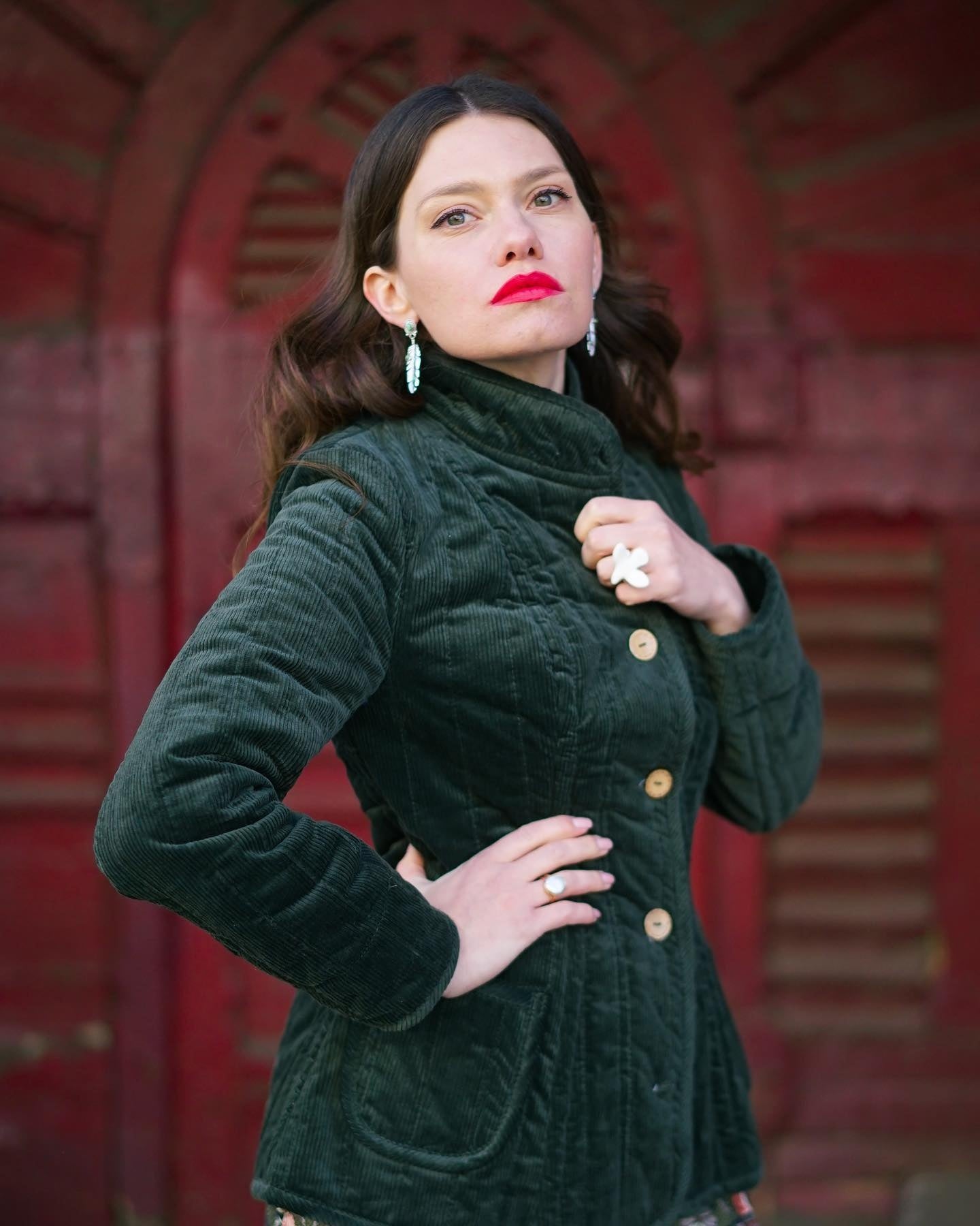 Warm, button-down basque-jacket with patch pockets and mandarin collar. The jacket is filled with batting and has a cotton interior. The exterior is 100% micro-corduroy; the filler is organic batting and interior is 100% cotton.