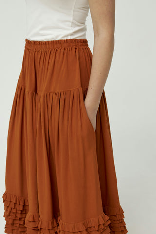 Solid midi skirt with a yoke and elastic waistband. The hem is adorned with several rows of fine ruffles. Made of 100% viscose.