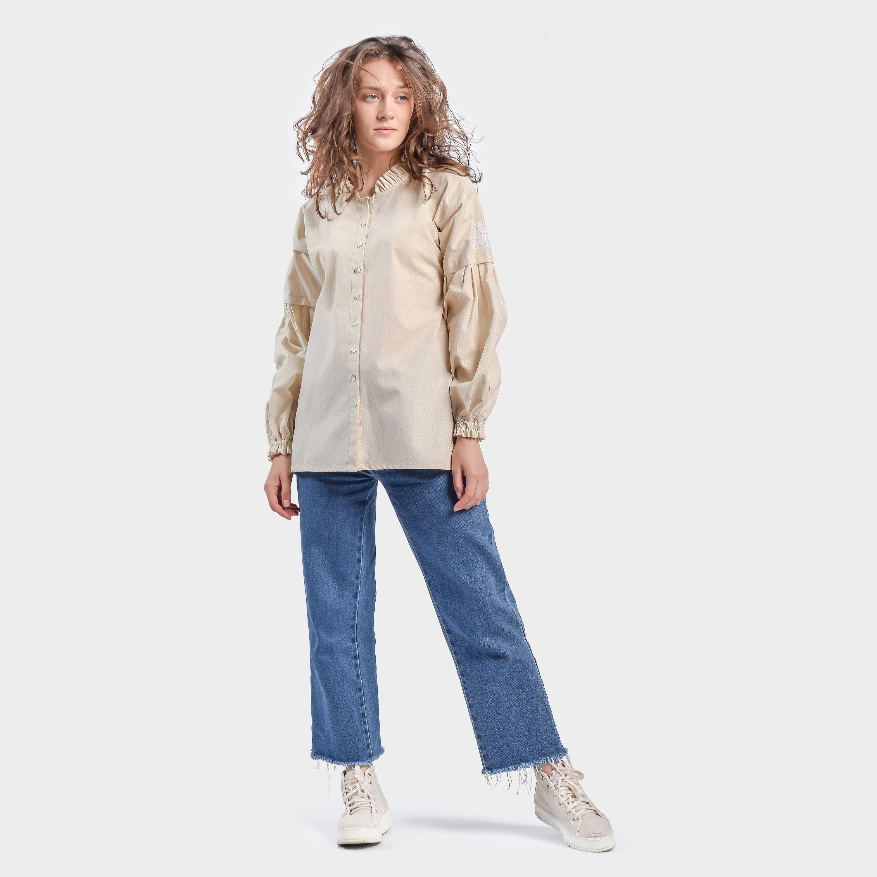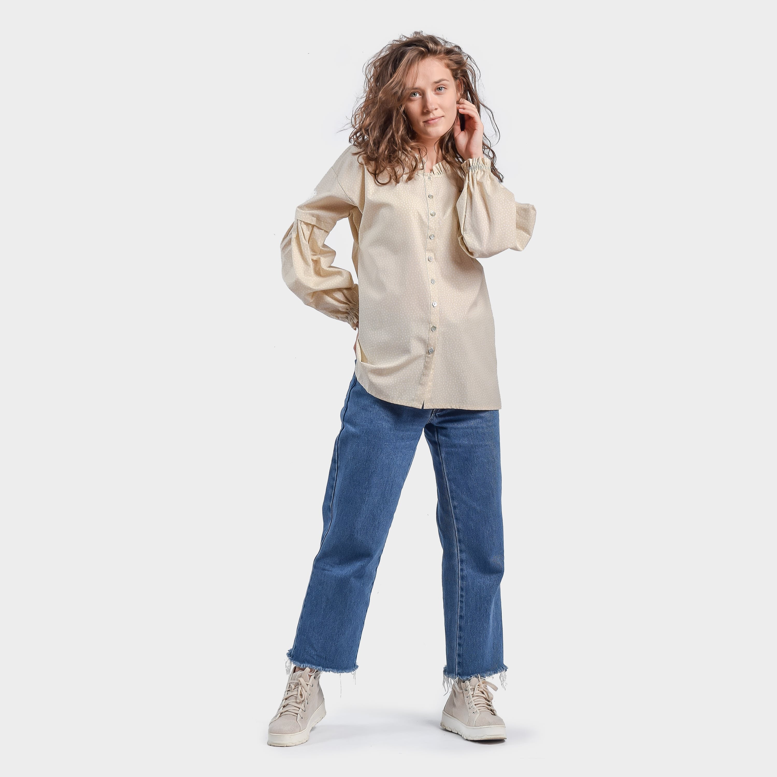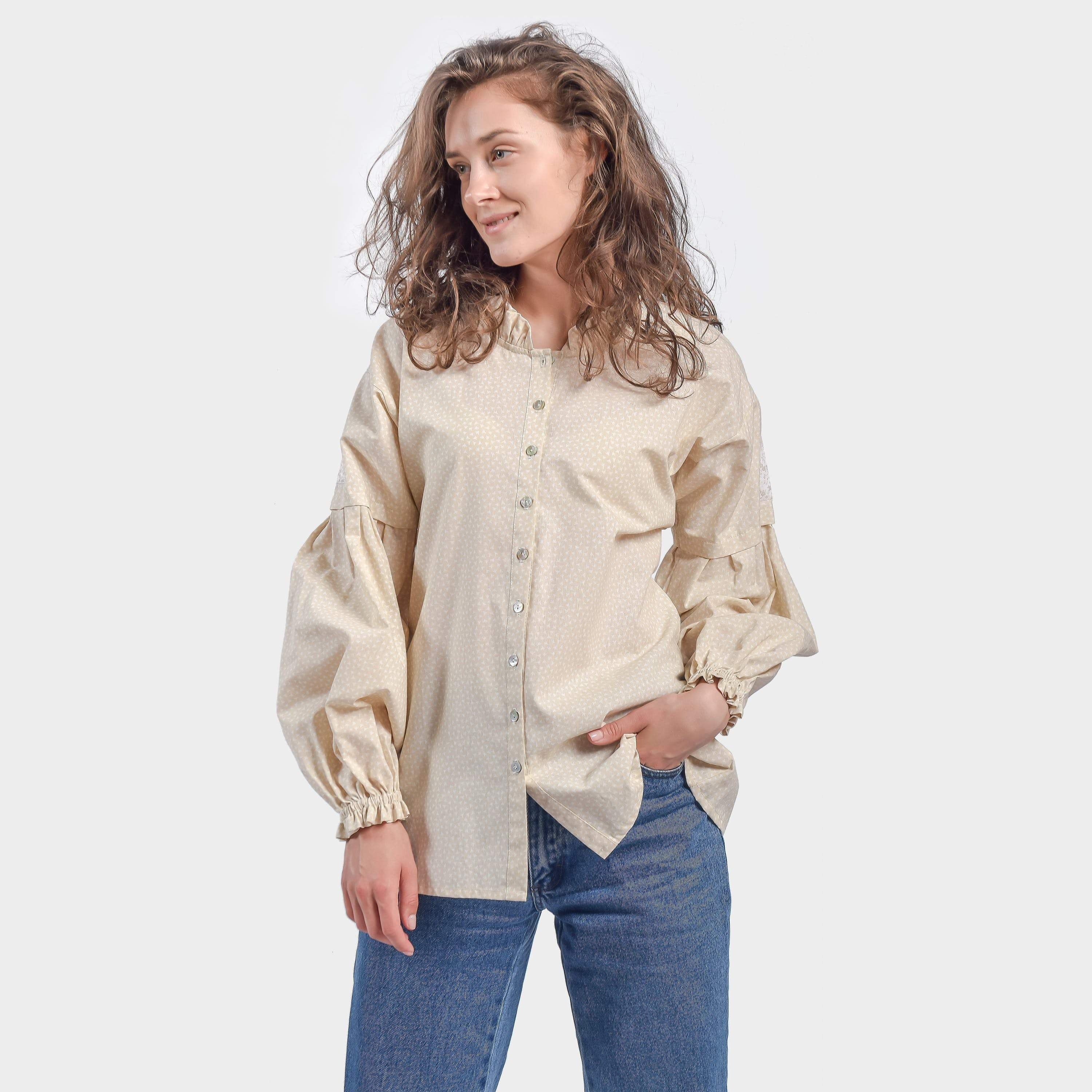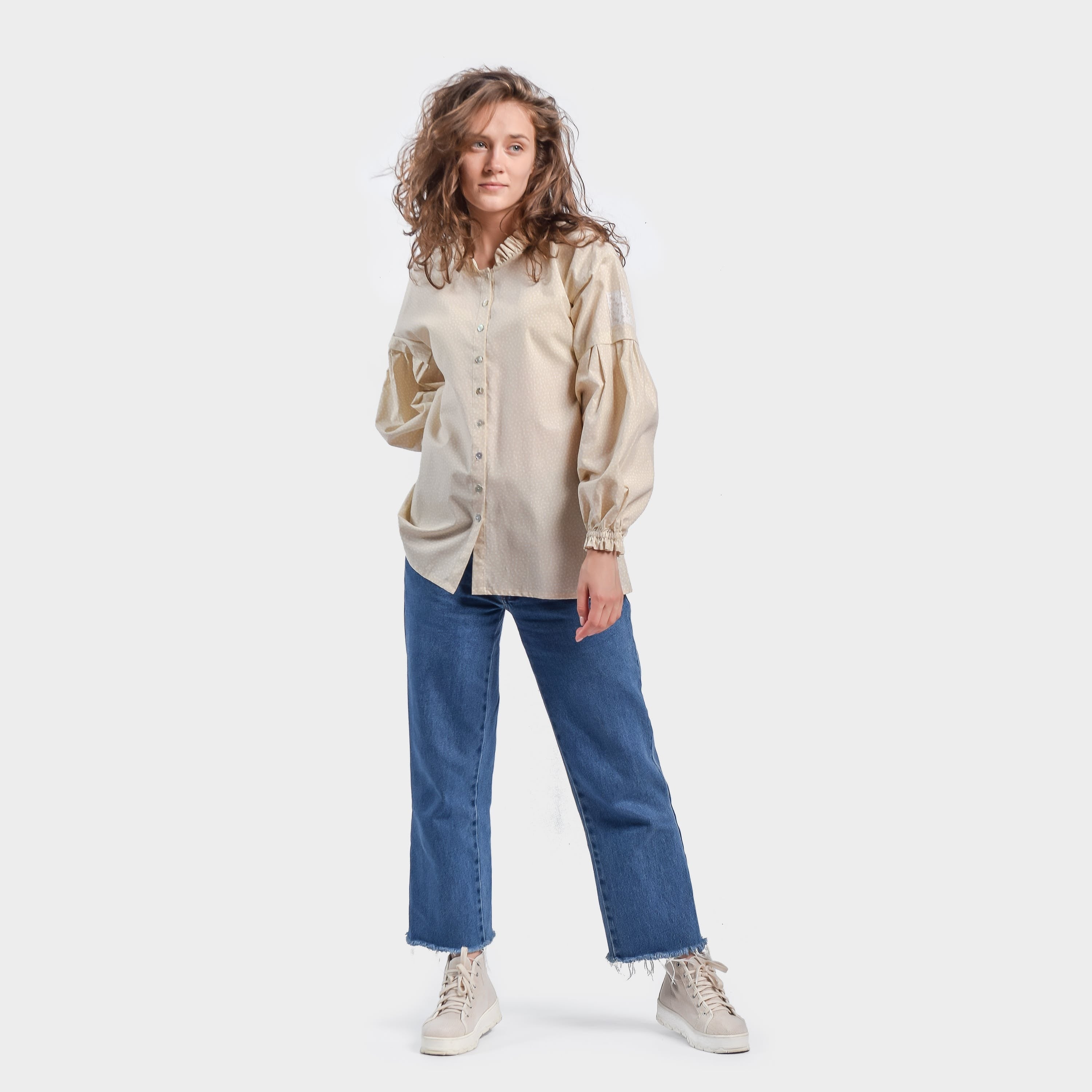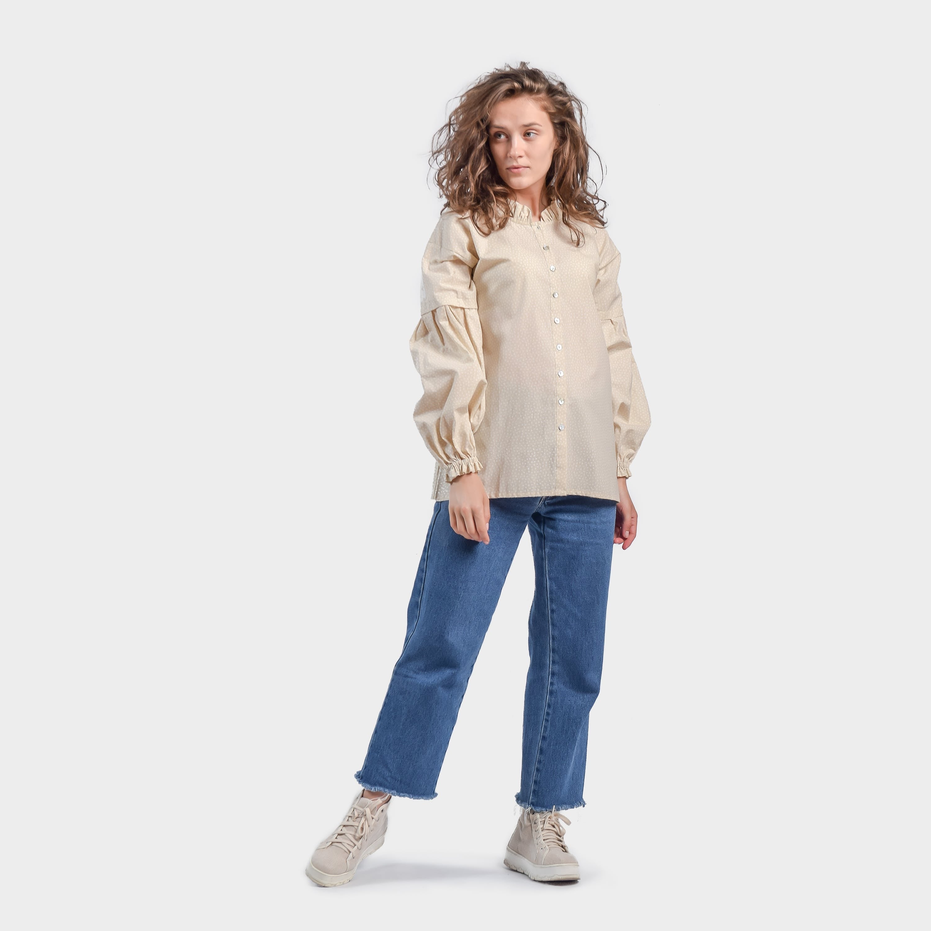 Button-down blouse with long and fluffy sleeves has gusseted armholes. Blouse has slim cuffs and pleats around the neckline. The material is 100% cotton.