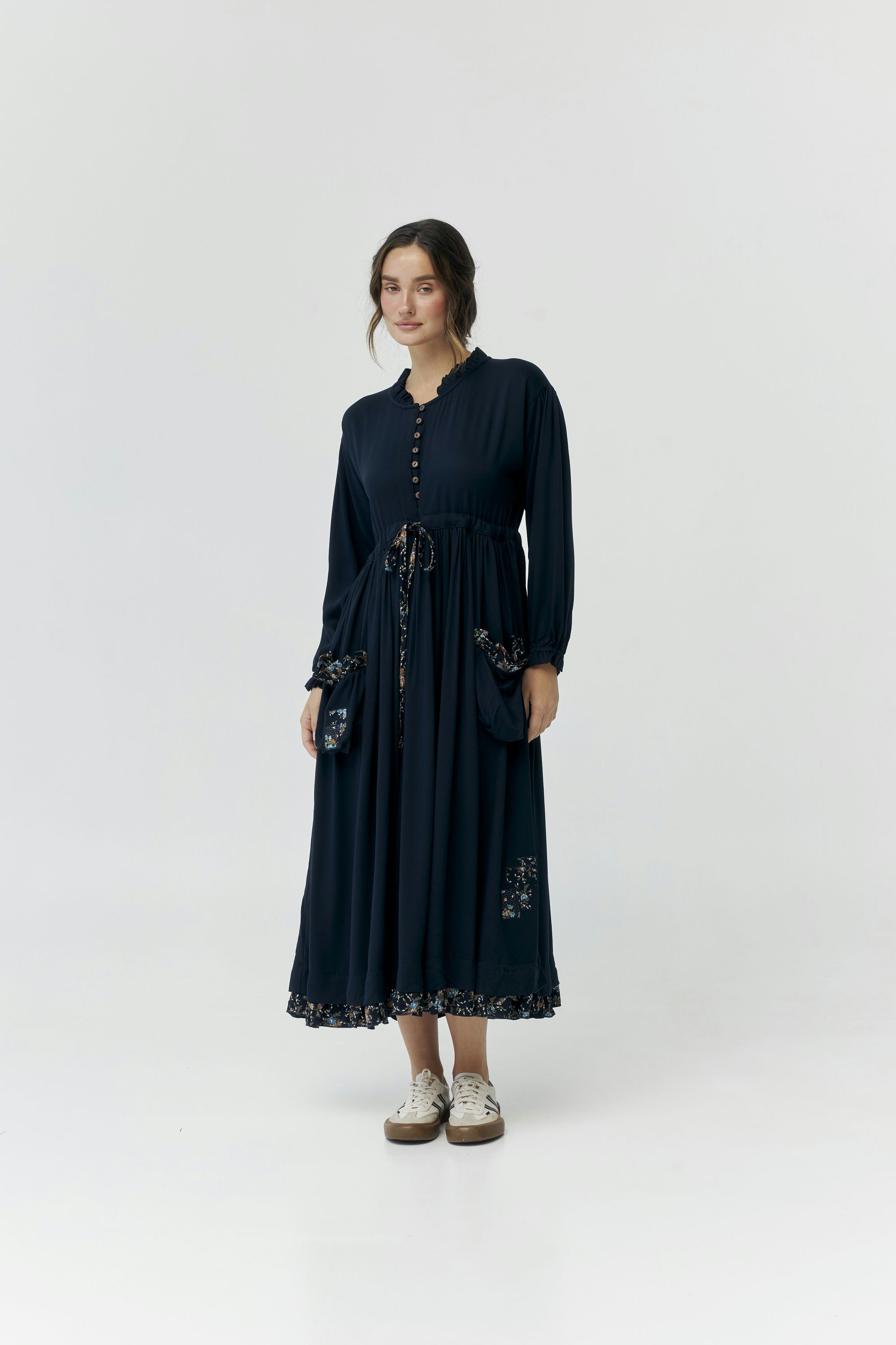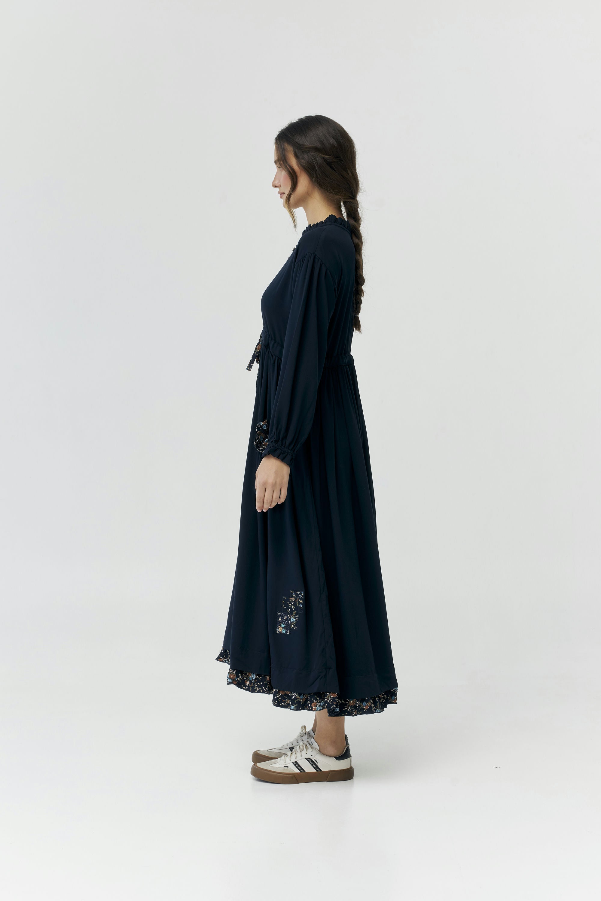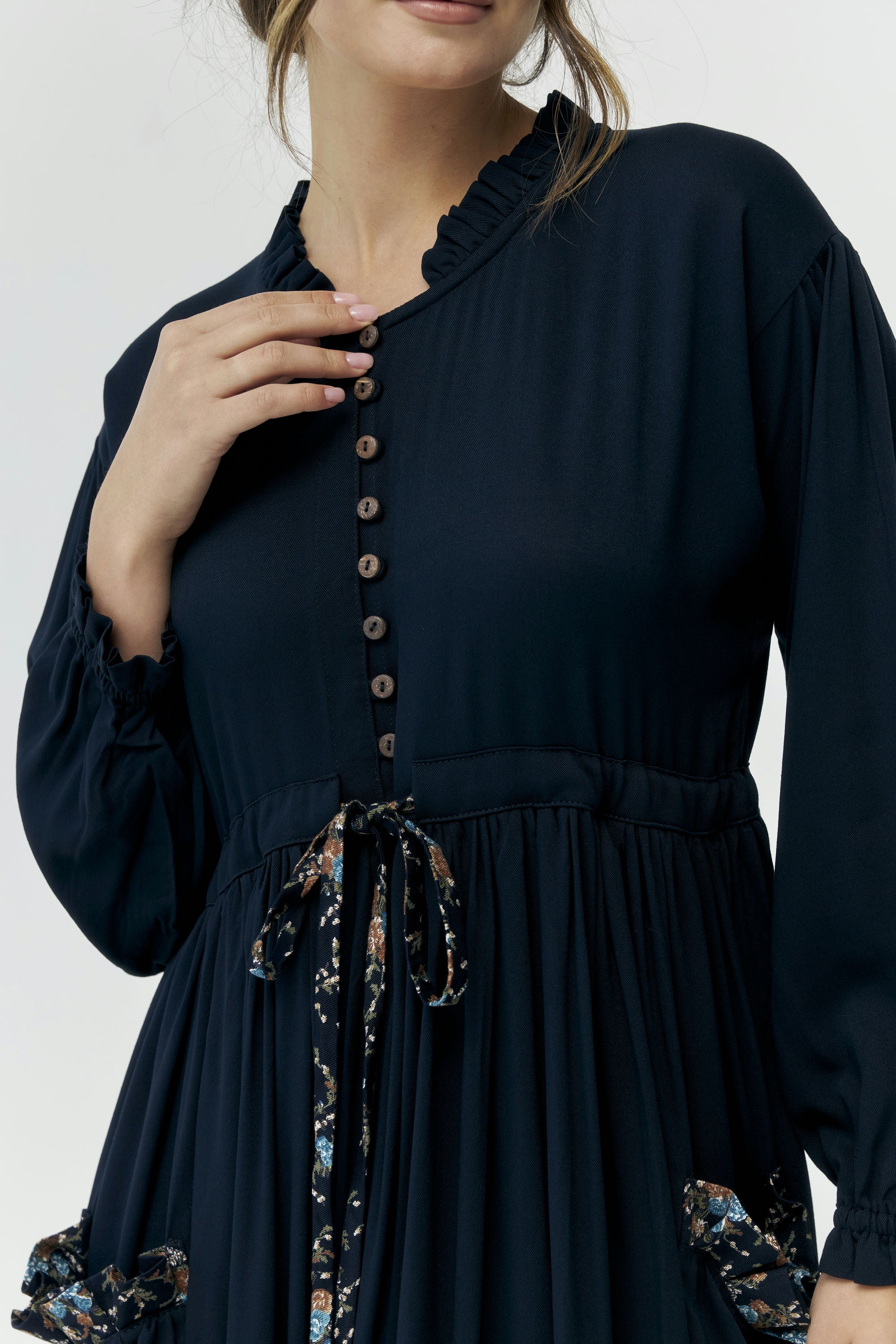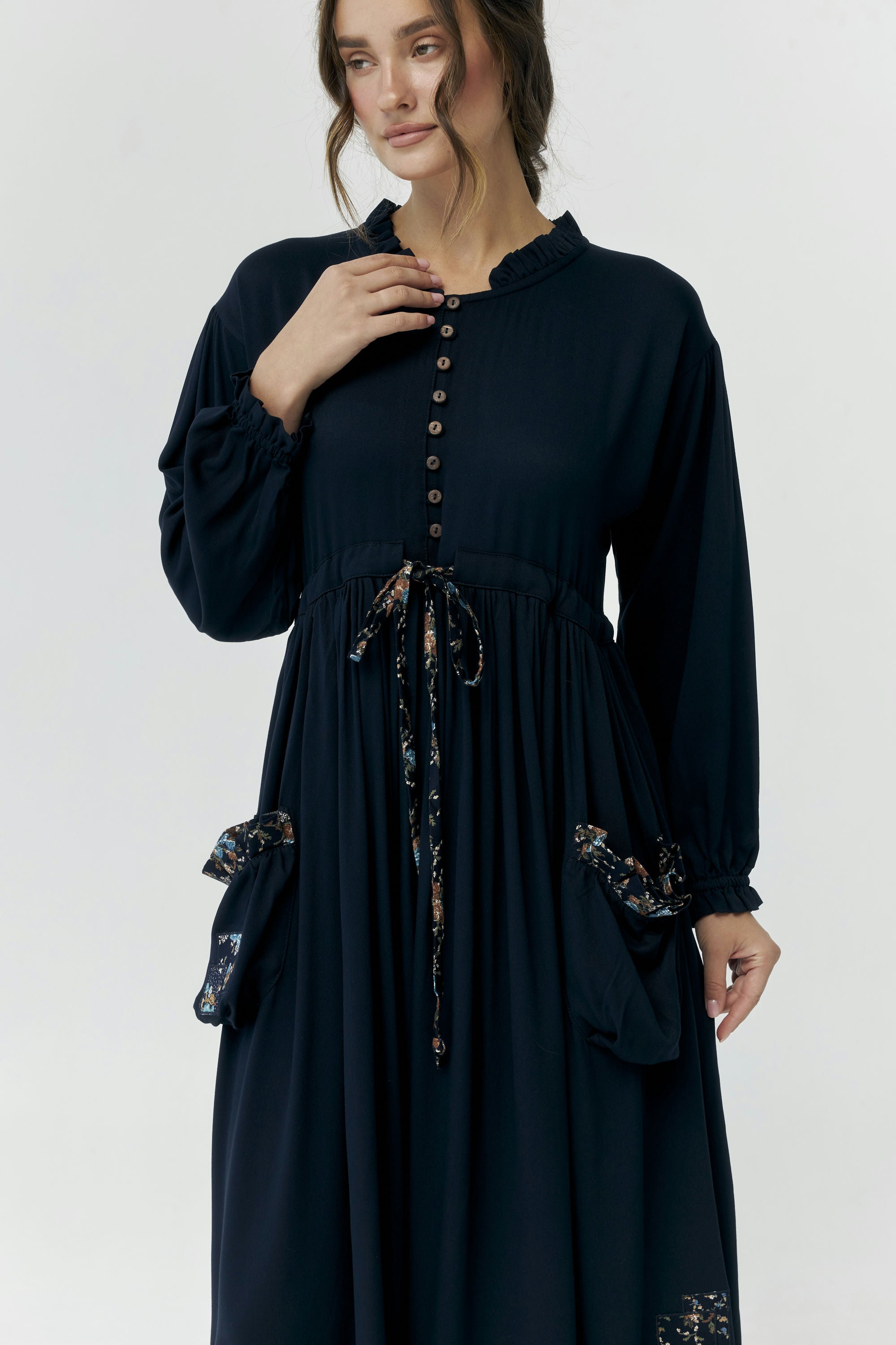 Платье миди с длинными объемными рукавами и ластовицей. Платье имеет пояс-кулиску по линии талии и планку на пуговицах. Воротник, подол и карманы платья отделаны принтованной вискозой. На карманах, рукавах и спинке платье имеет декоративные лоскутки. Цвет лоскутков и отделки может изменяться, сохраняя цветовую гамму и художественную целостность. Ткань - вискоза.