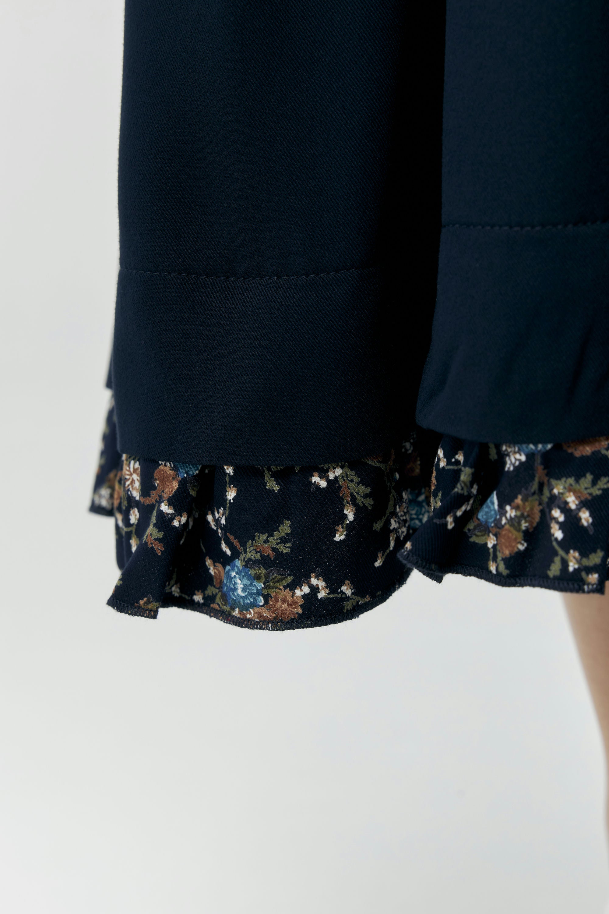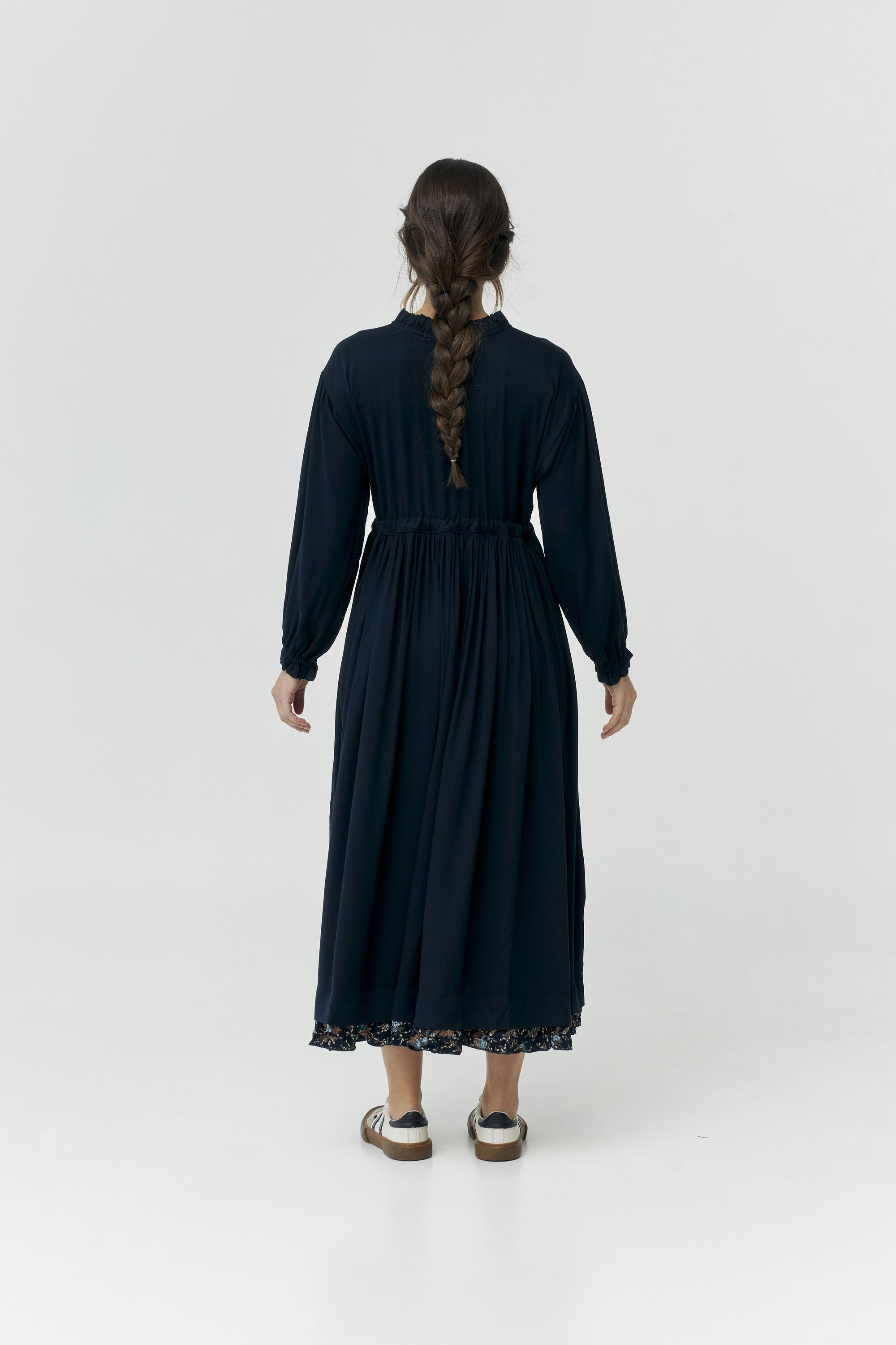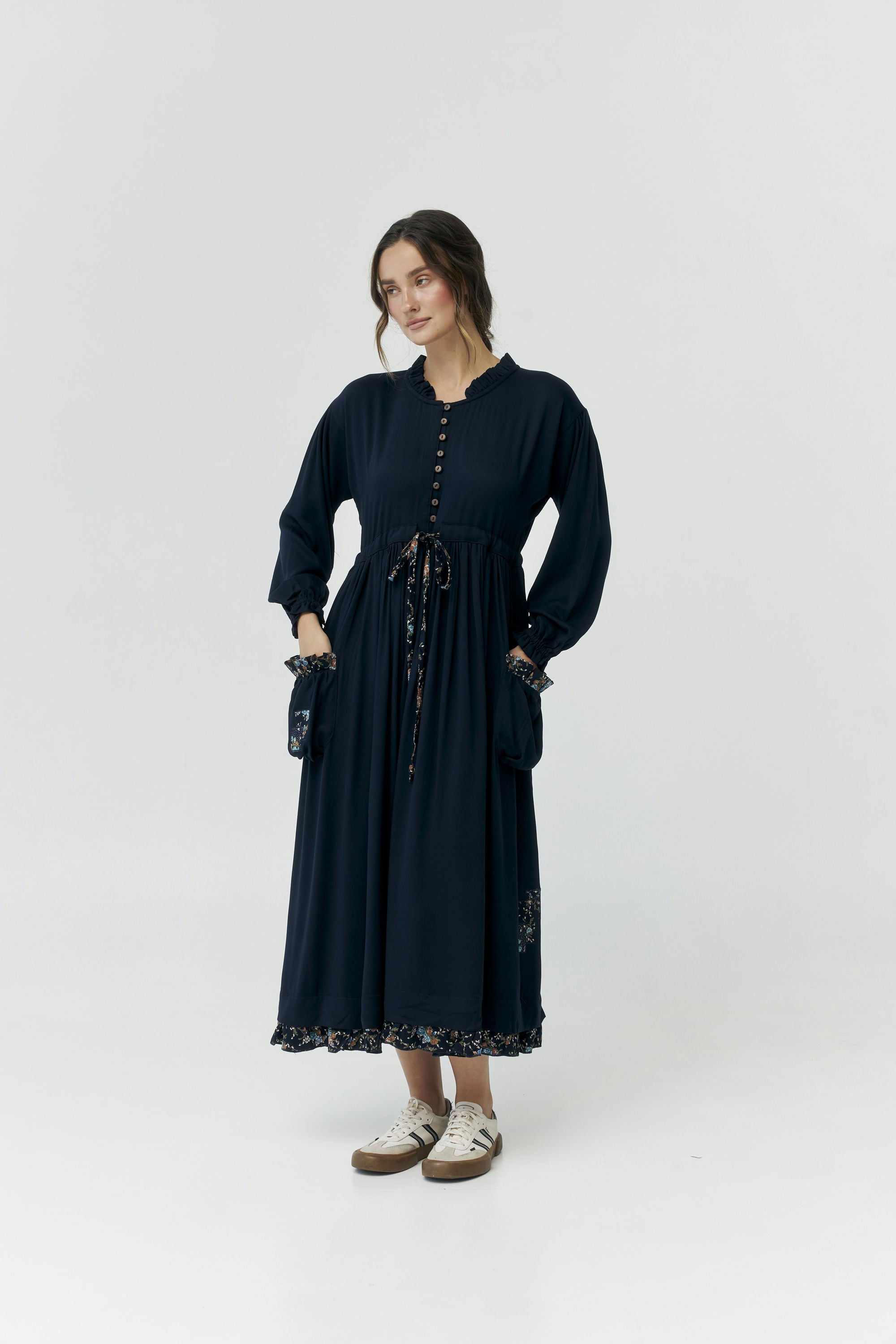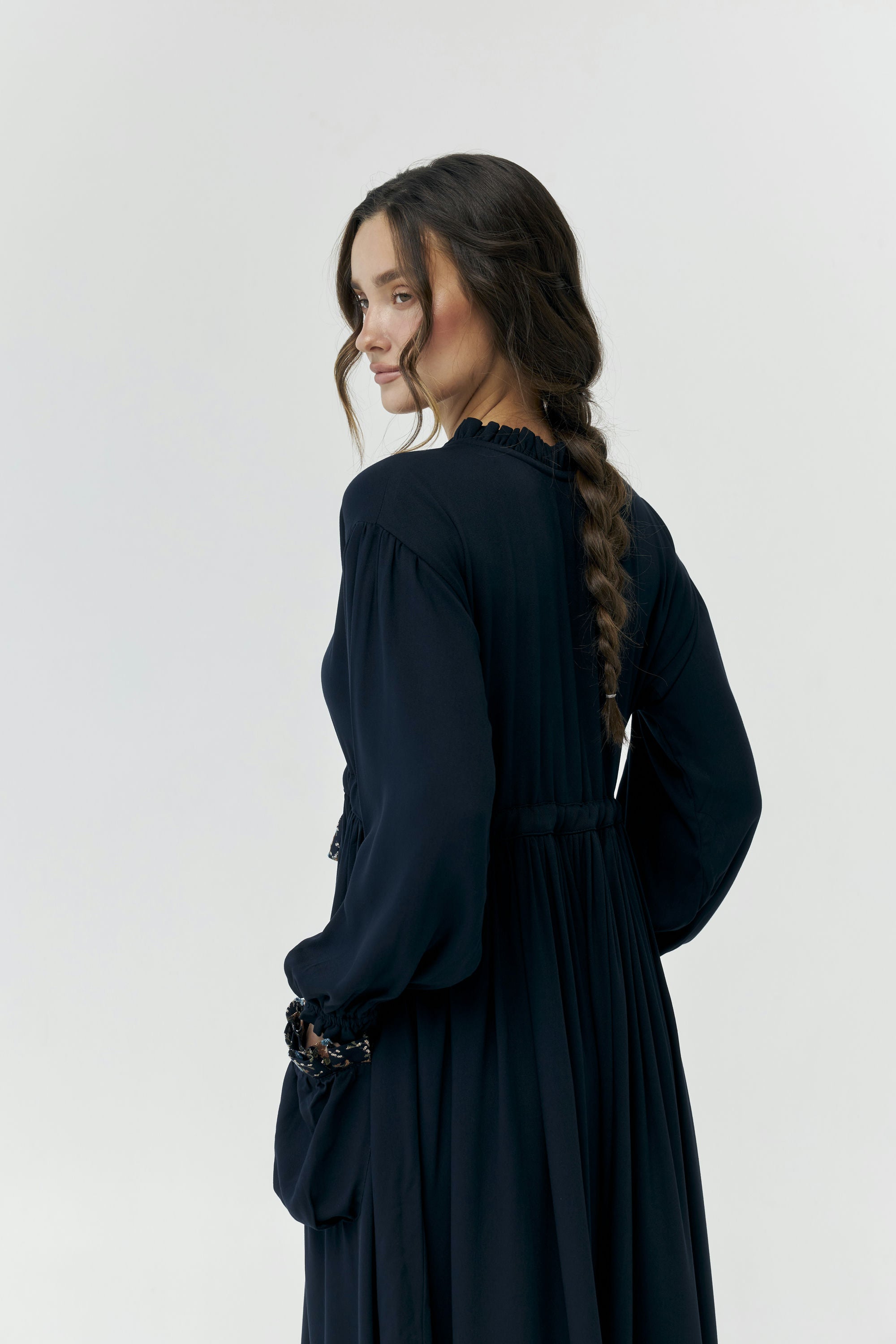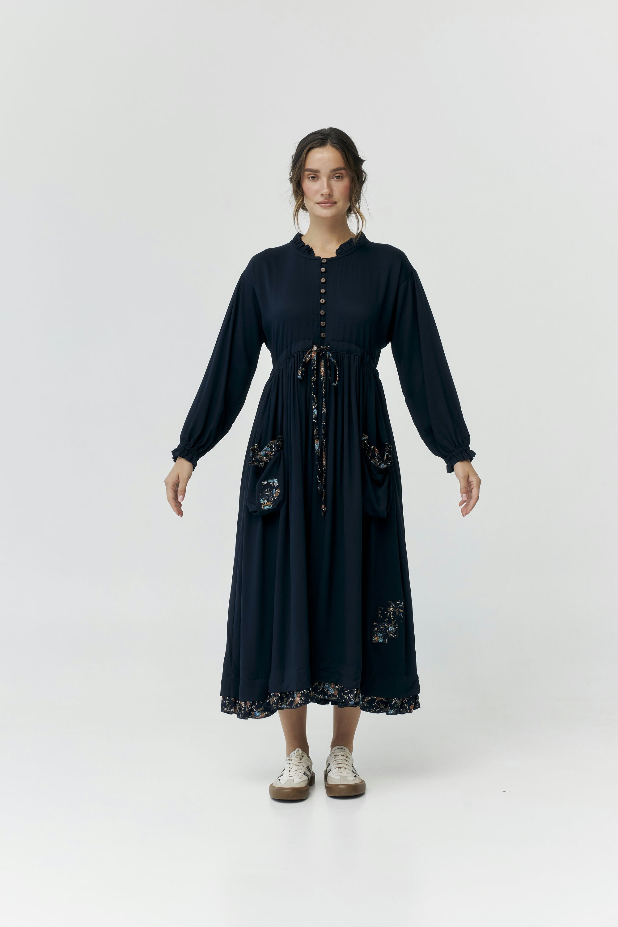 Платье миди с длинными объемными рукавами и ластовицей. Платье имеет пояс-кулиску по линии талии и планку на пуговицах. Воротник, подол и карманы платья отделаны принтованной вискозой. На карманах, рукавах и спинке платье имеет декоративные лоскутки. Цвет лоскутков и отделки может изменяться, сохраняя цветовую гамму и художественную целостность. Ткань - вискоза.