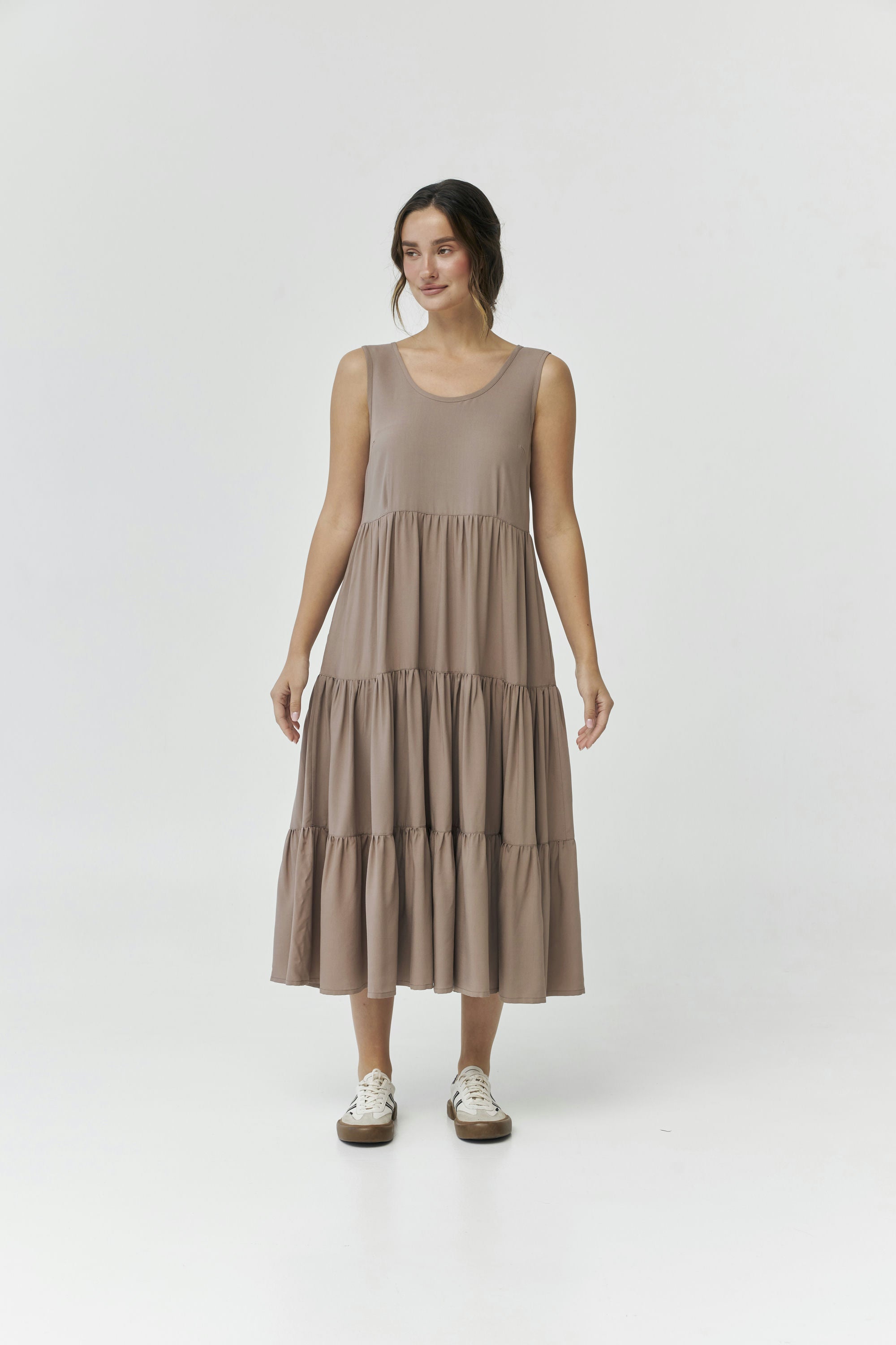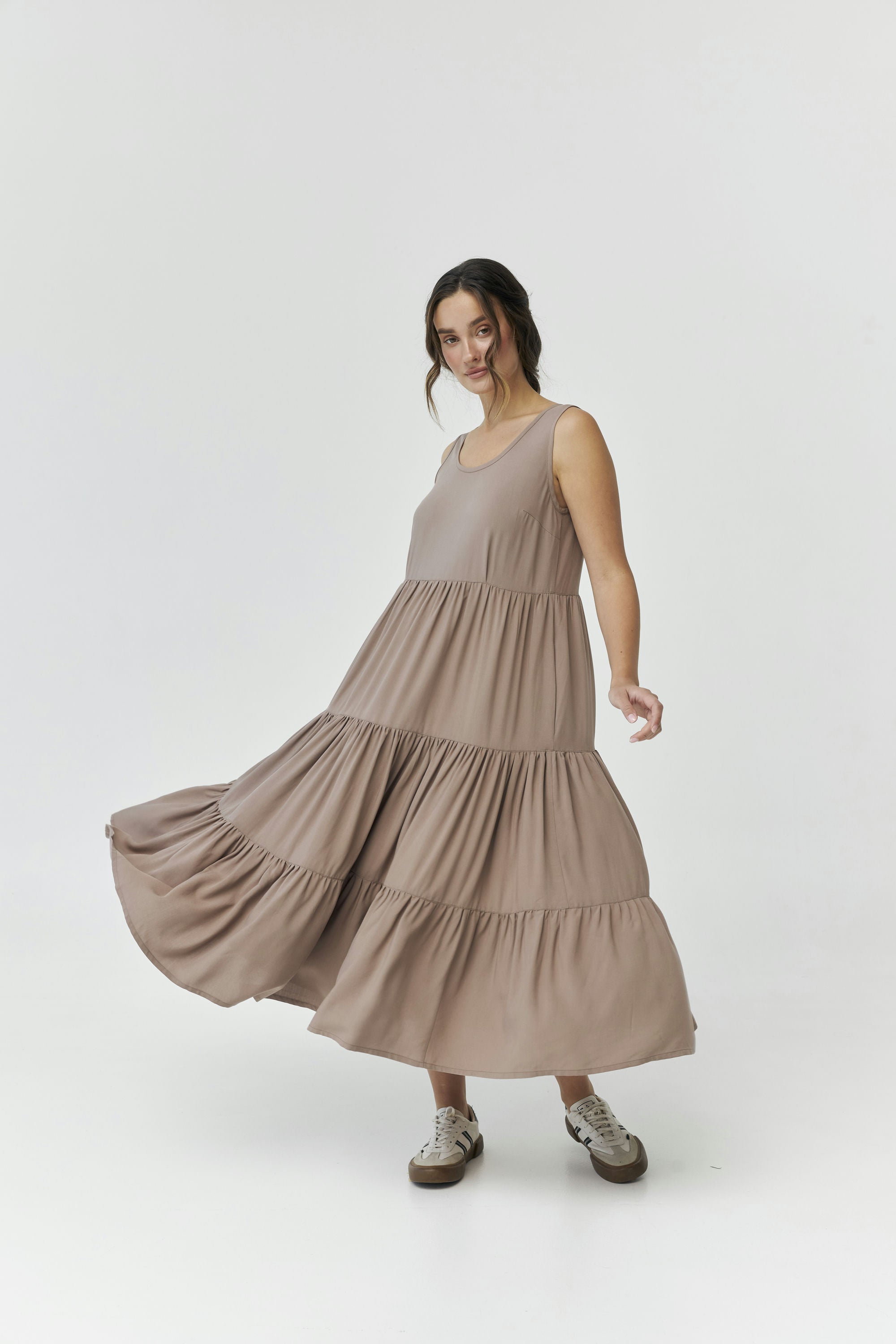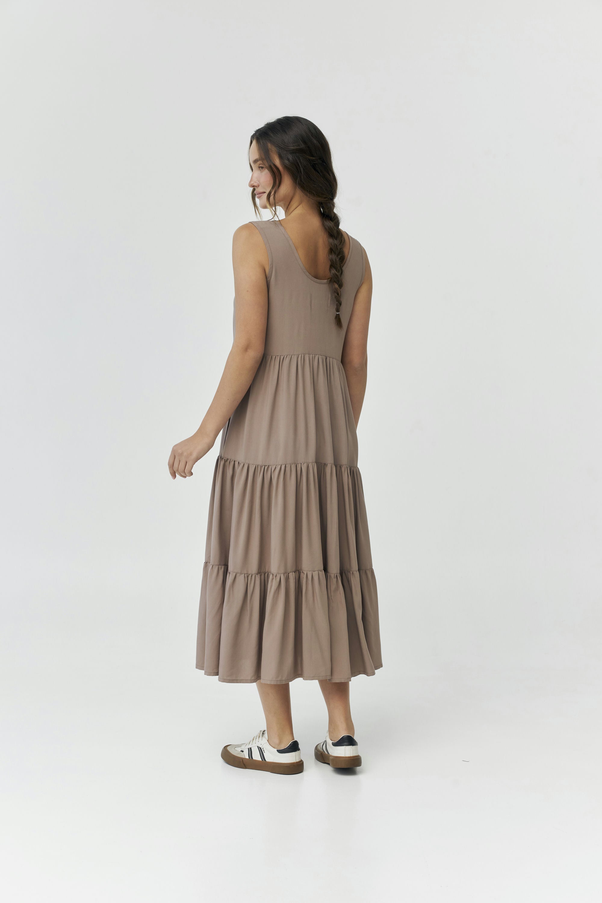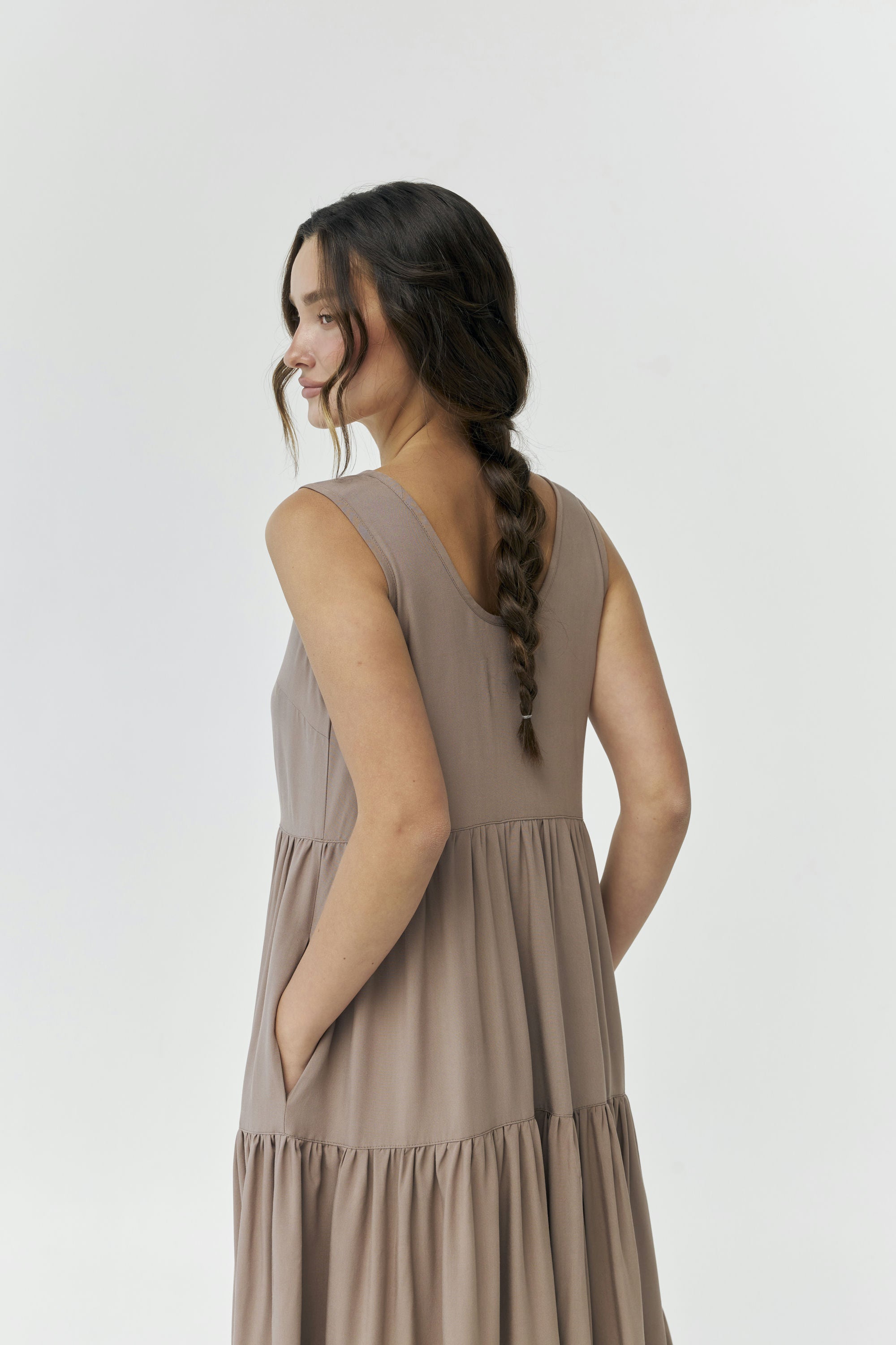 Сарафан миди, свободного кроя ярусами с кокеткой над грудью. Окружность подола 4.5 метра. Ткань 100% вискоза.