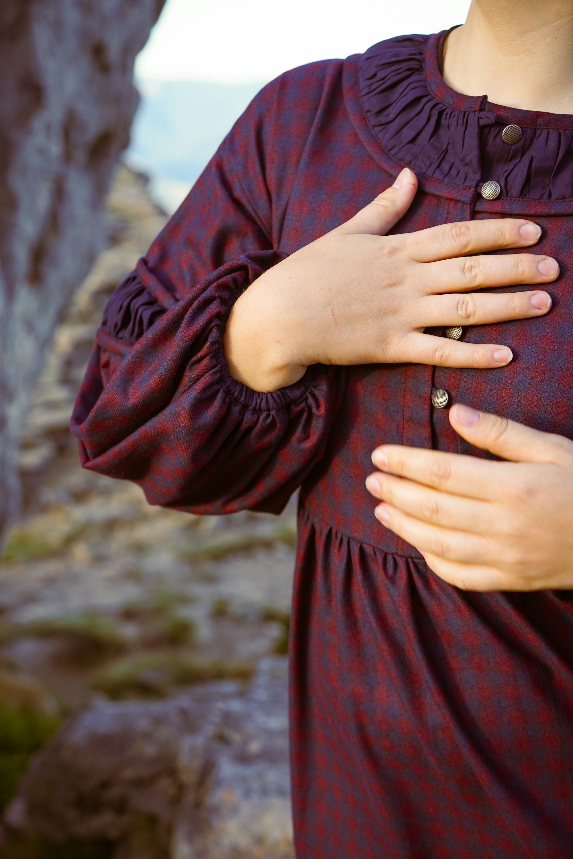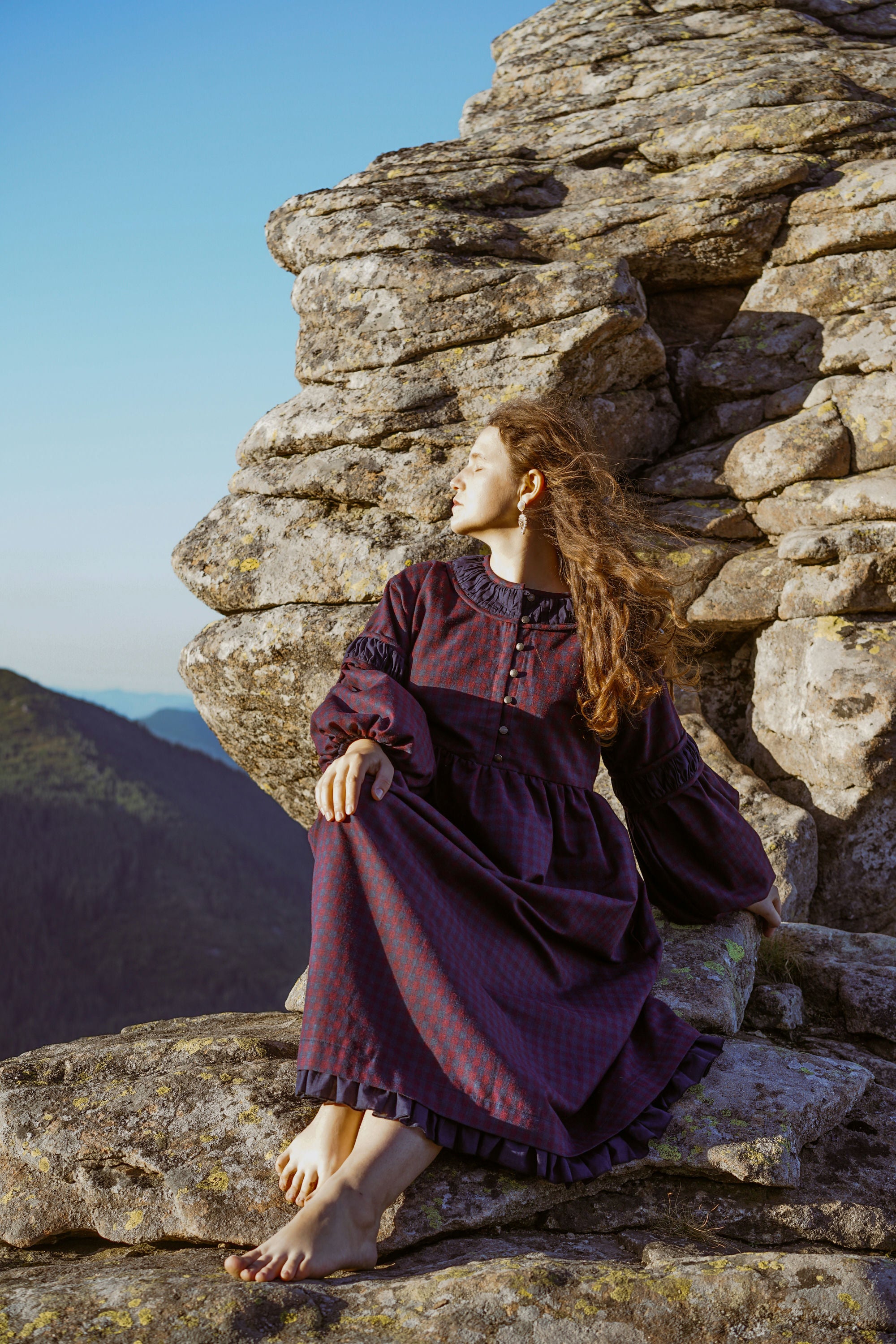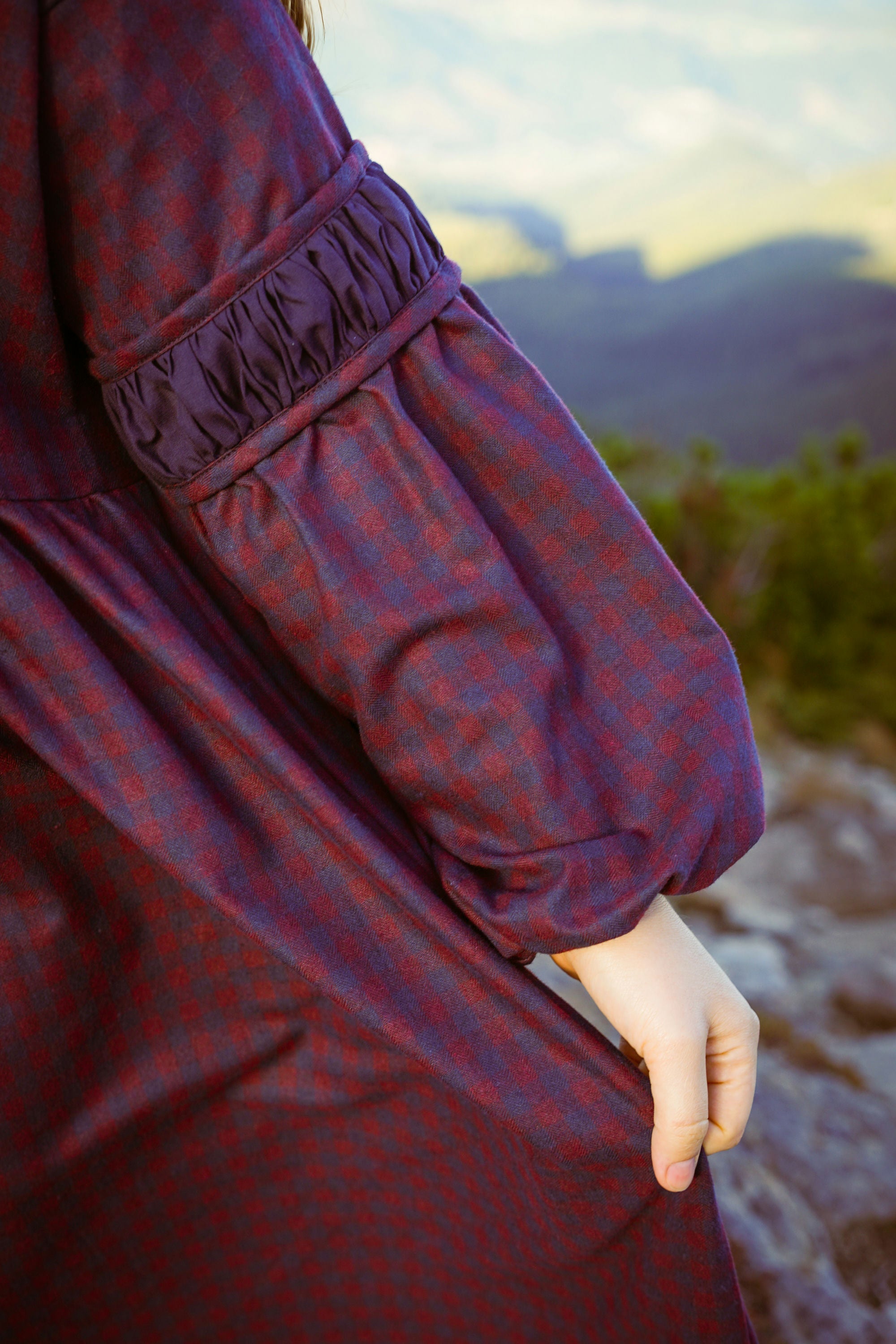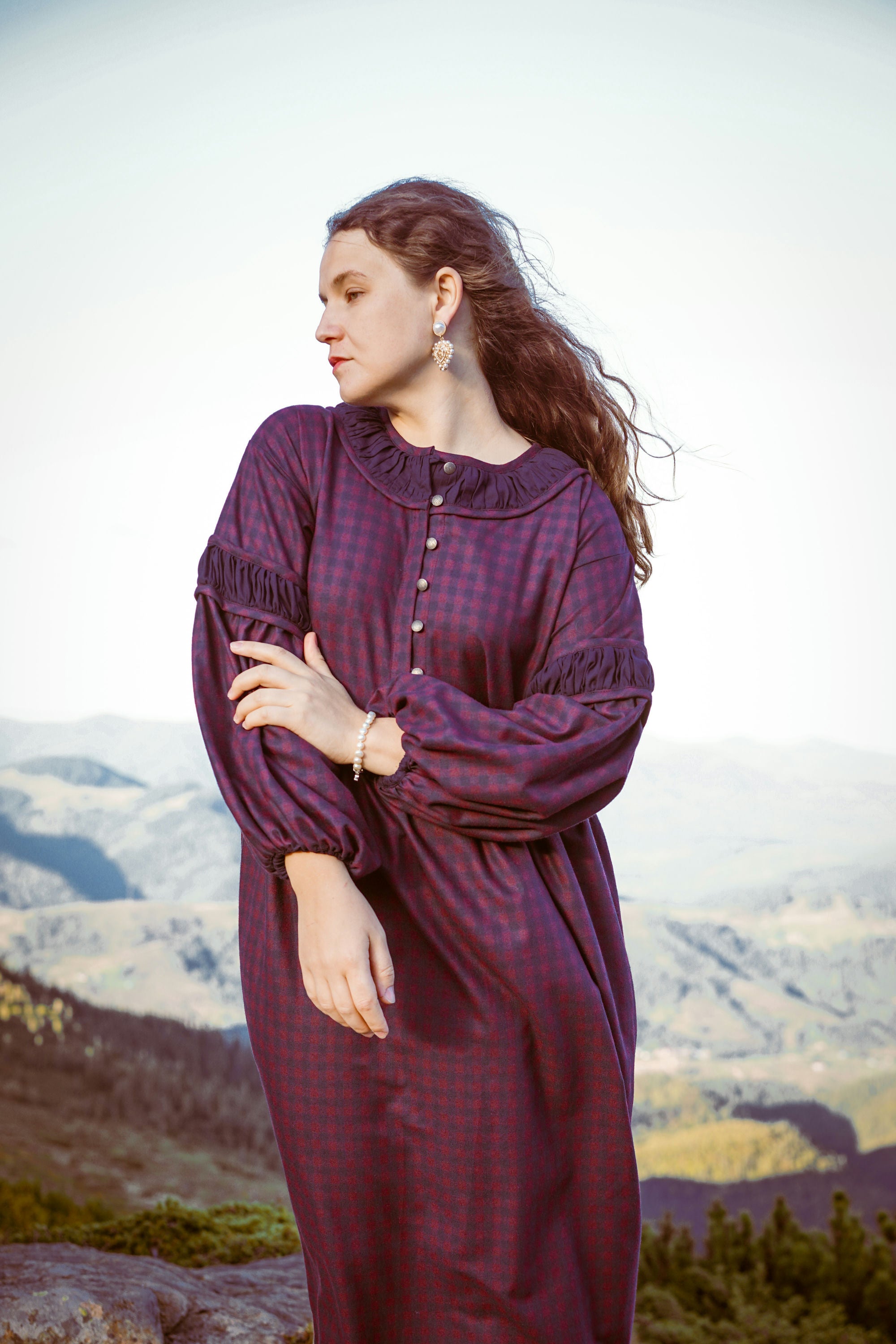 Теплое платье миди из хлопковой фланели с завышенной талией, кокеткой на пуговицах и карманами. С пышным длинным рукавом и ластовицей. Вырез горловины и рукава украшены батистом. Материал фланель и батист.
