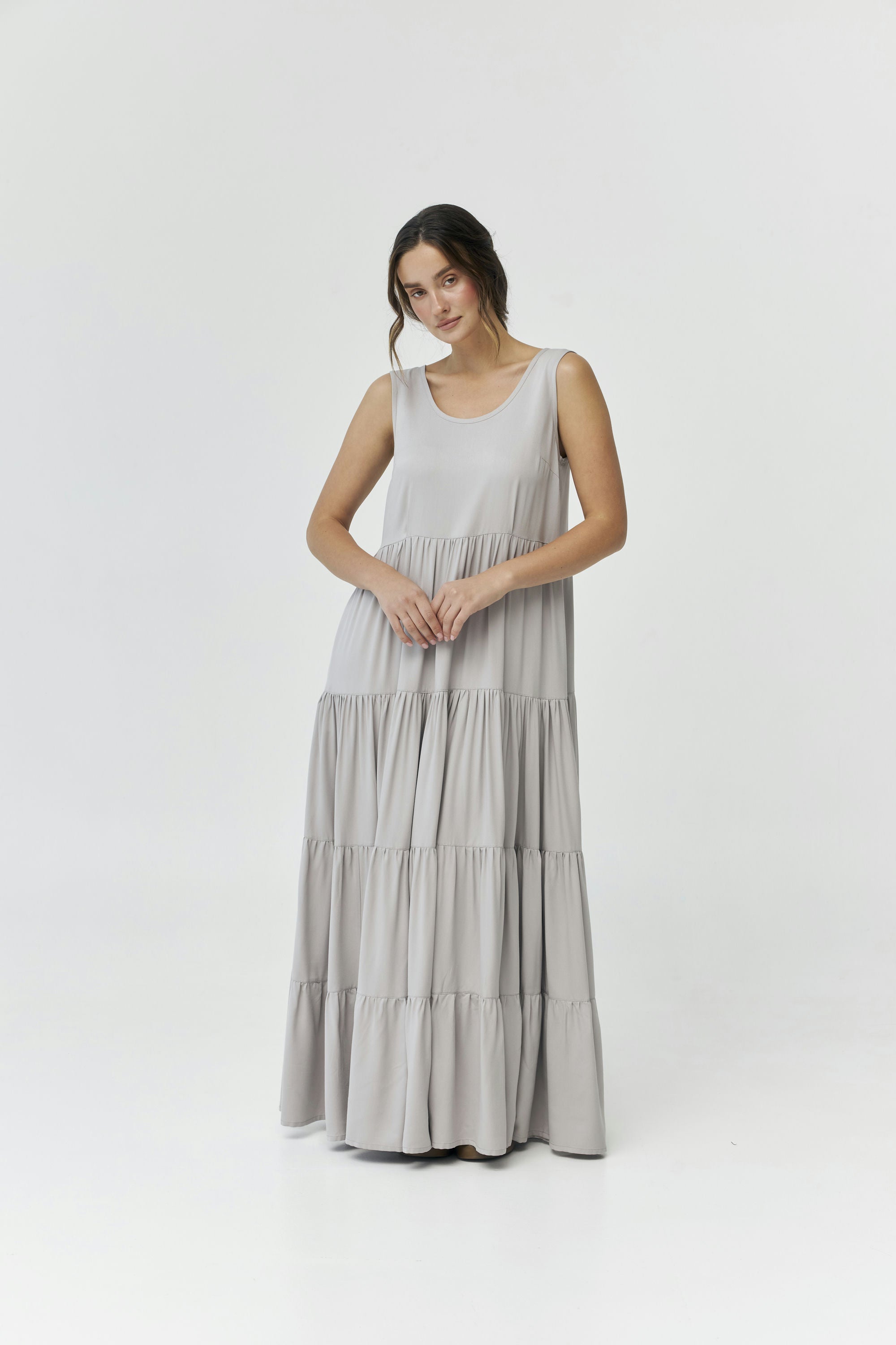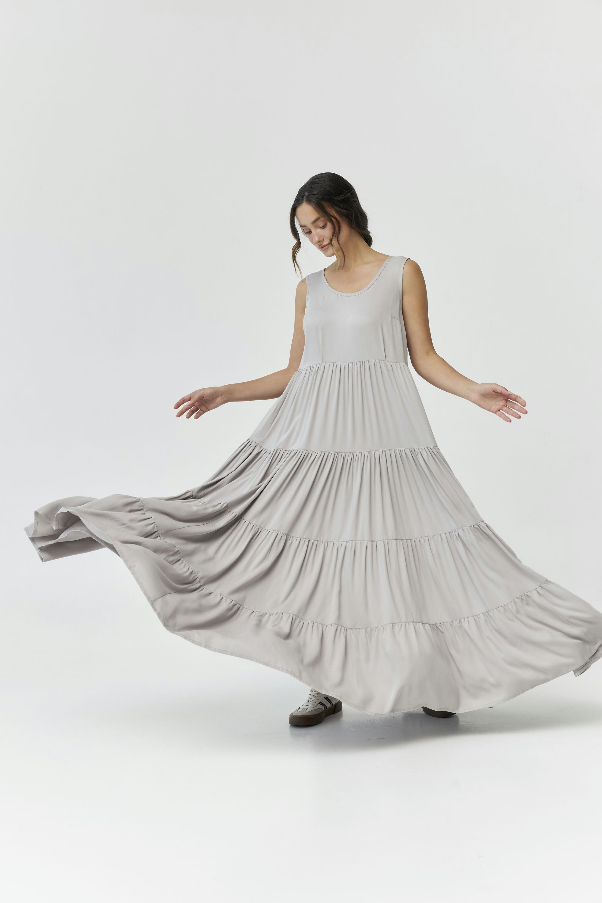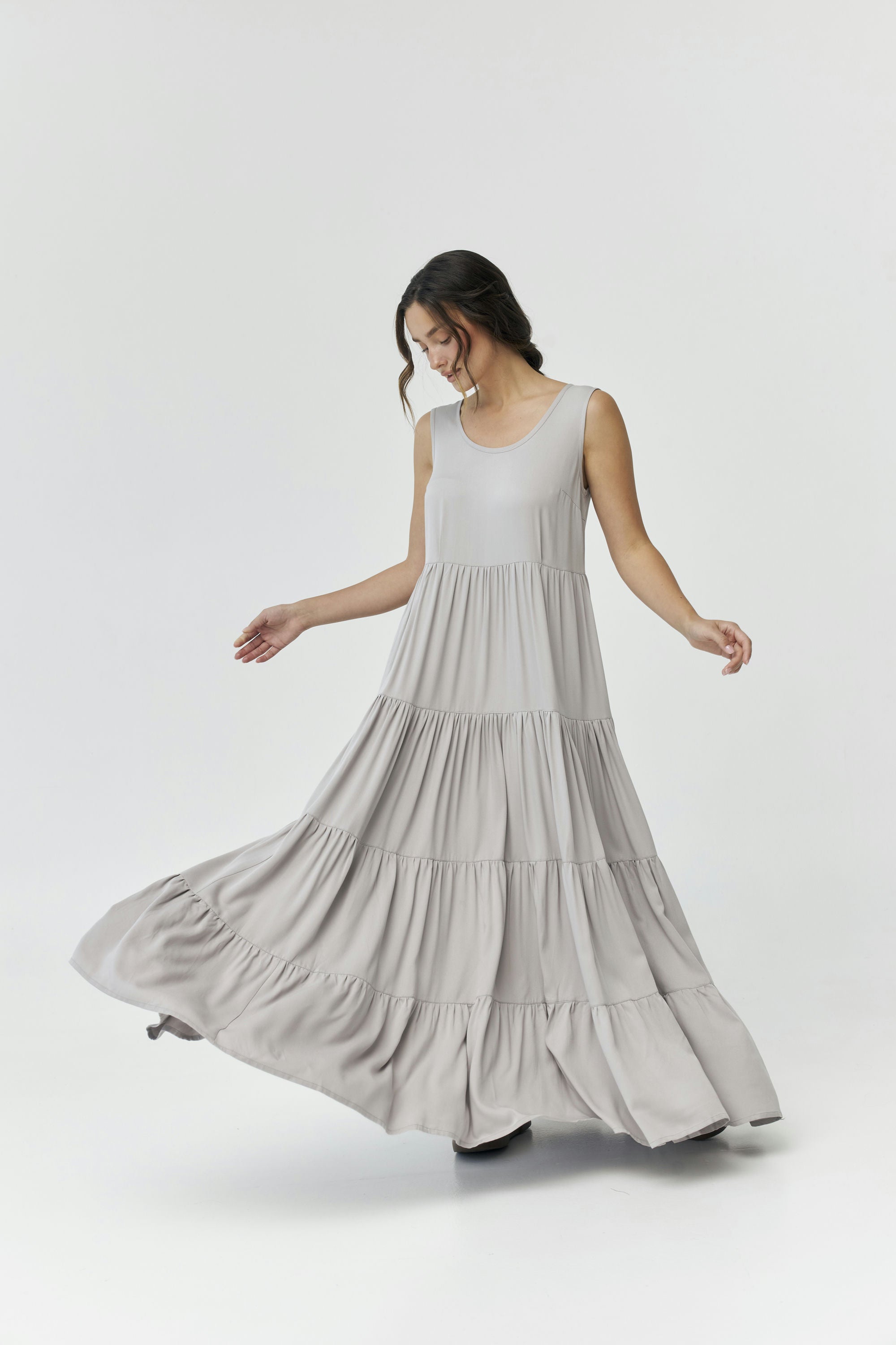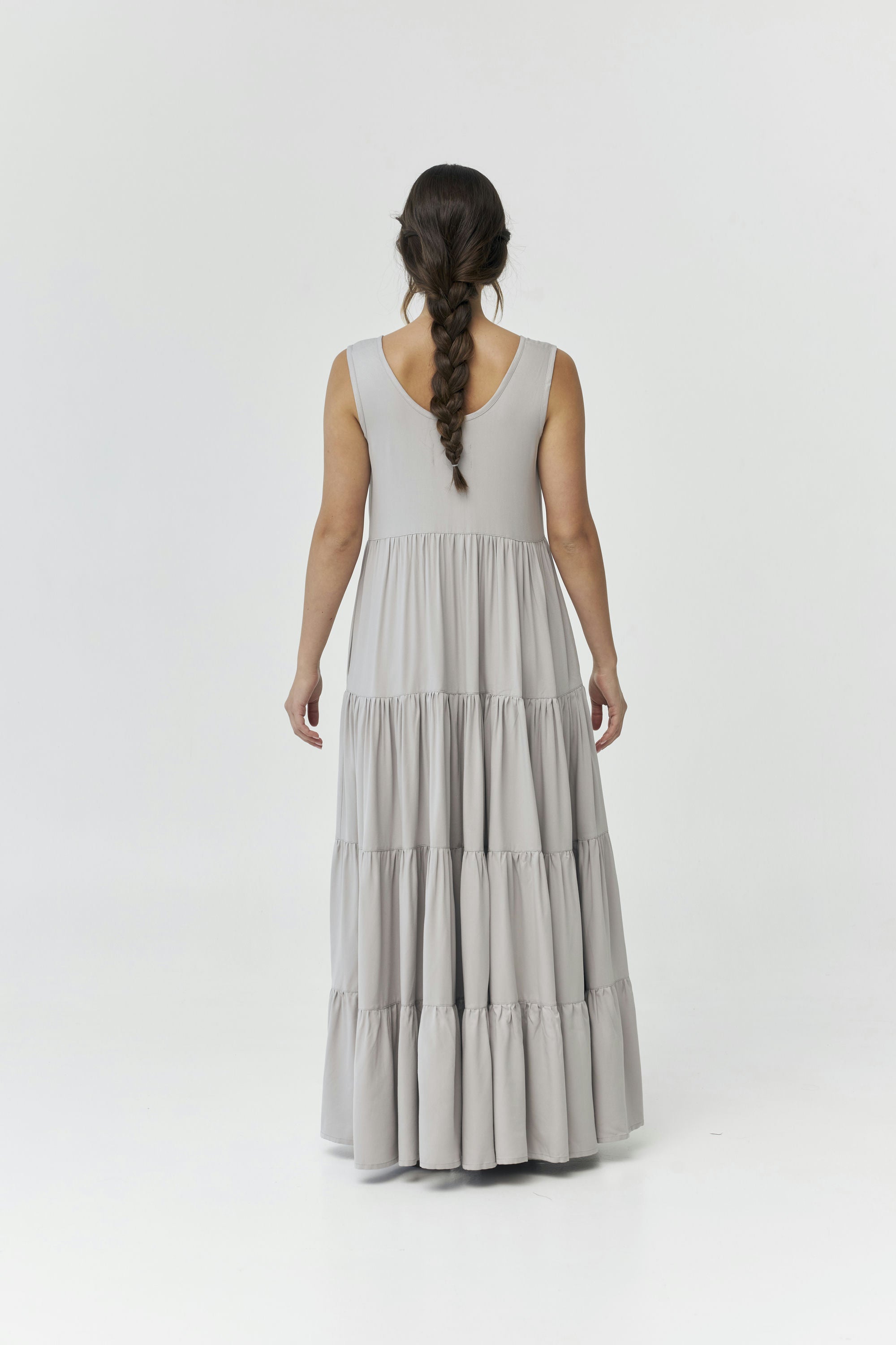 Длинный сарафан свободного кроя ярусами с кокеткой над грудью. Окружность подола 6 метров. Ткань 100% вискоза.