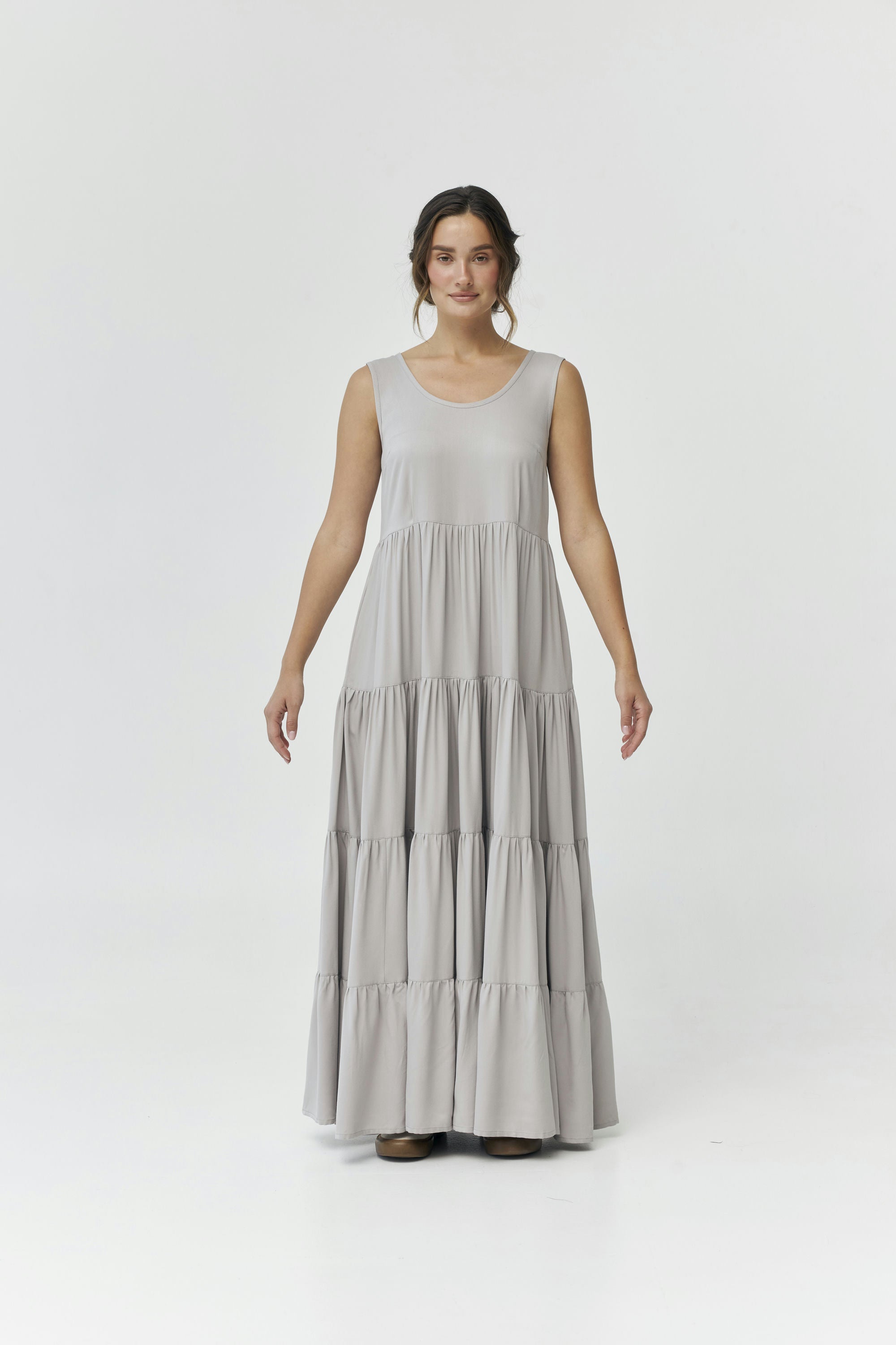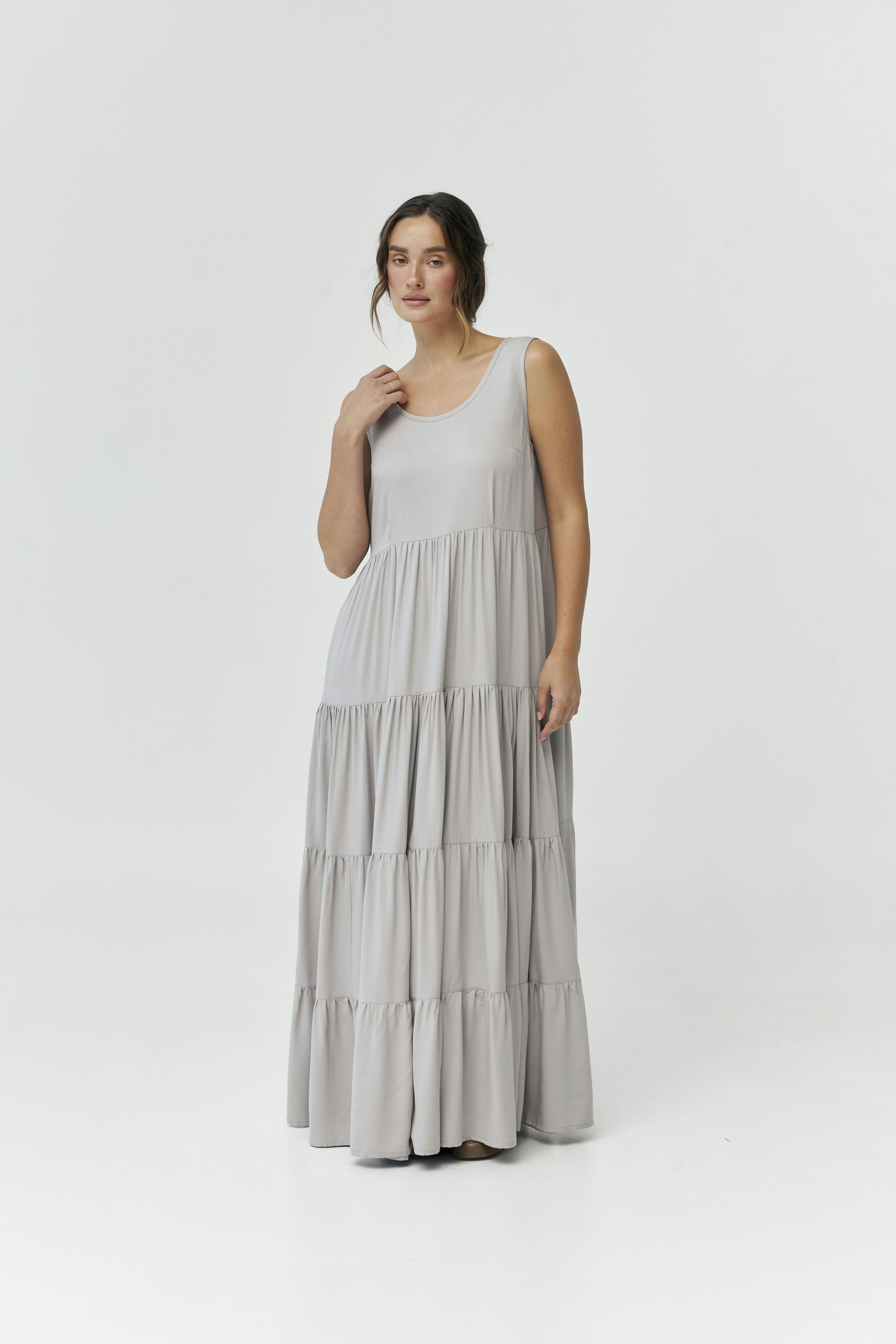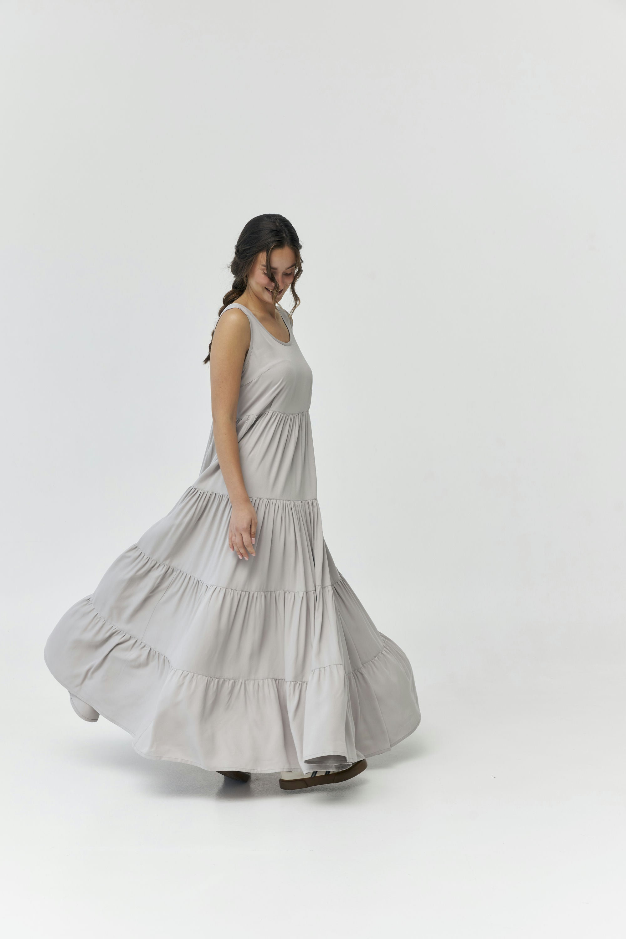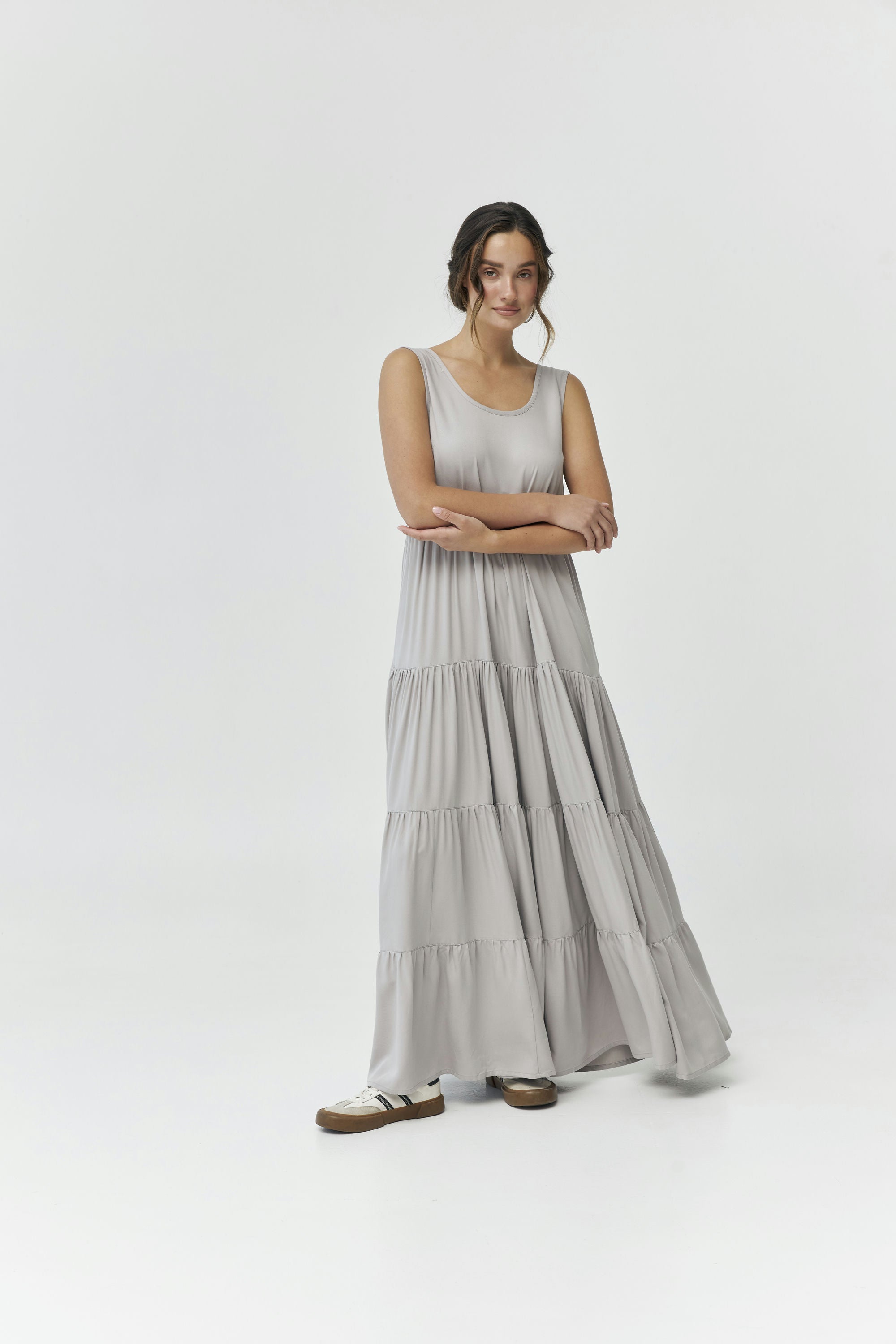 Длинный сарафан свободного кроя ярусами с кокеткой над грудью. Окружность подола 6 метров. Ткань 100% вискоза.