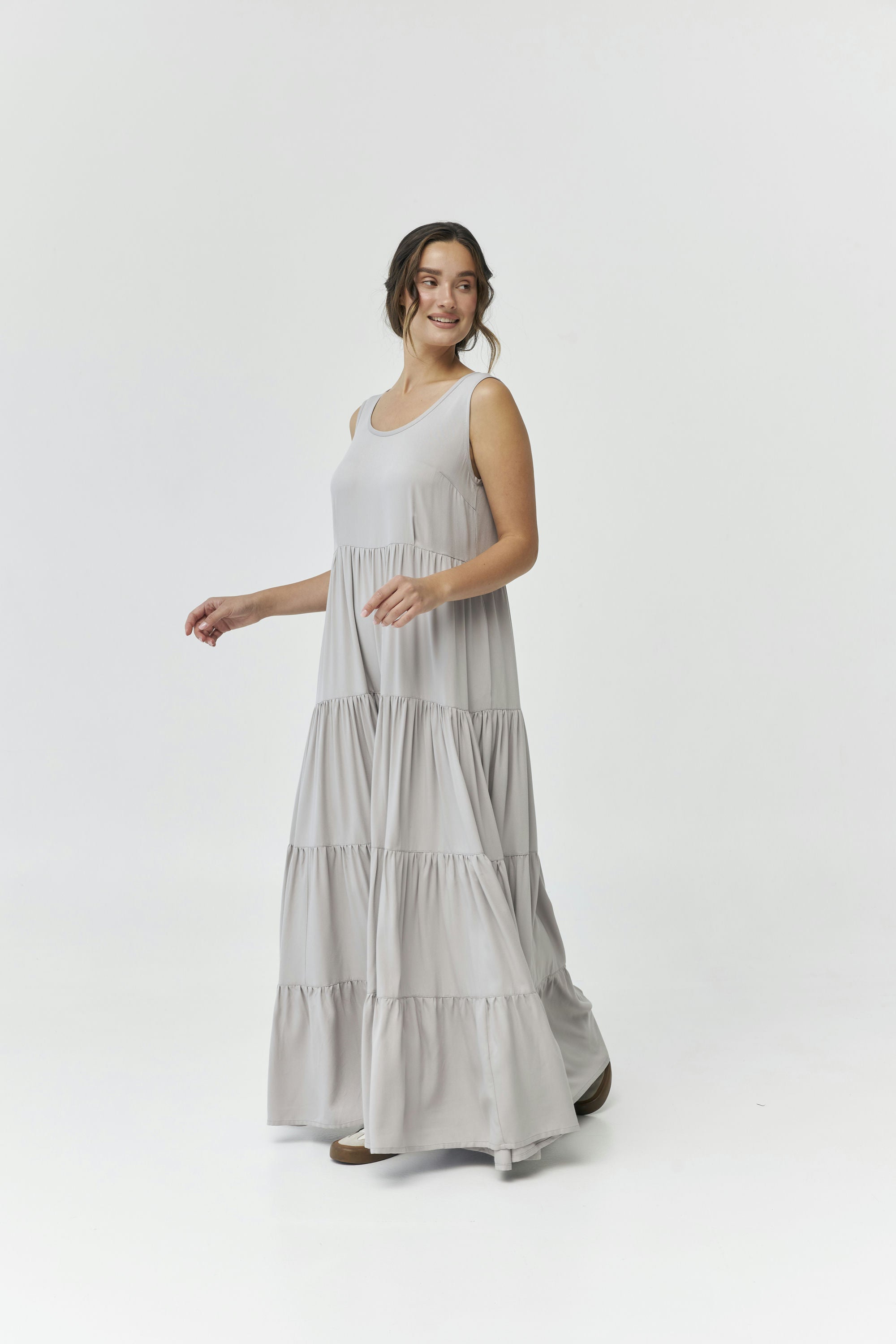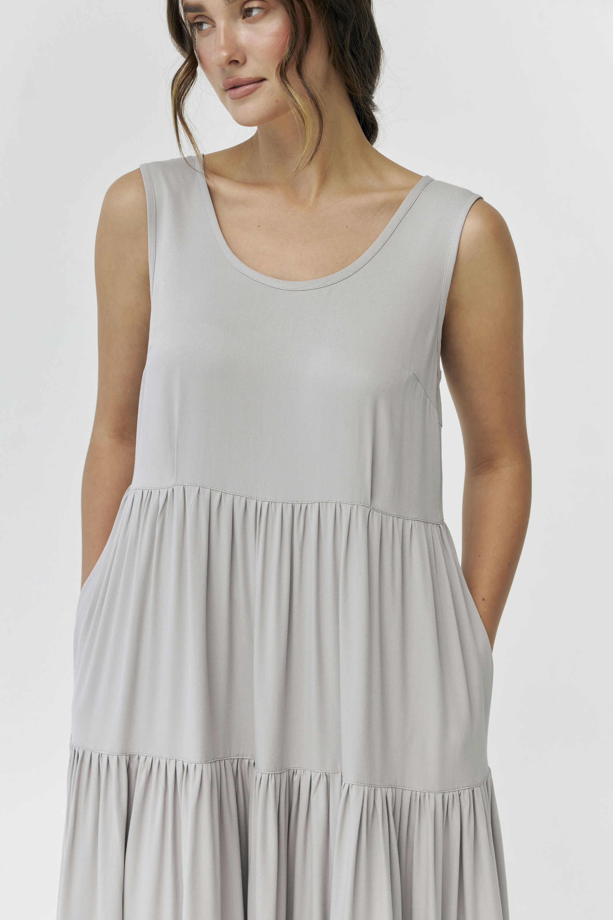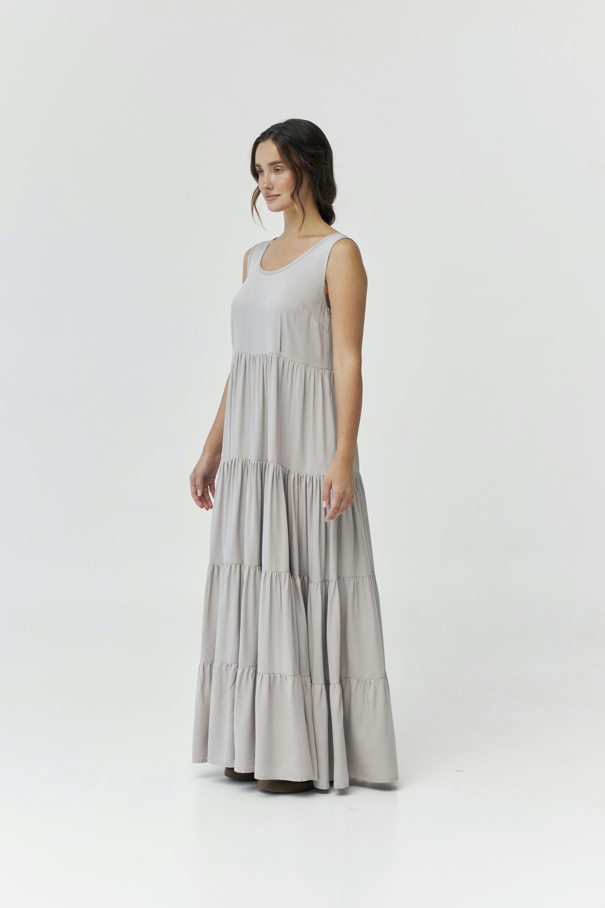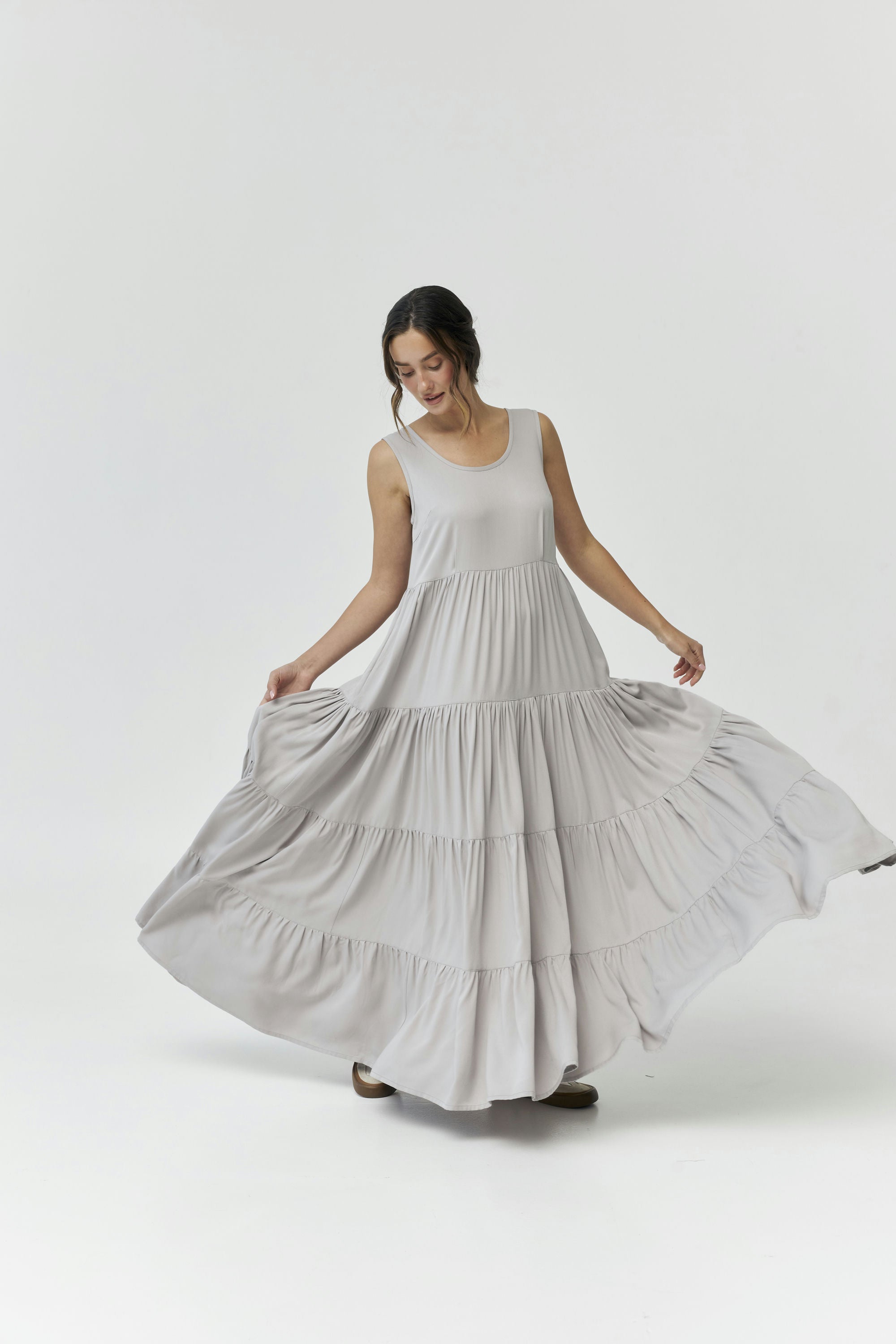 Длинный сарафан свободного кроя ярусами с кокеткой над грудью. Окружность подола 6 метров. Ткань 100% вискоза.