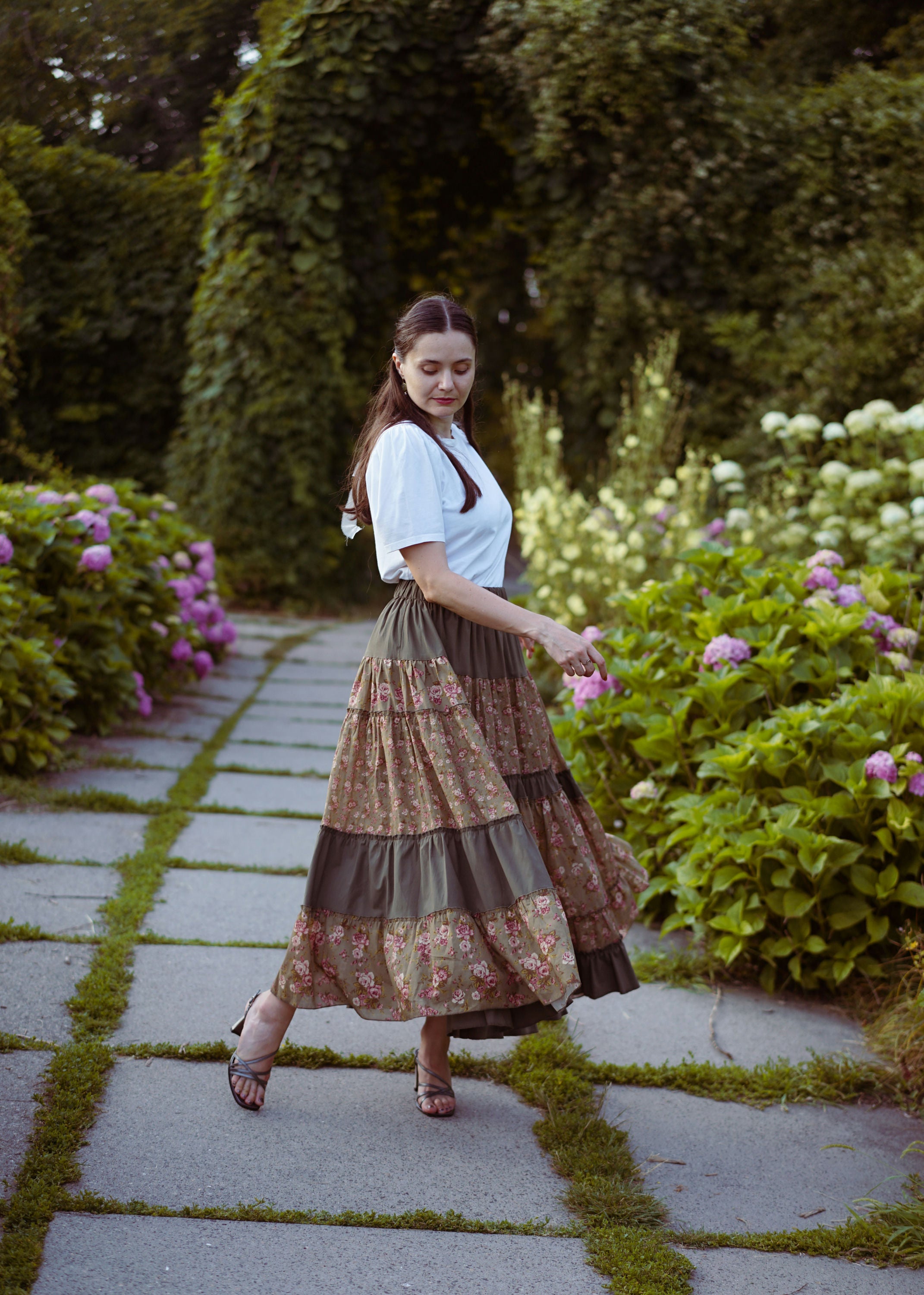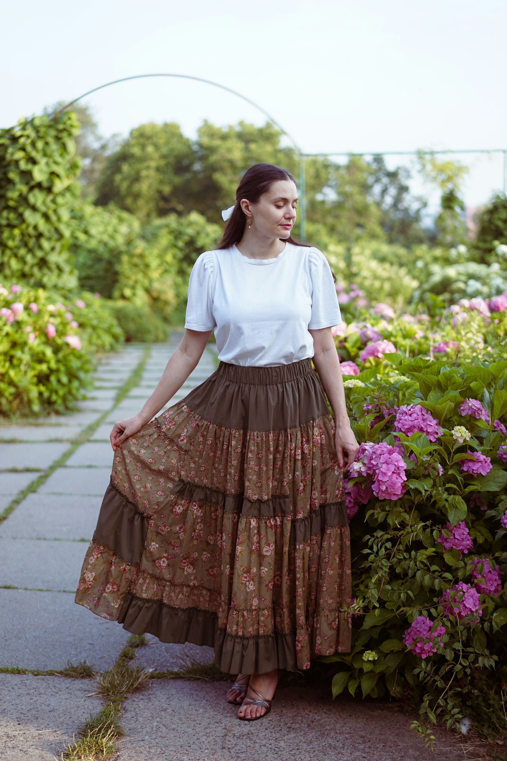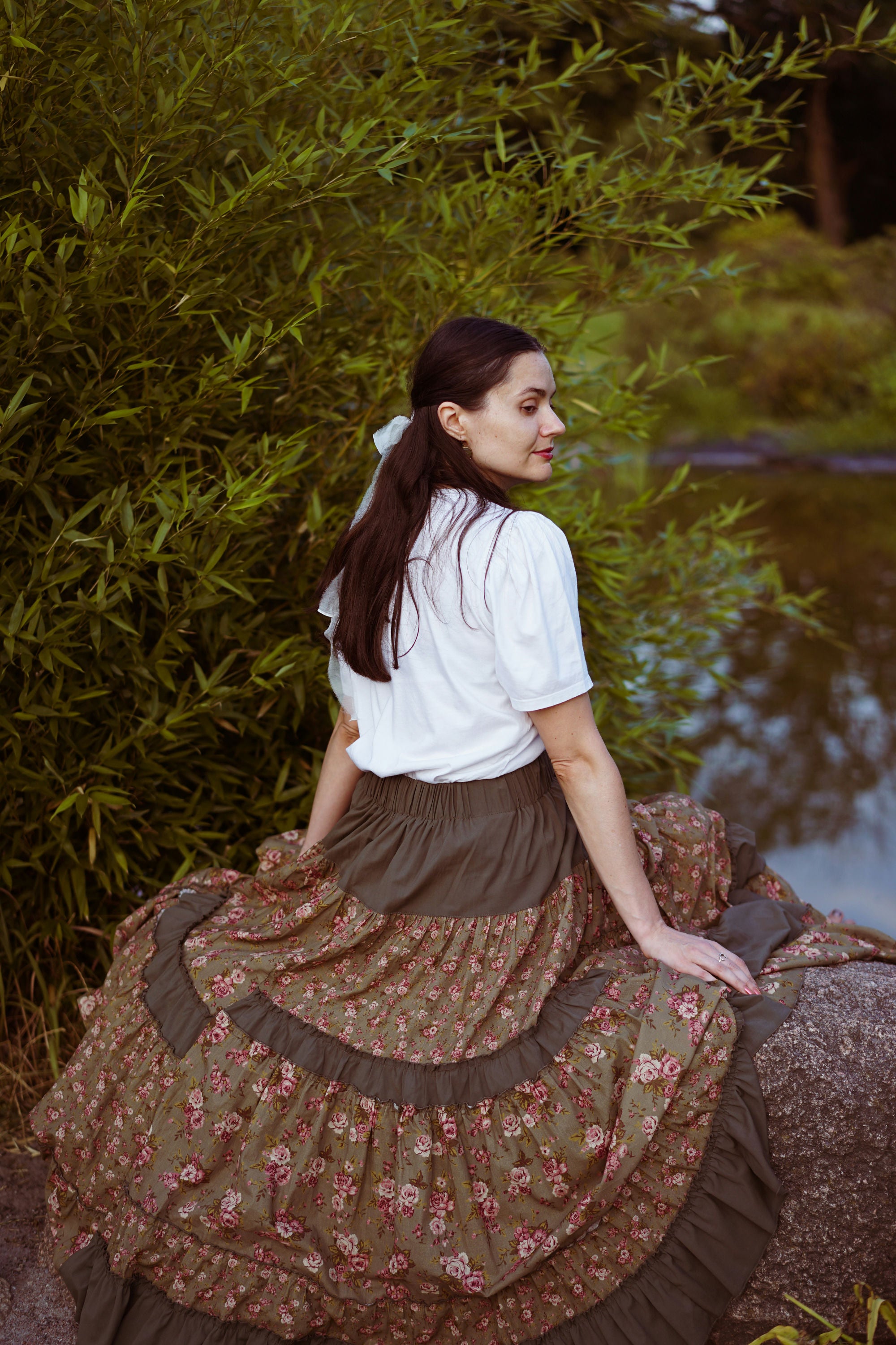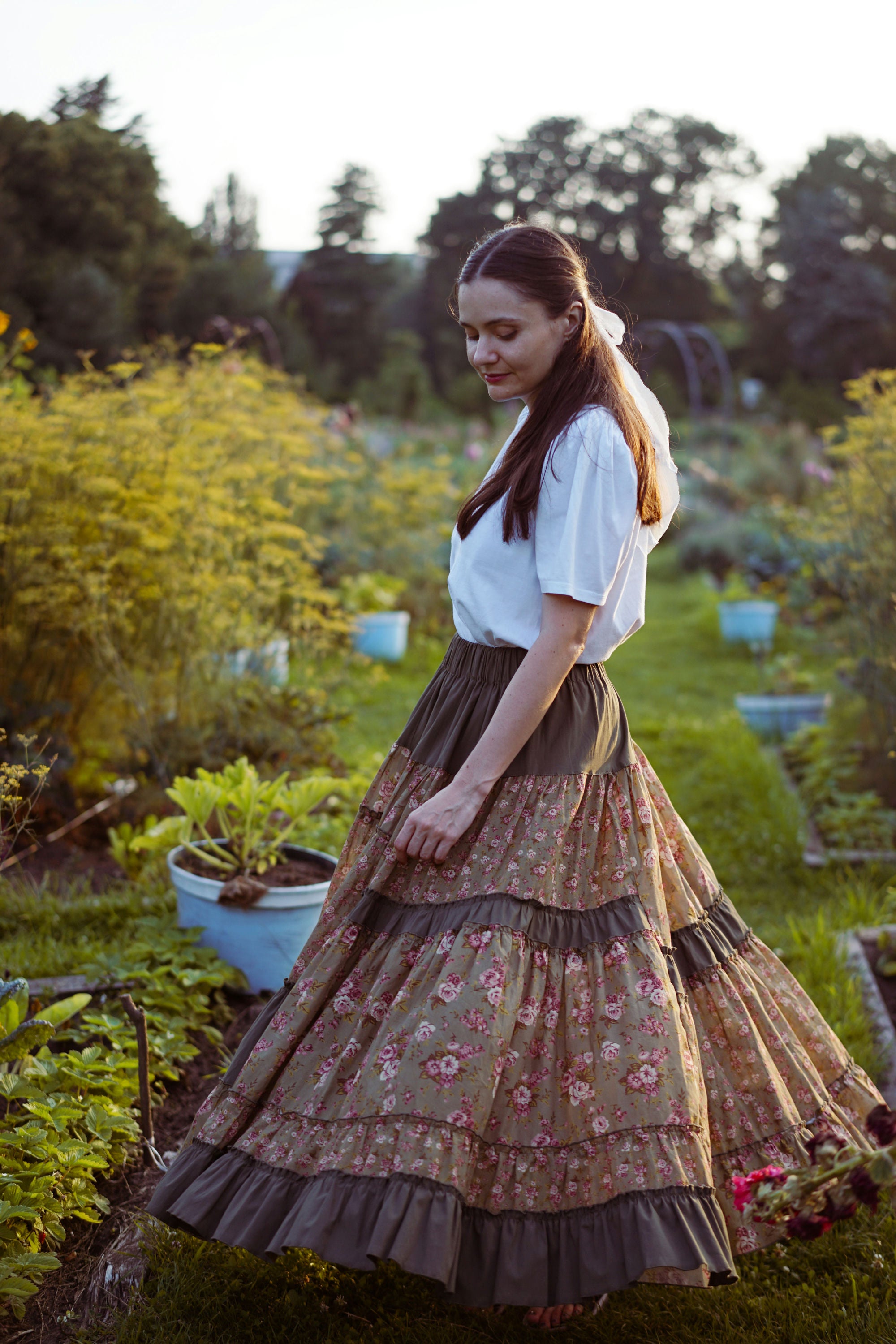 Юбка миди с ярусным кроем и поясом на резинке. Окружность подола — 4 метра. Ткань — батист.