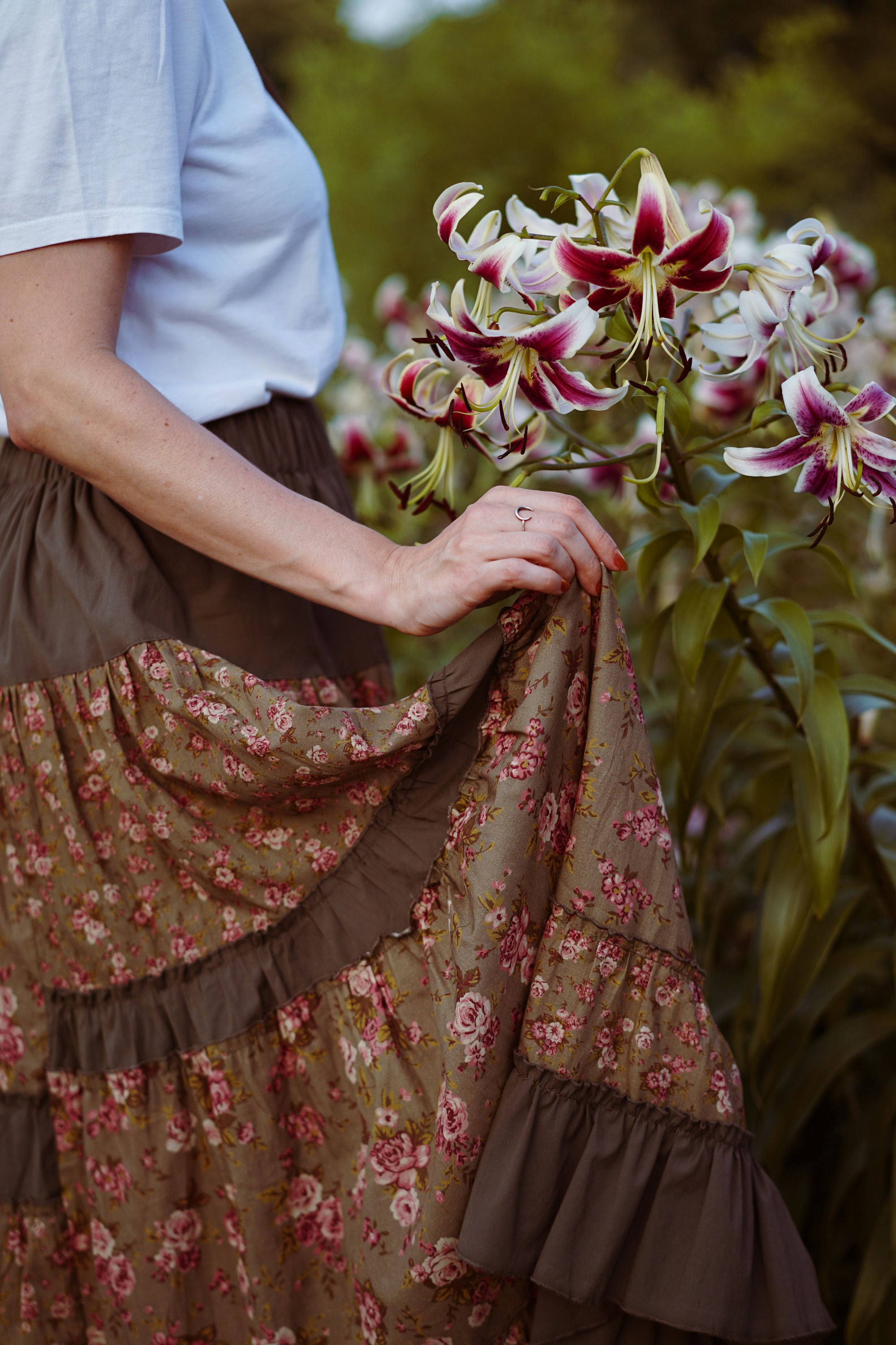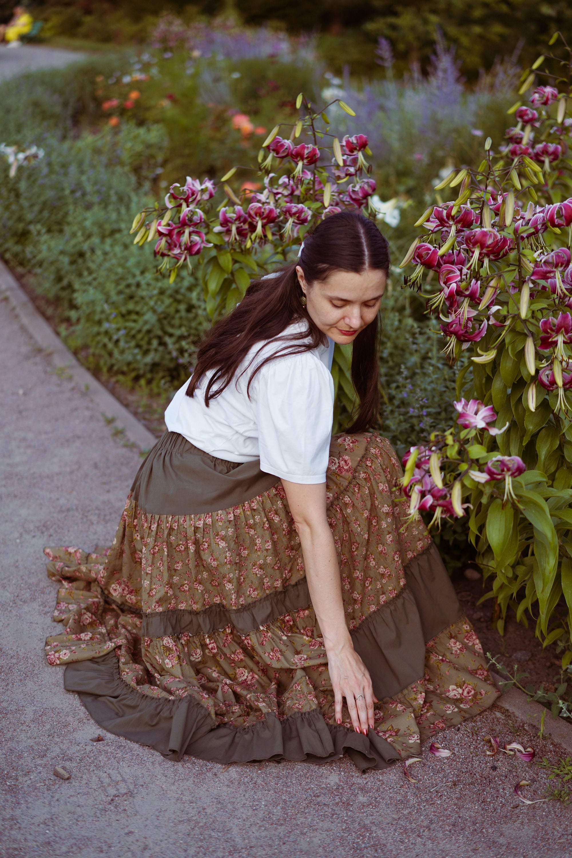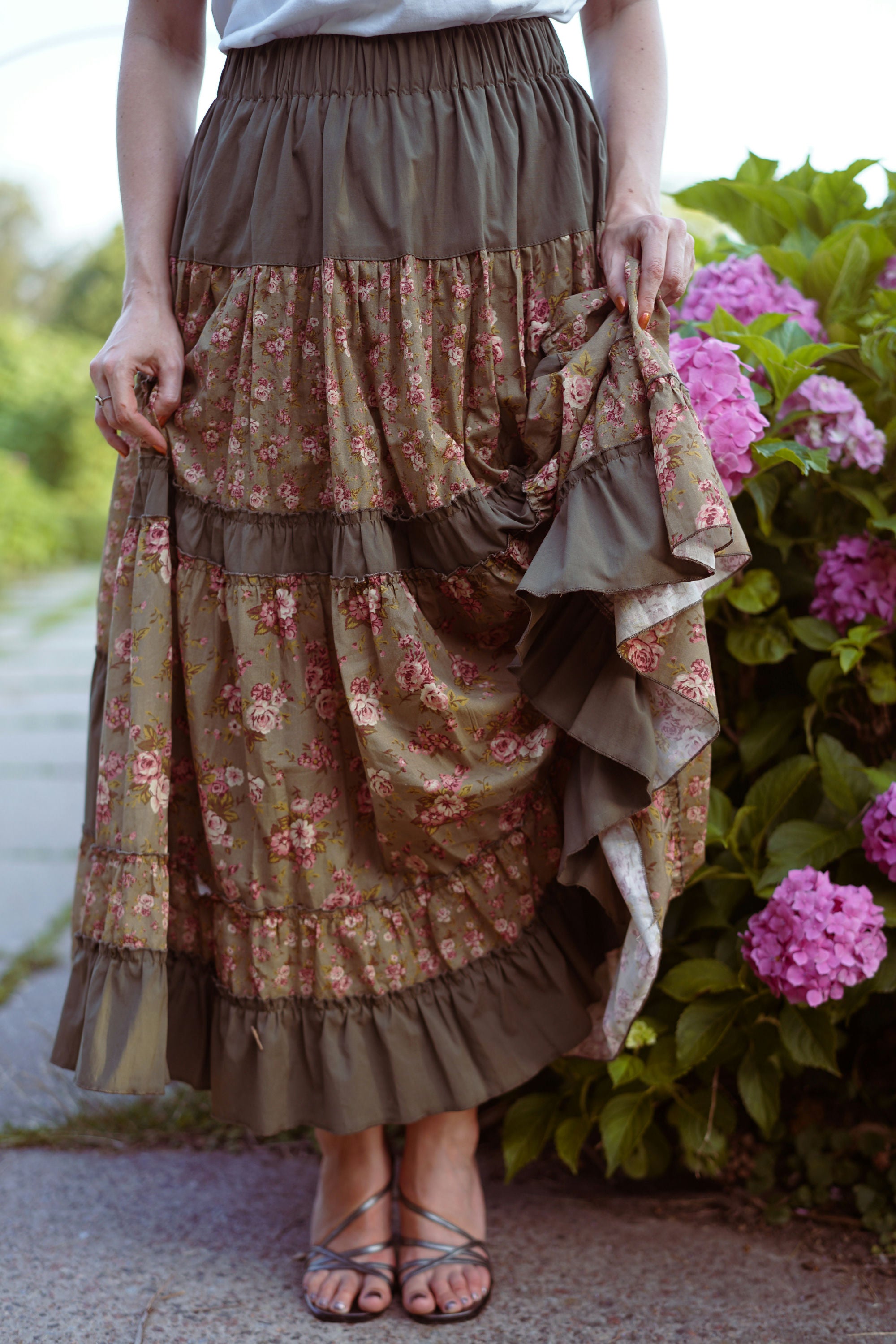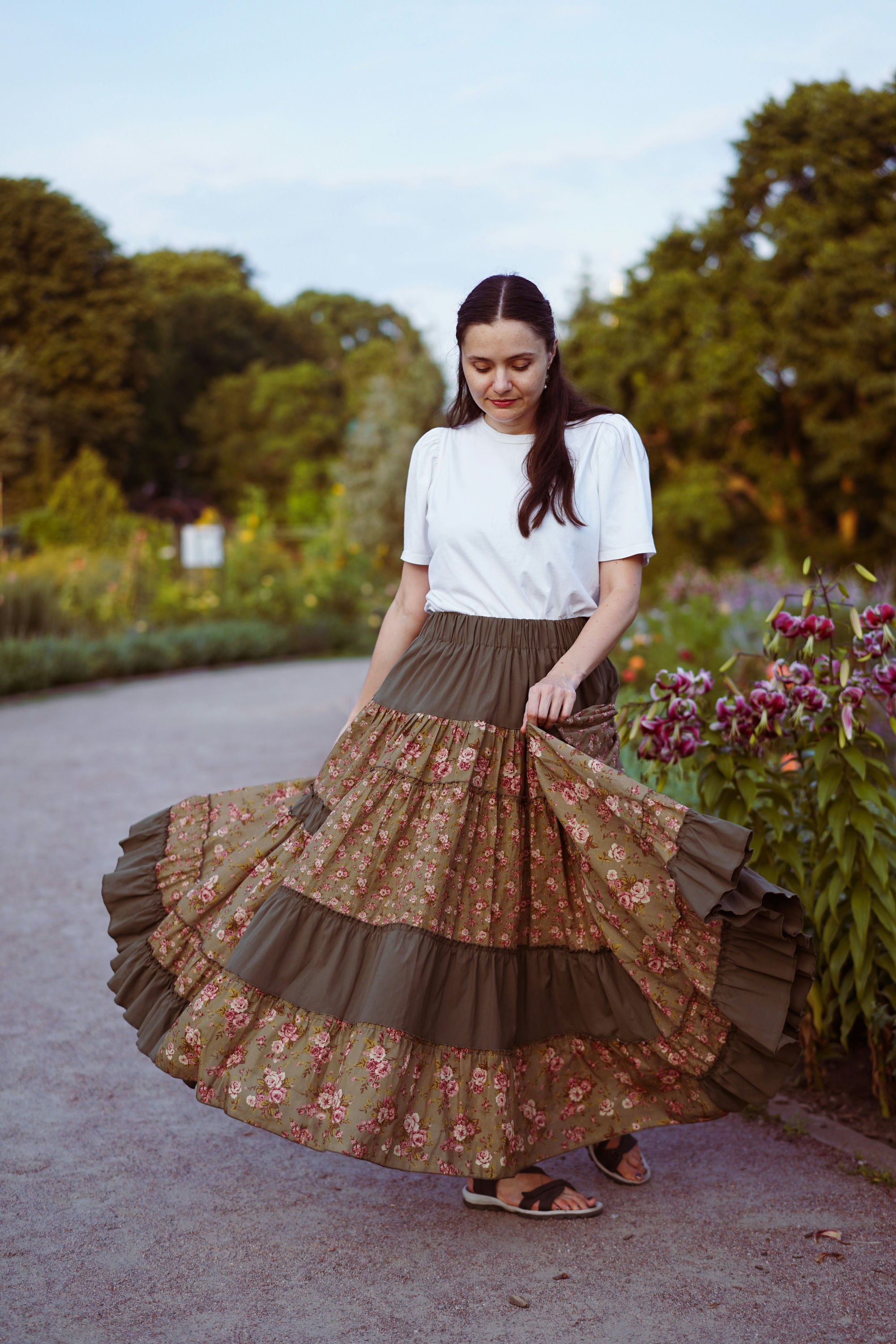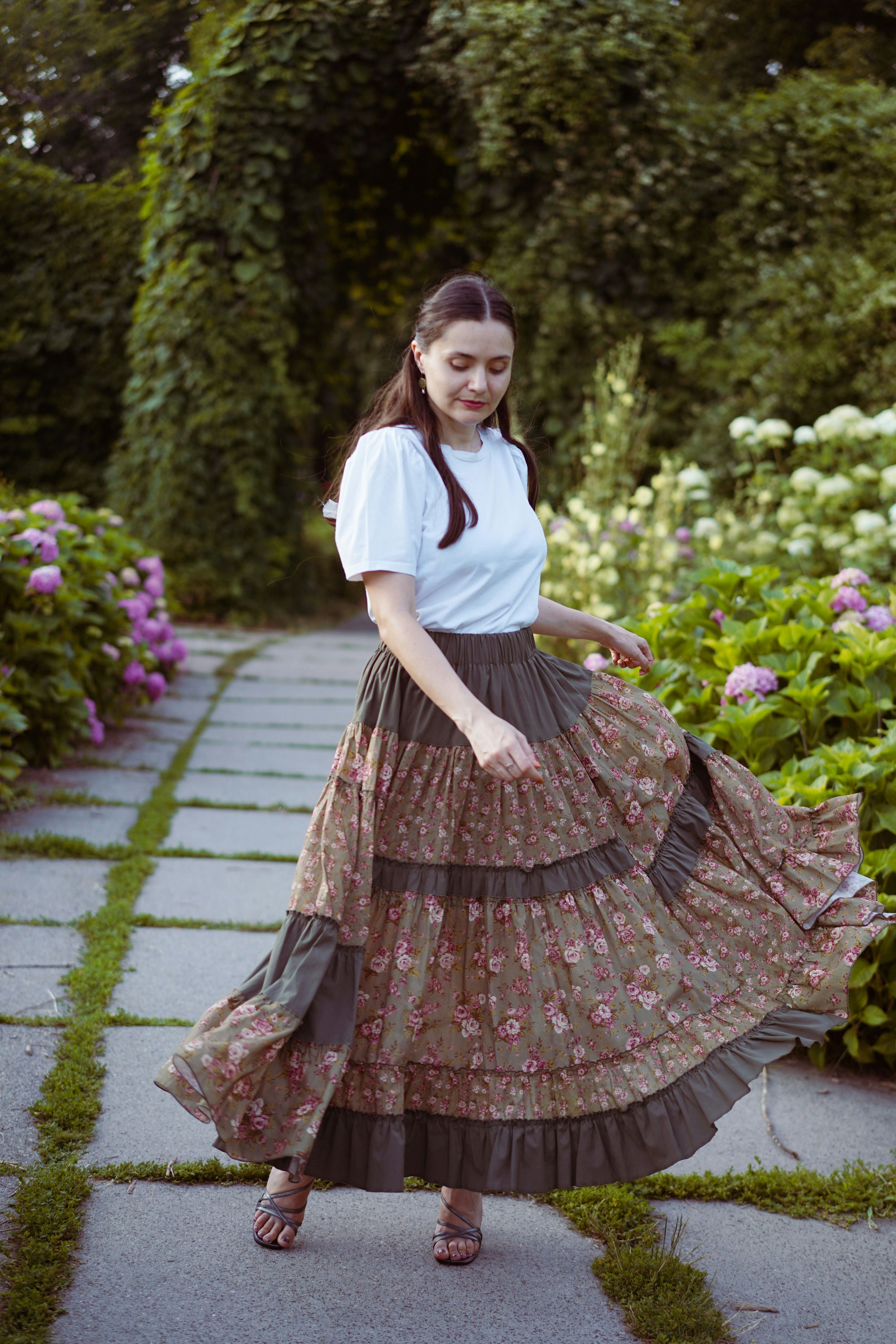 Юбка миди с ярусным кроем и поясом на резинке. Окружность подола — 4 метра. Ткань — батист.