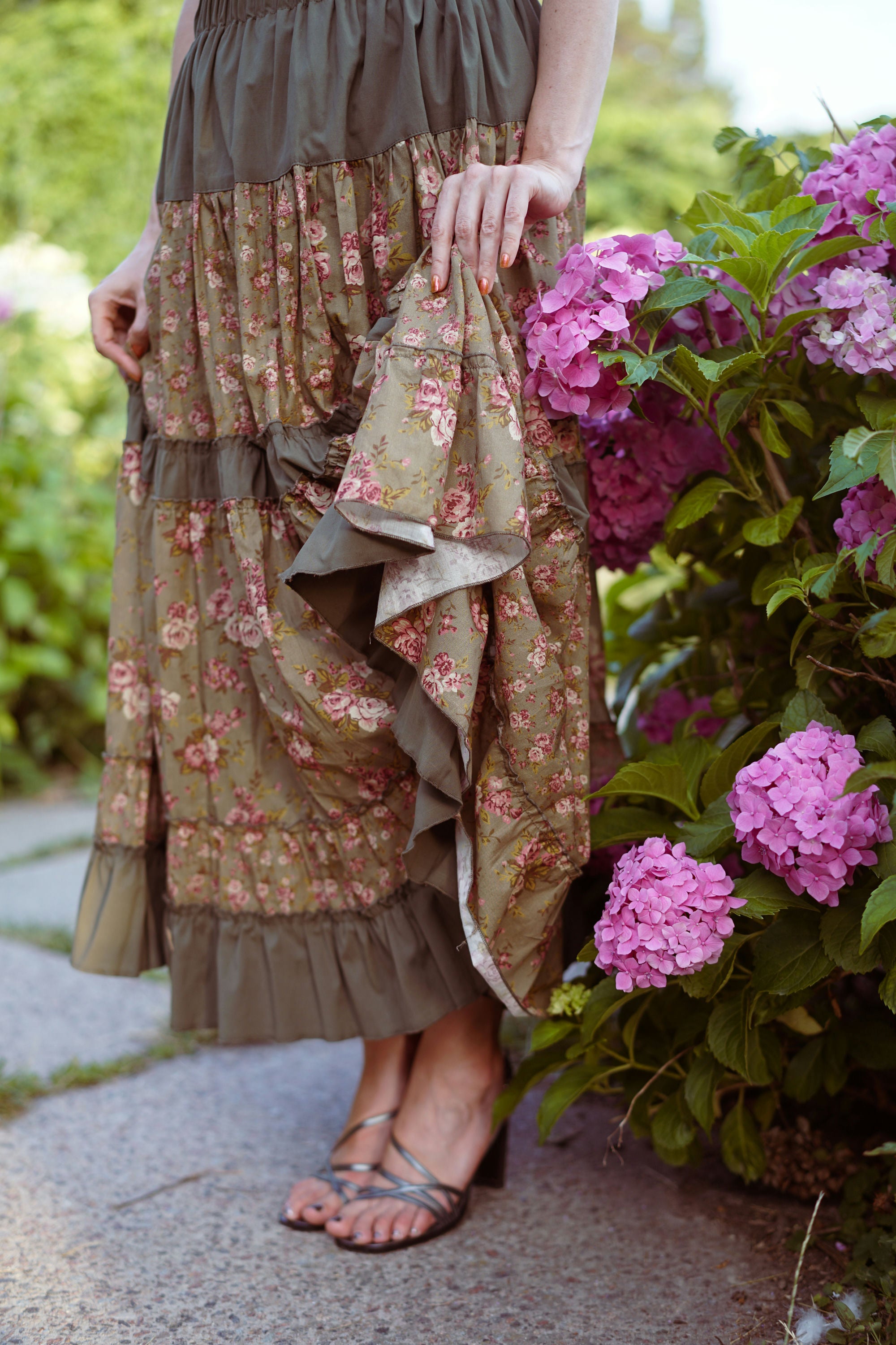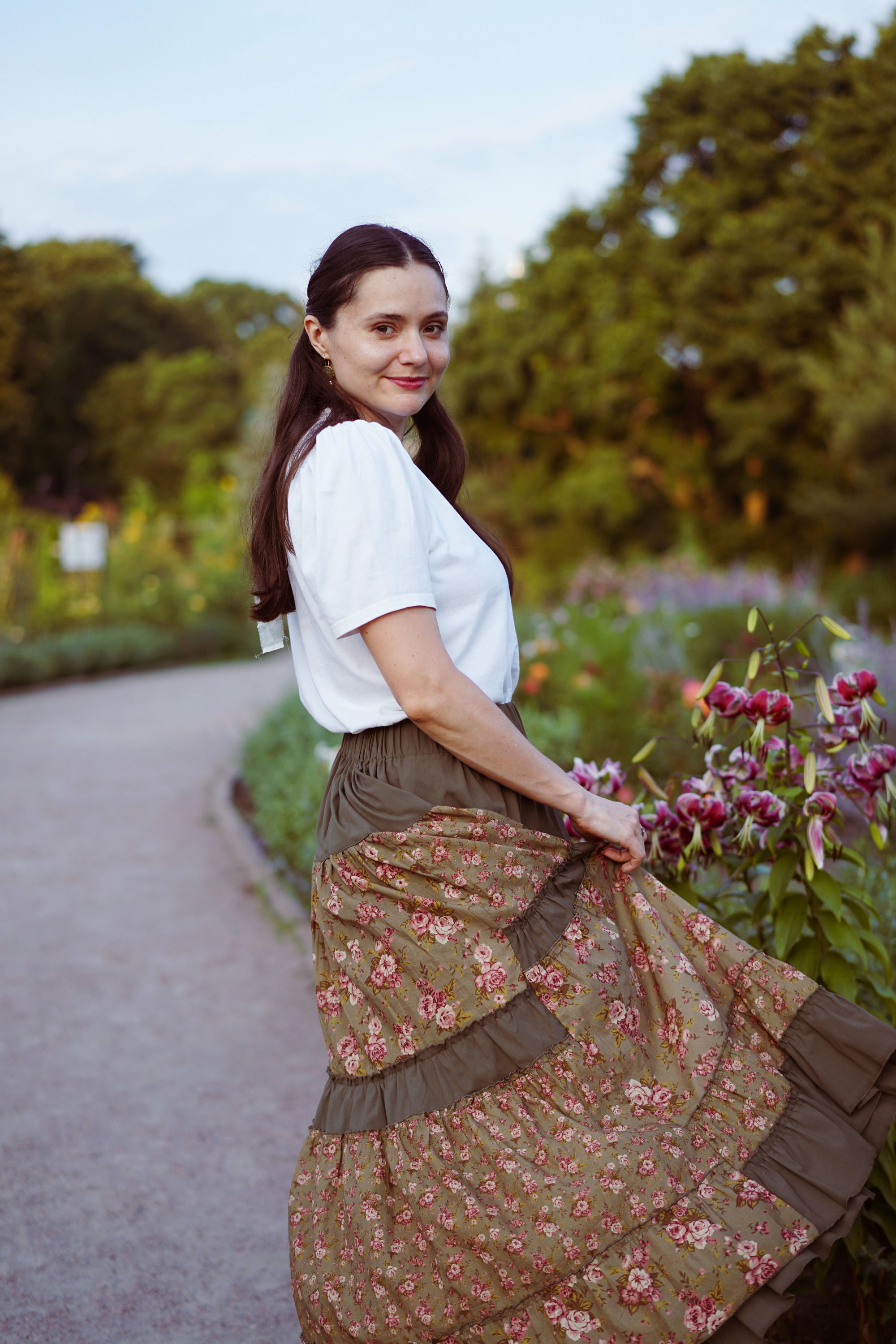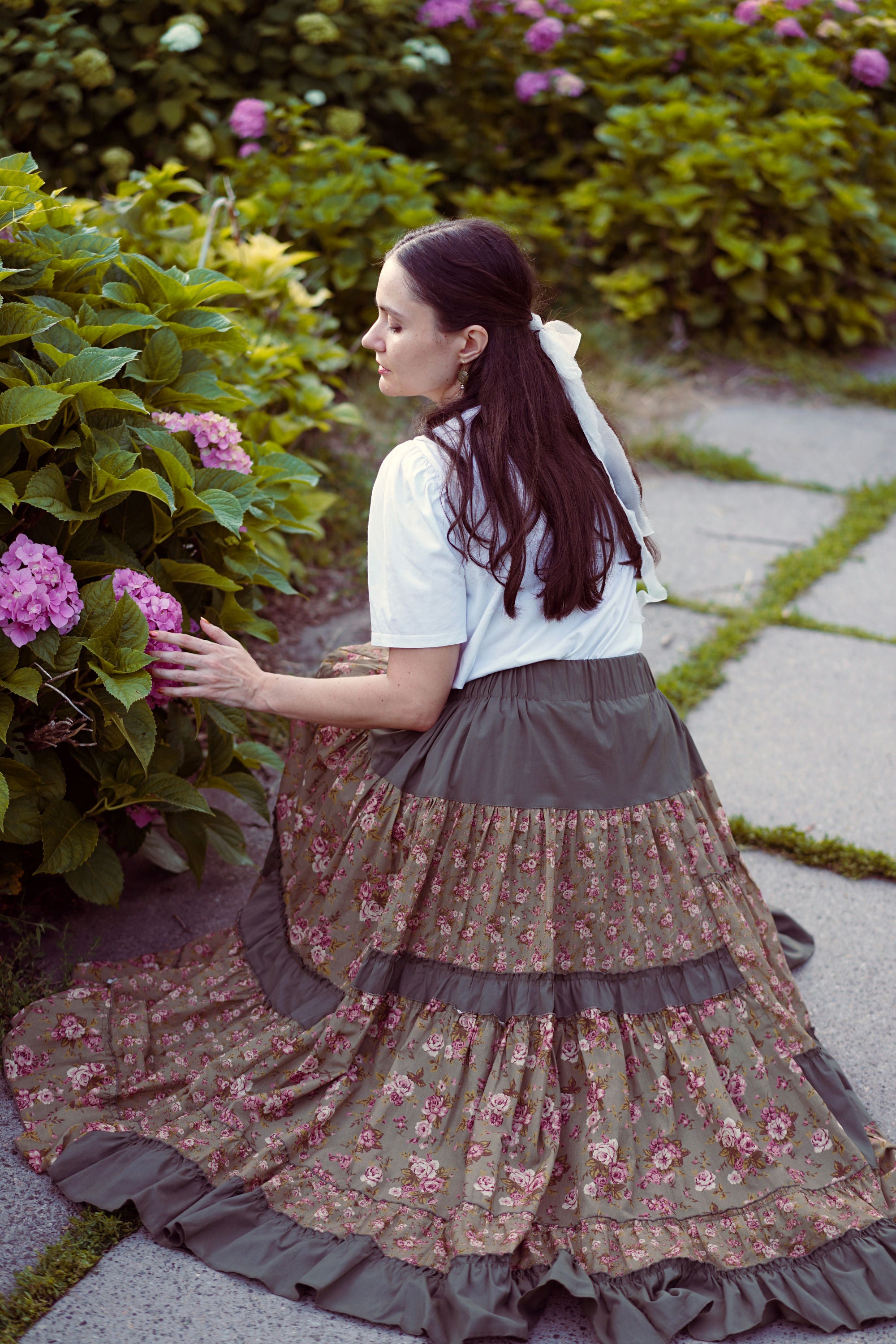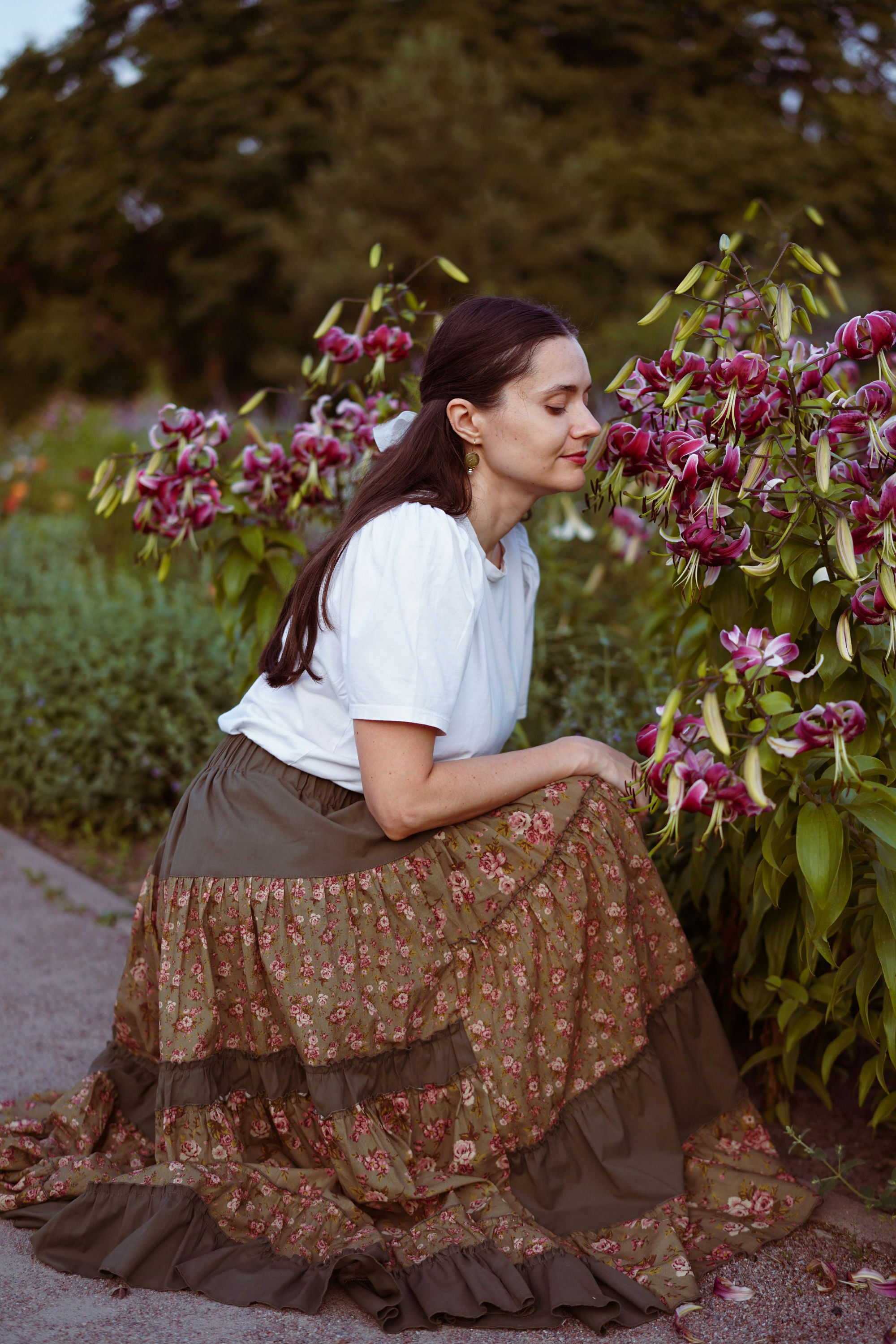 Юбка миди с ярусным кроем и поясом на резинке. Окружность подола — 4 метра. Ткань — батист.