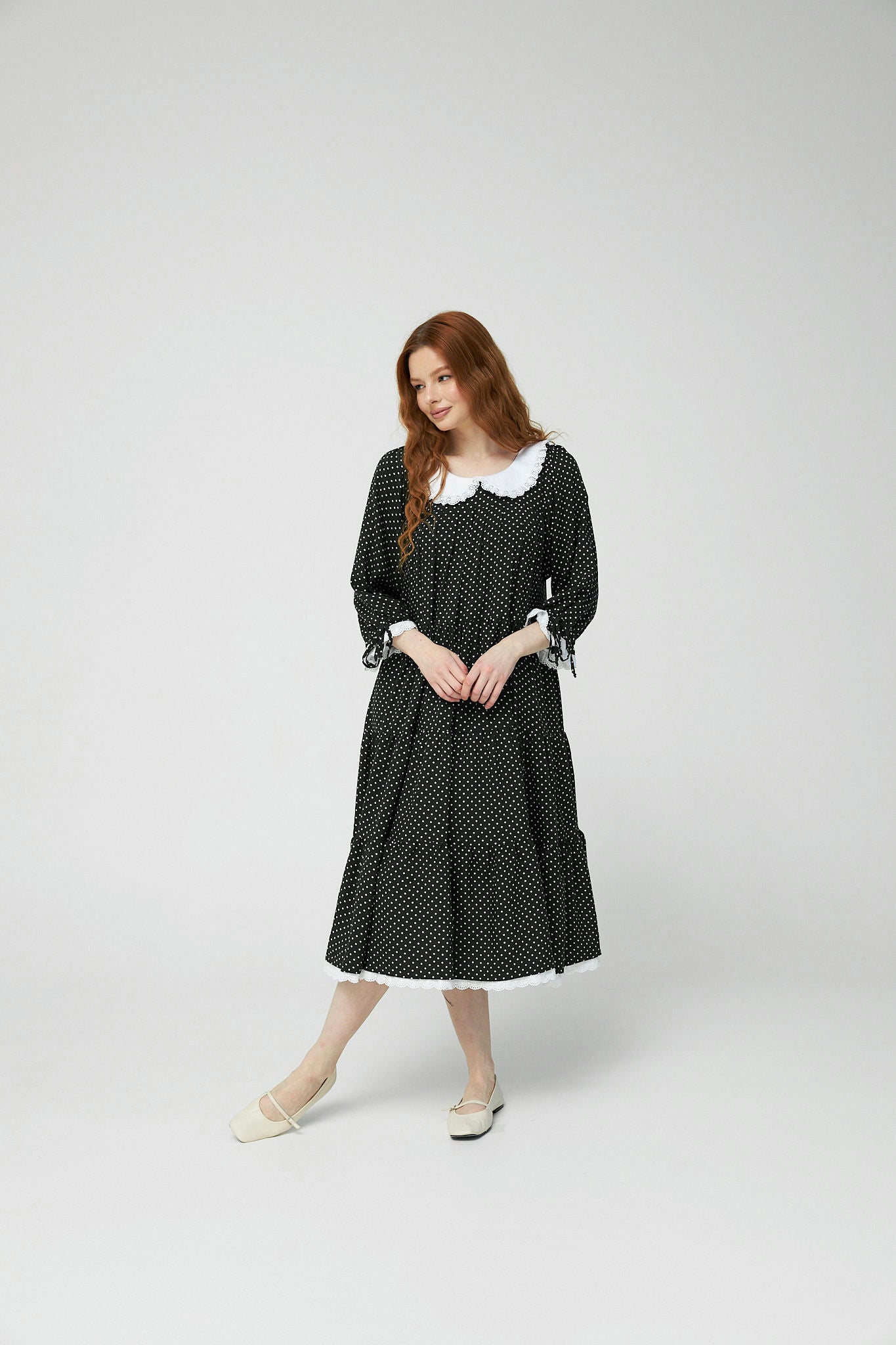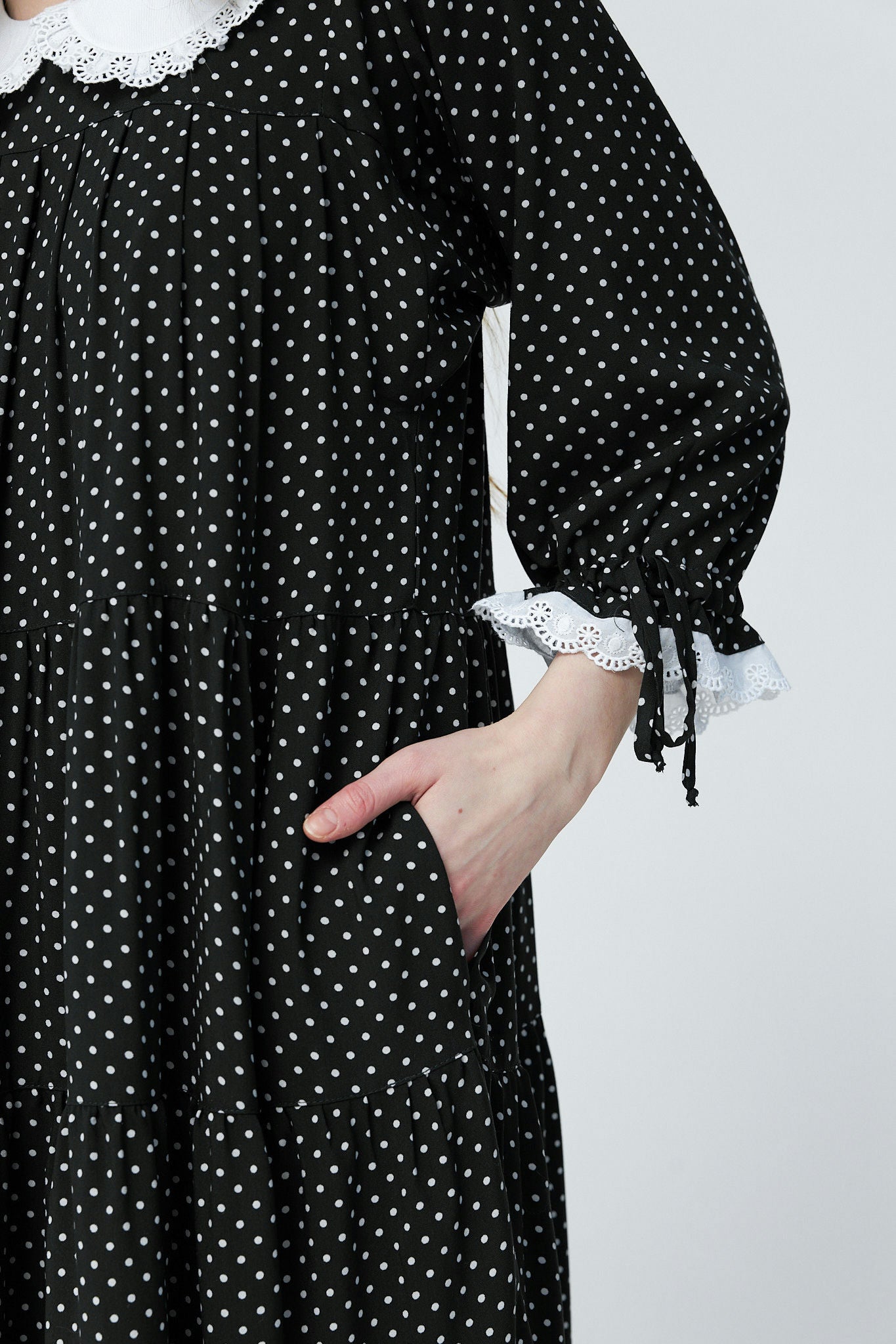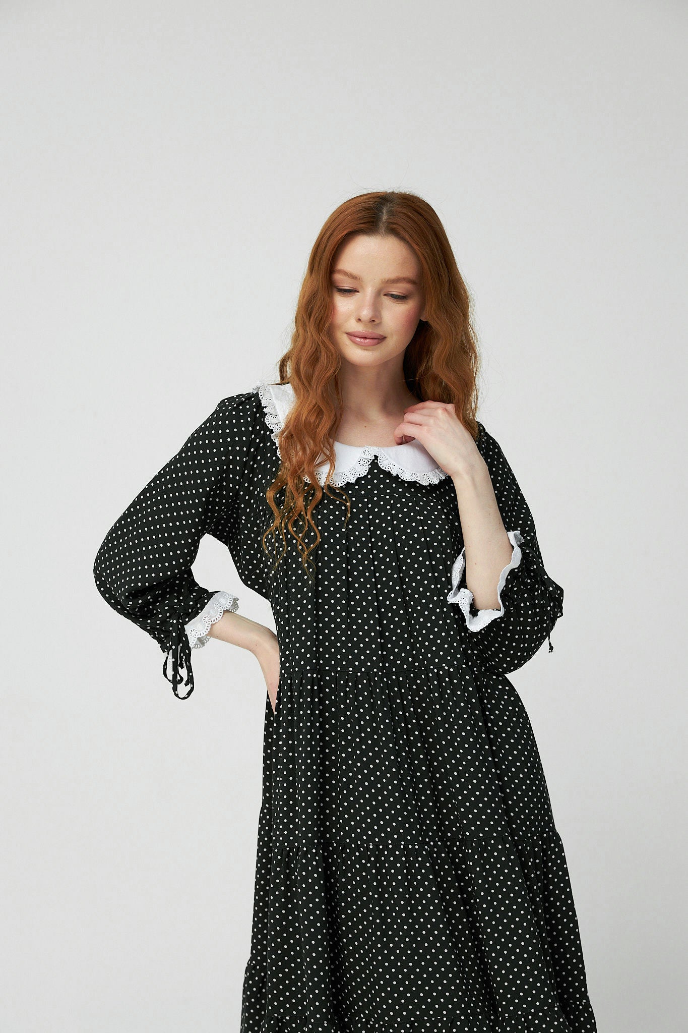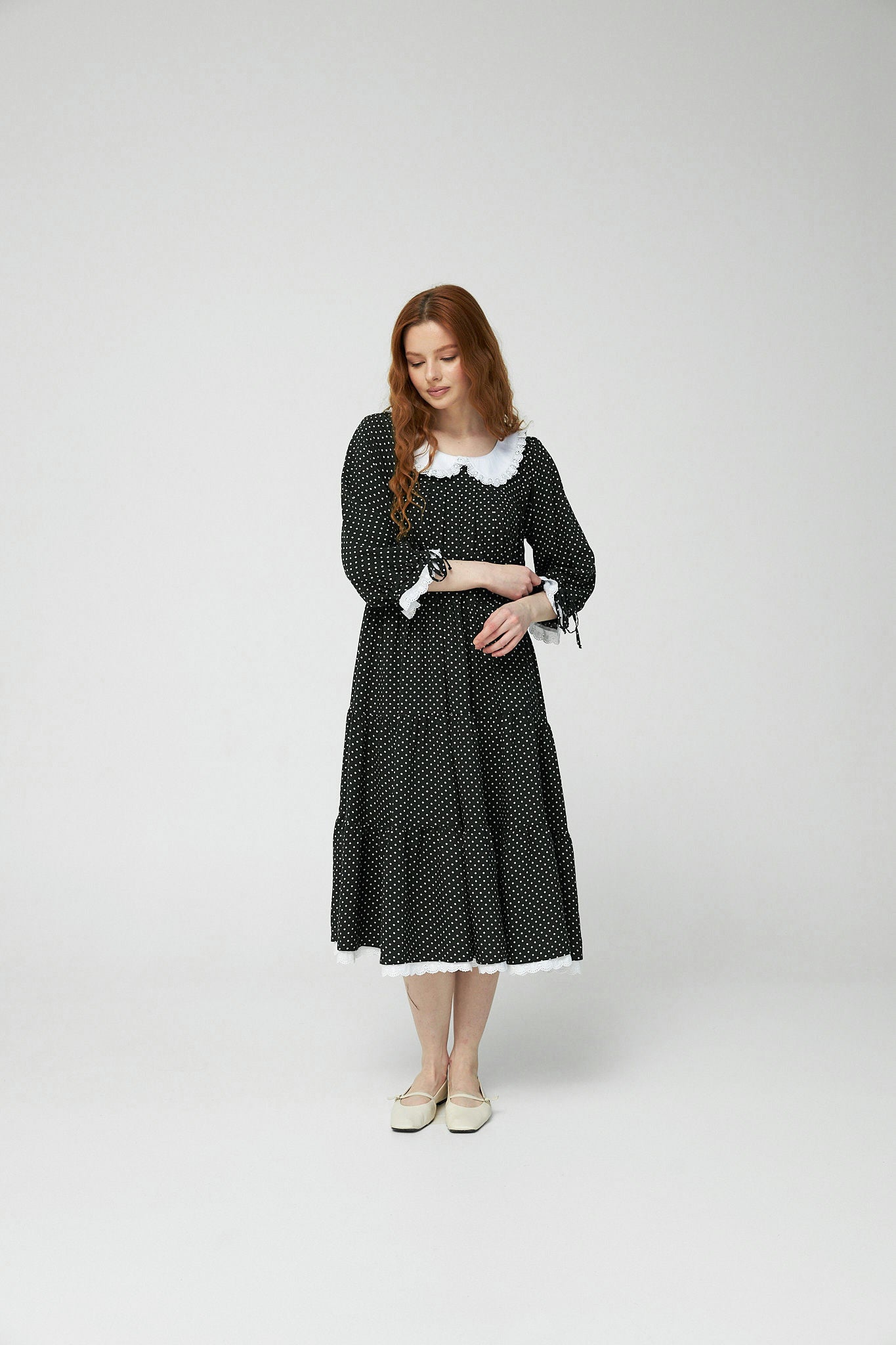 Платье миди, свободного кроя, сшито ярусами с круглым воротником и кокеткой над грудью. Рукав 3/4 с ластовицей, на завязках. Воротник, рукав и нижний ярус украшены кружевом. Ткань 100% вискоза и хлопковое кружево.