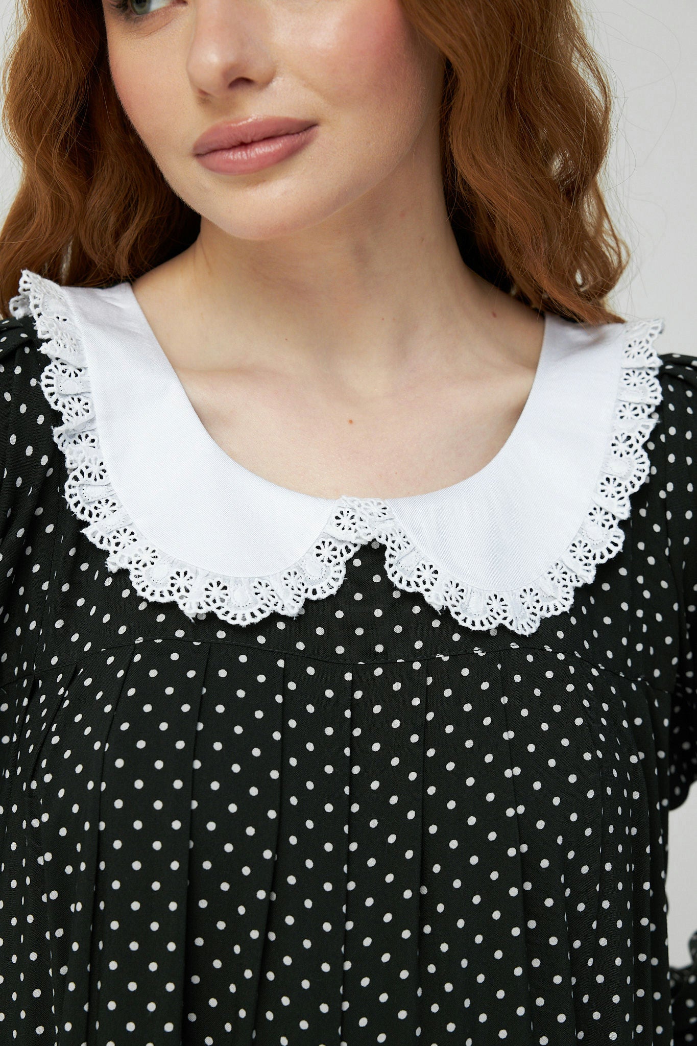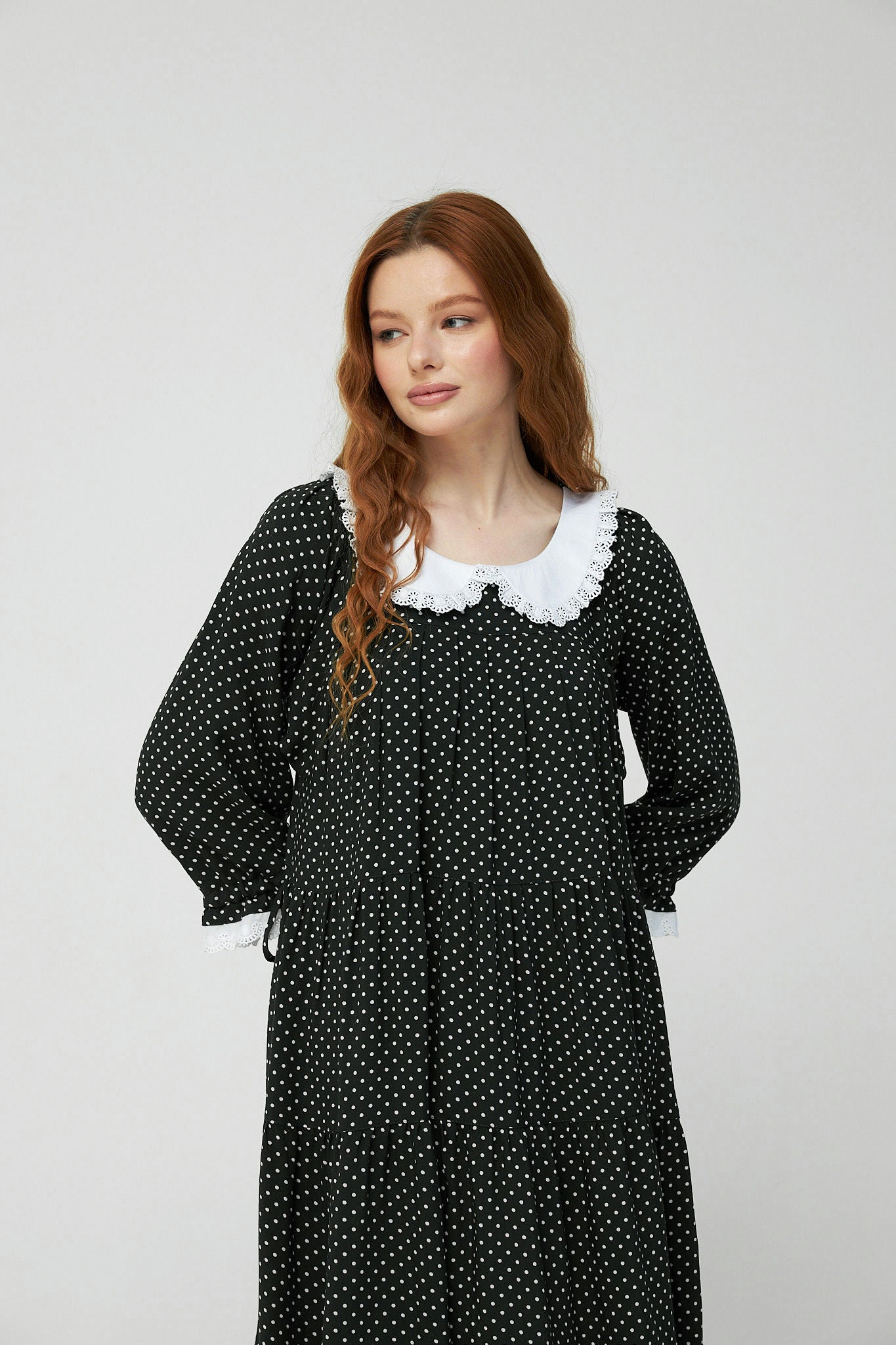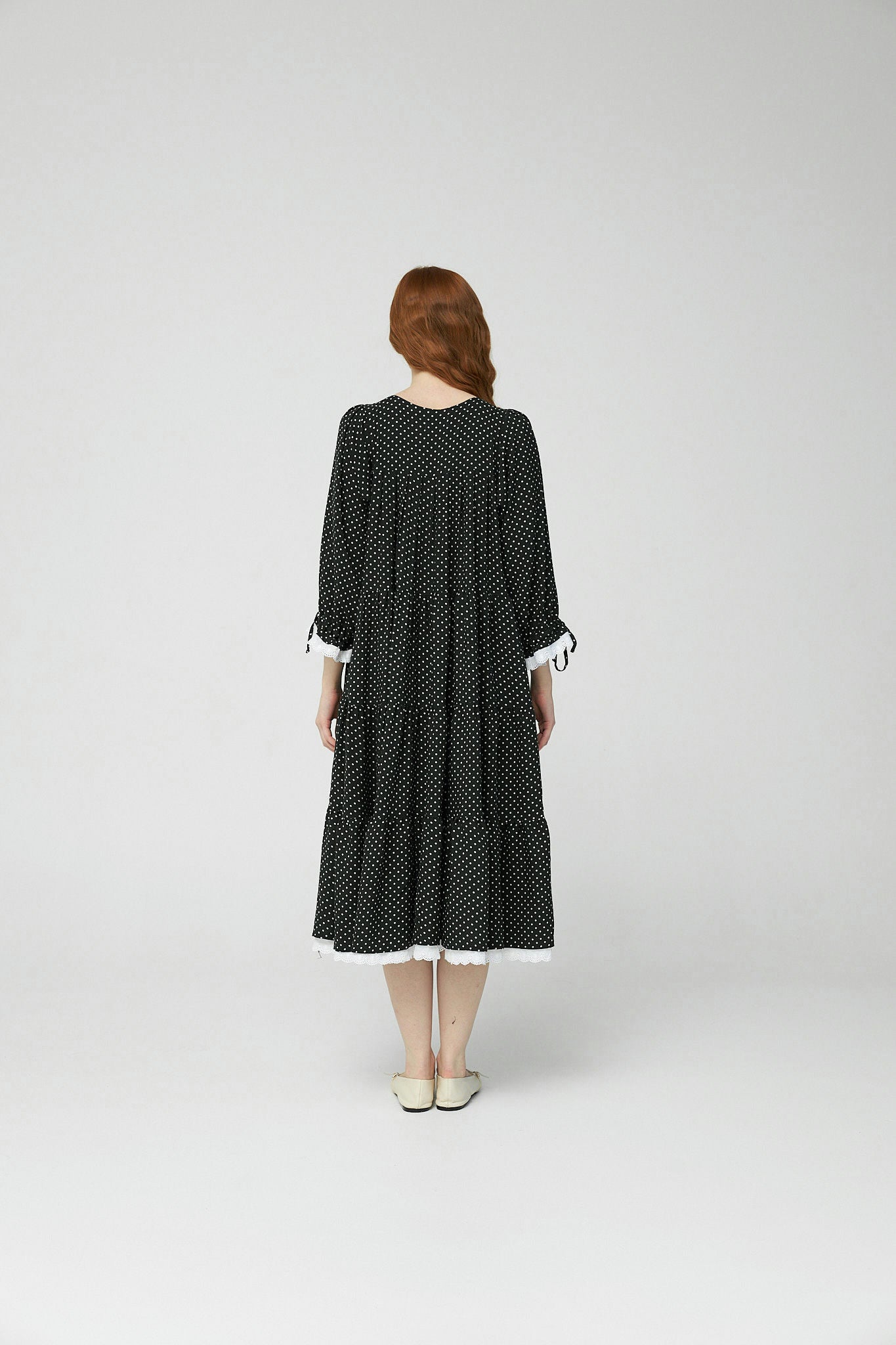 Платье миди, свободного кроя, сшито ярусами с круглым воротником и кокеткой над грудью. Рукав 3/4 с ластовицей, на завязках. Воротник, рукав и нижний ярус украшены кружевом. Ткань 100% вискоза и хлопковое кружево.