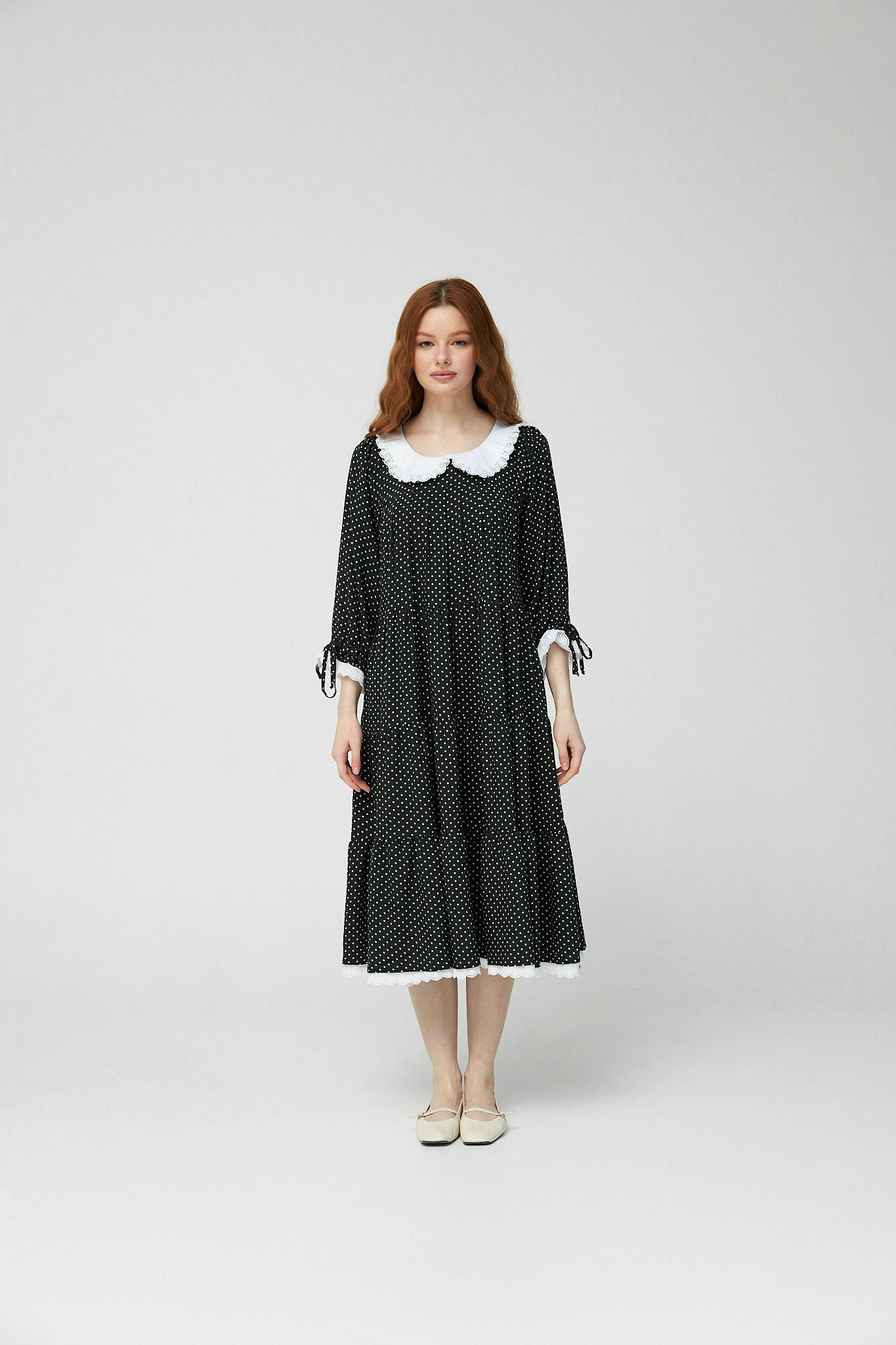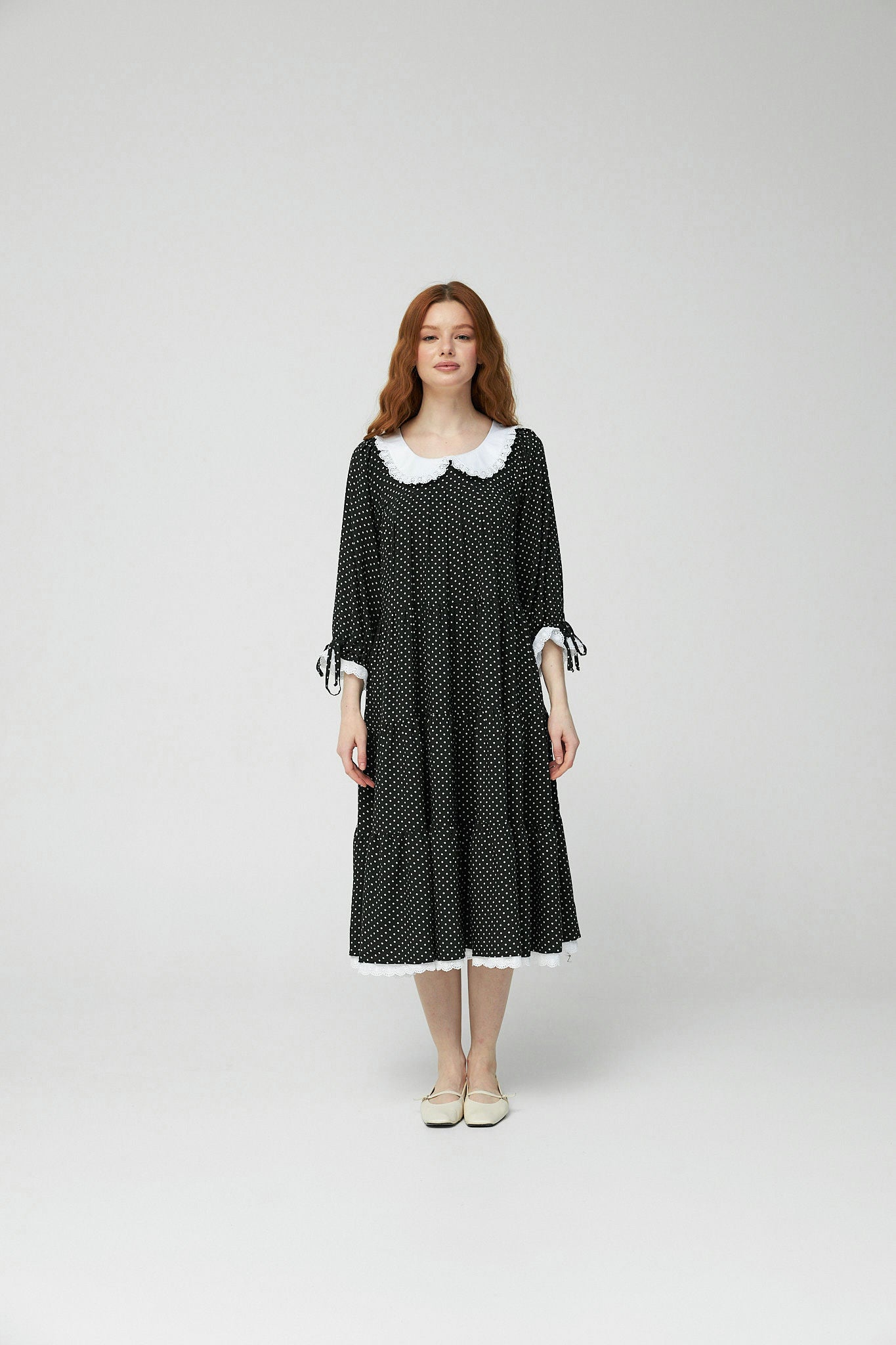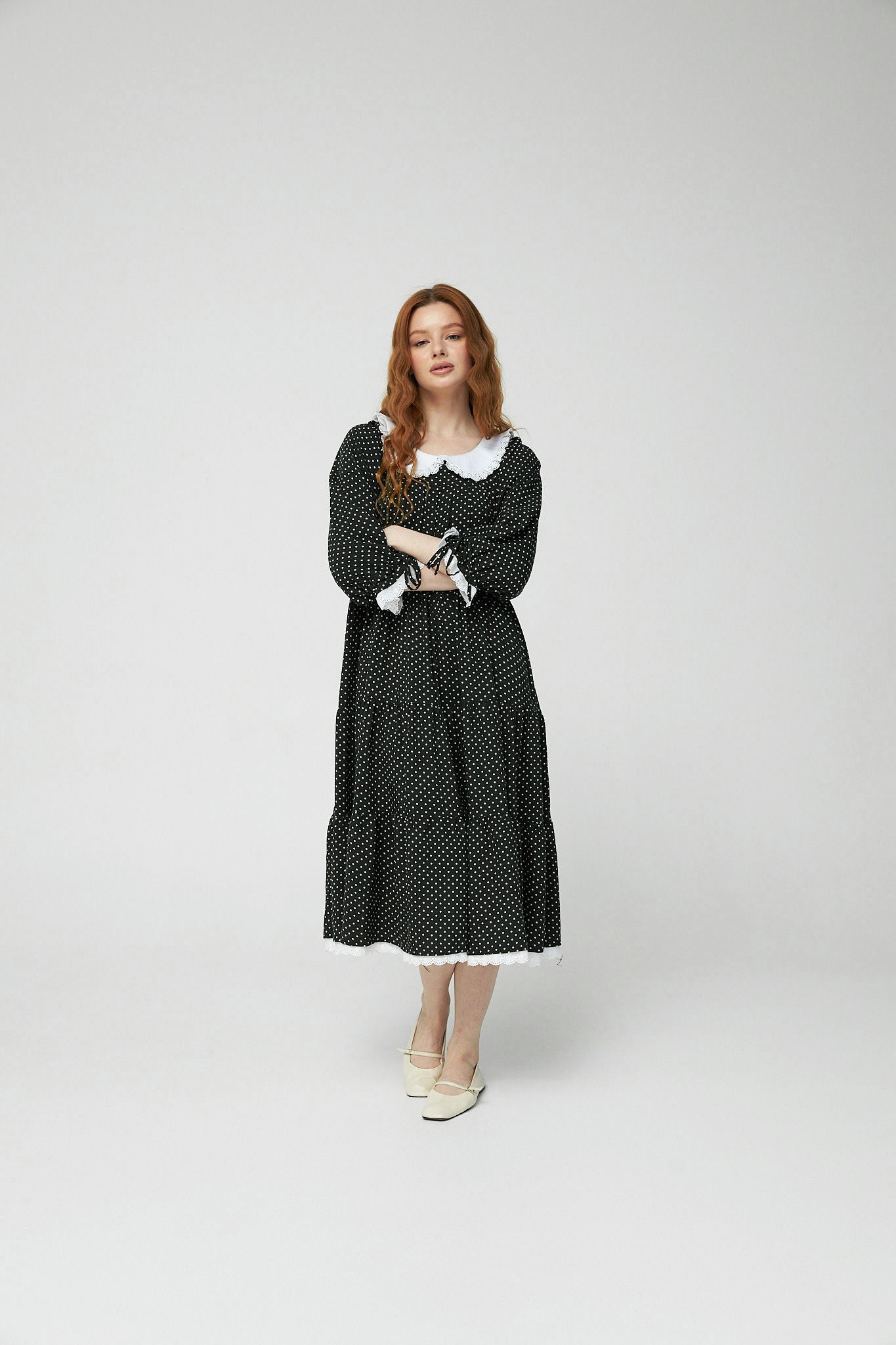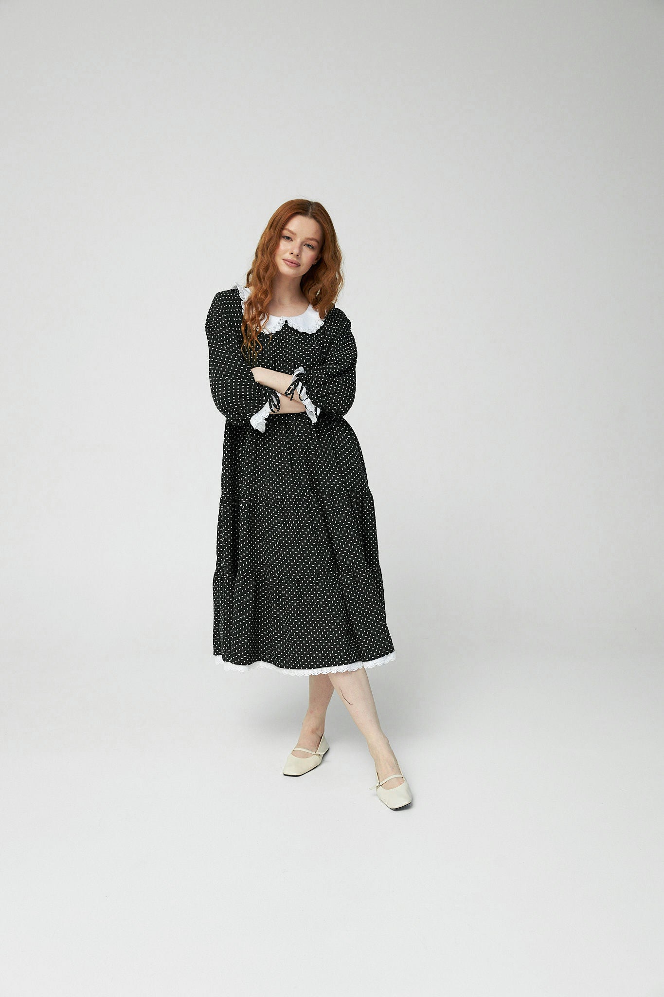 Платье миди, свободного кроя, сшито ярусами с круглым воротником и кокеткой над грудью. Рукав 3/4 с ластовицей, на завязках. Воротник, рукав и нижний ярус украшены кружевом. Ткань 100% вискоза и хлопковое кружево.