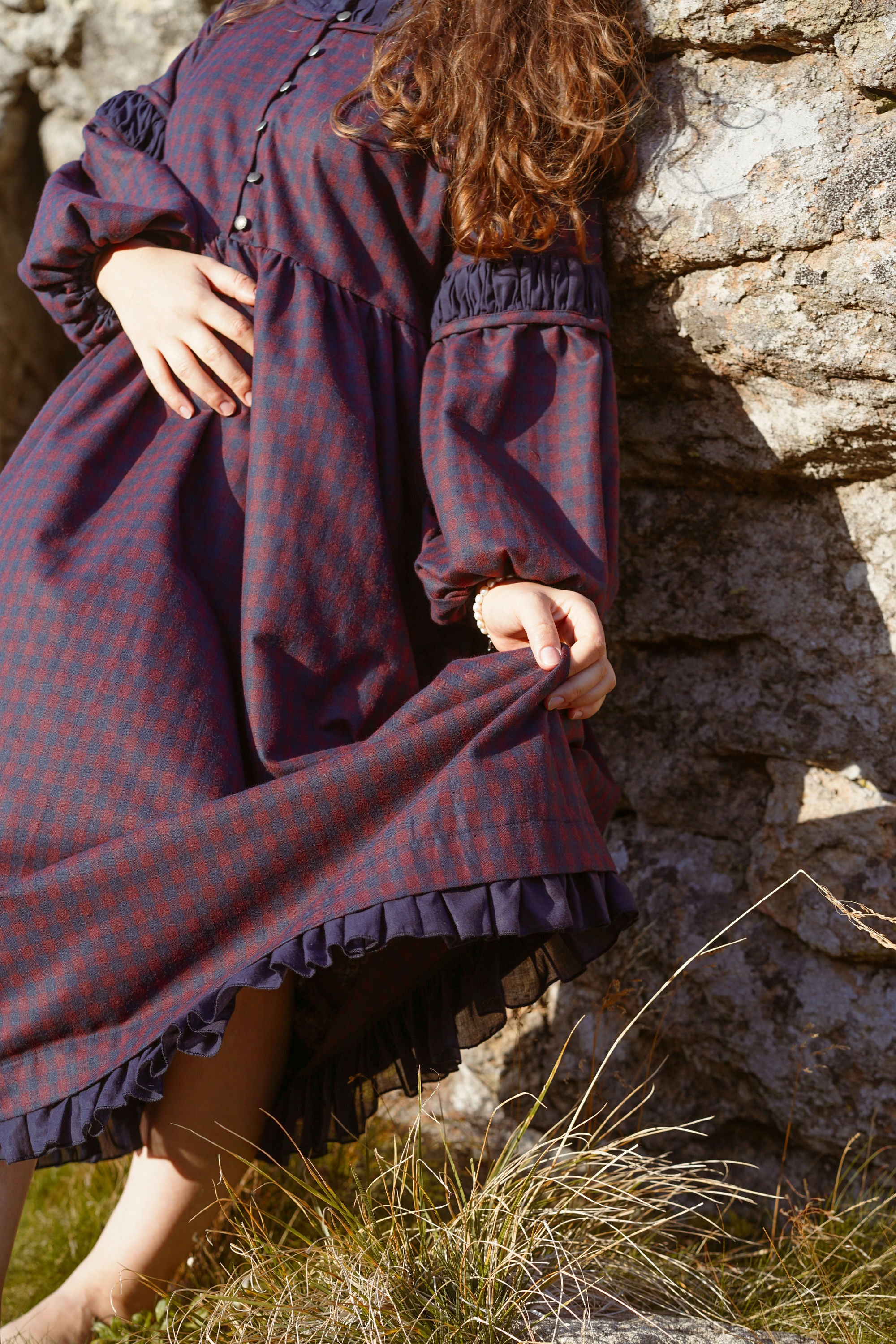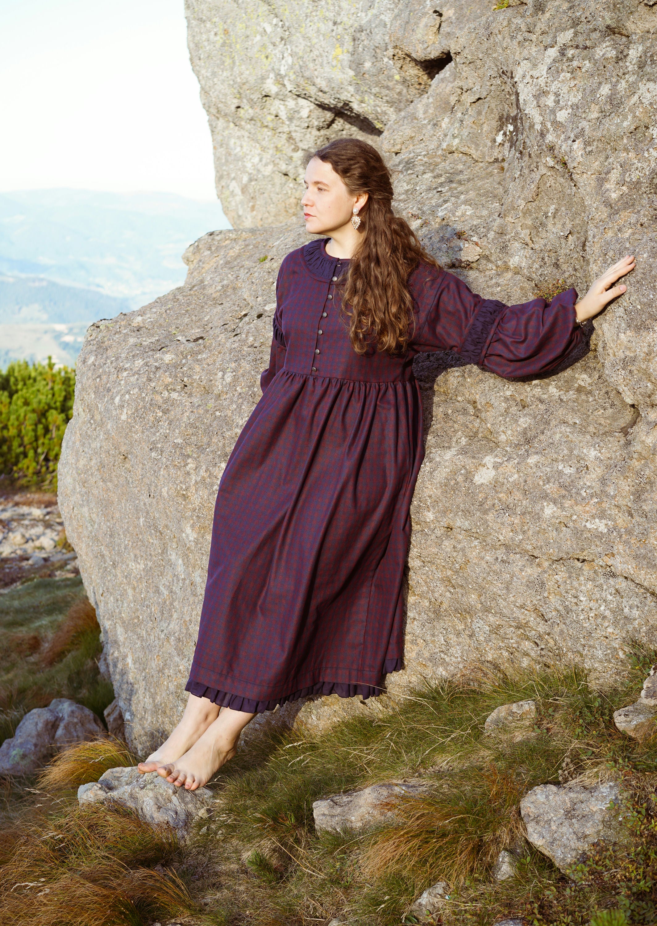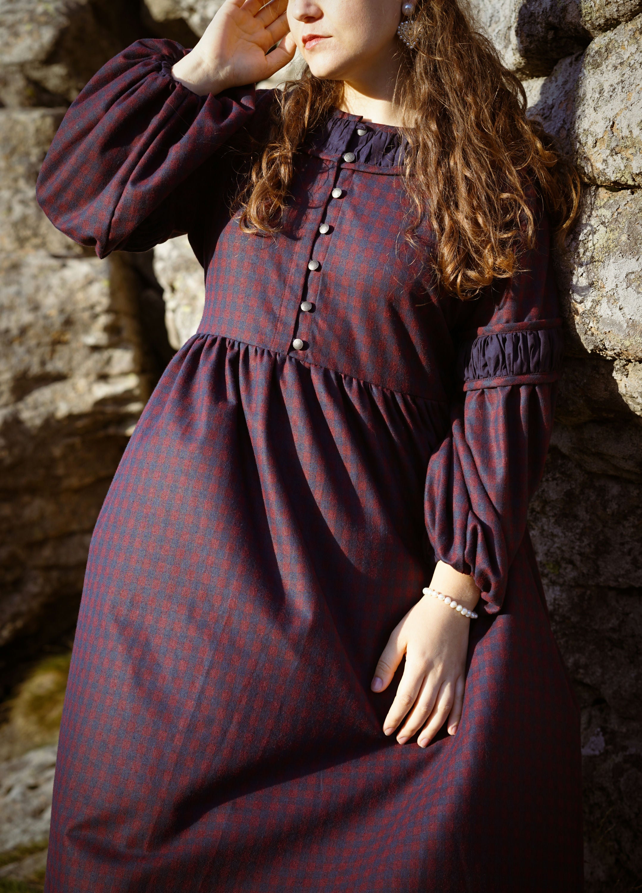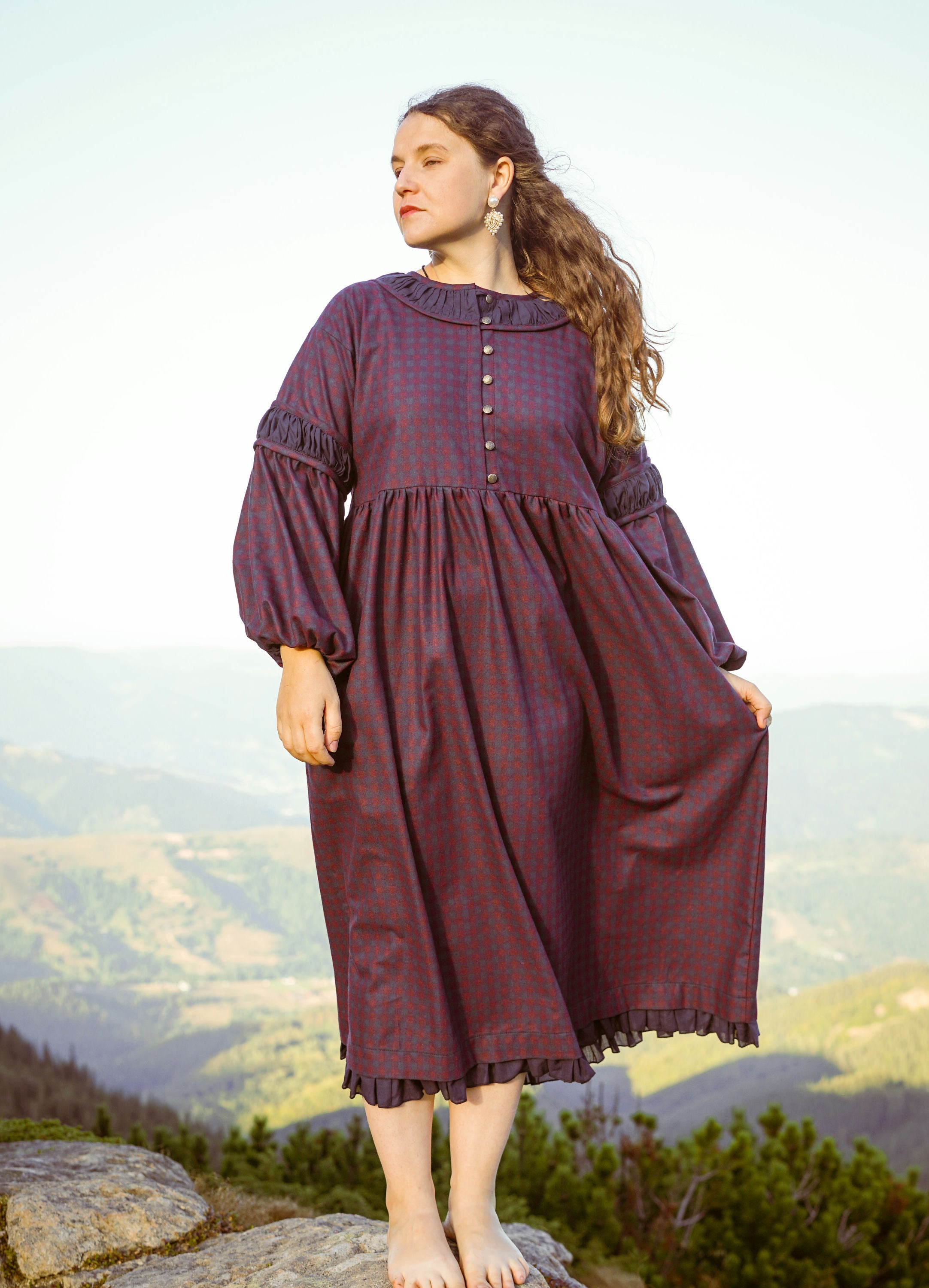 Теплое платье миди из хлопковой фланели с завышенной талией, кокеткой на пуговицах и карманами. С пышным длинным рукавом и ластовицей. Вырез горловины и рукава украшены батистом. Материал фланель и батист.