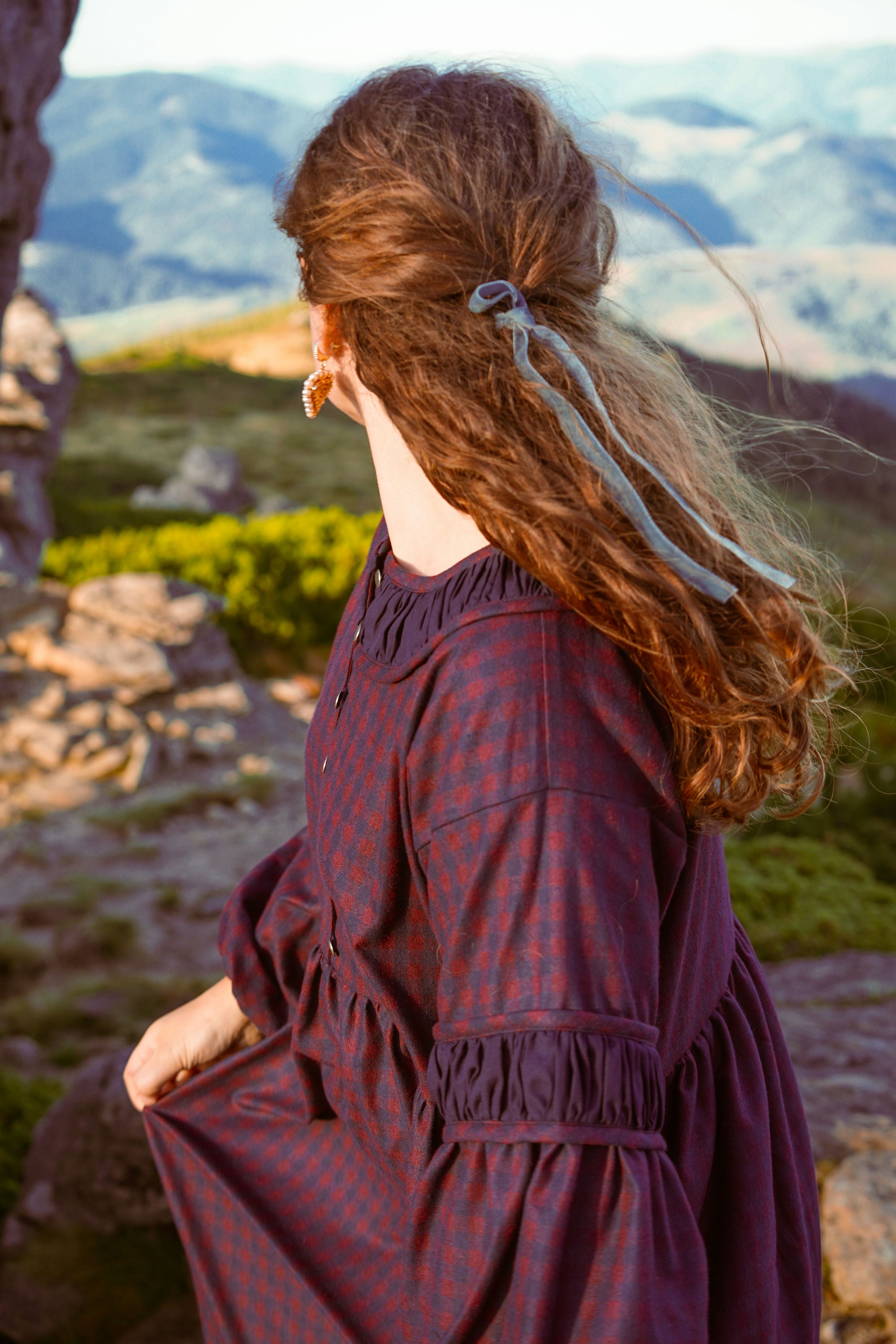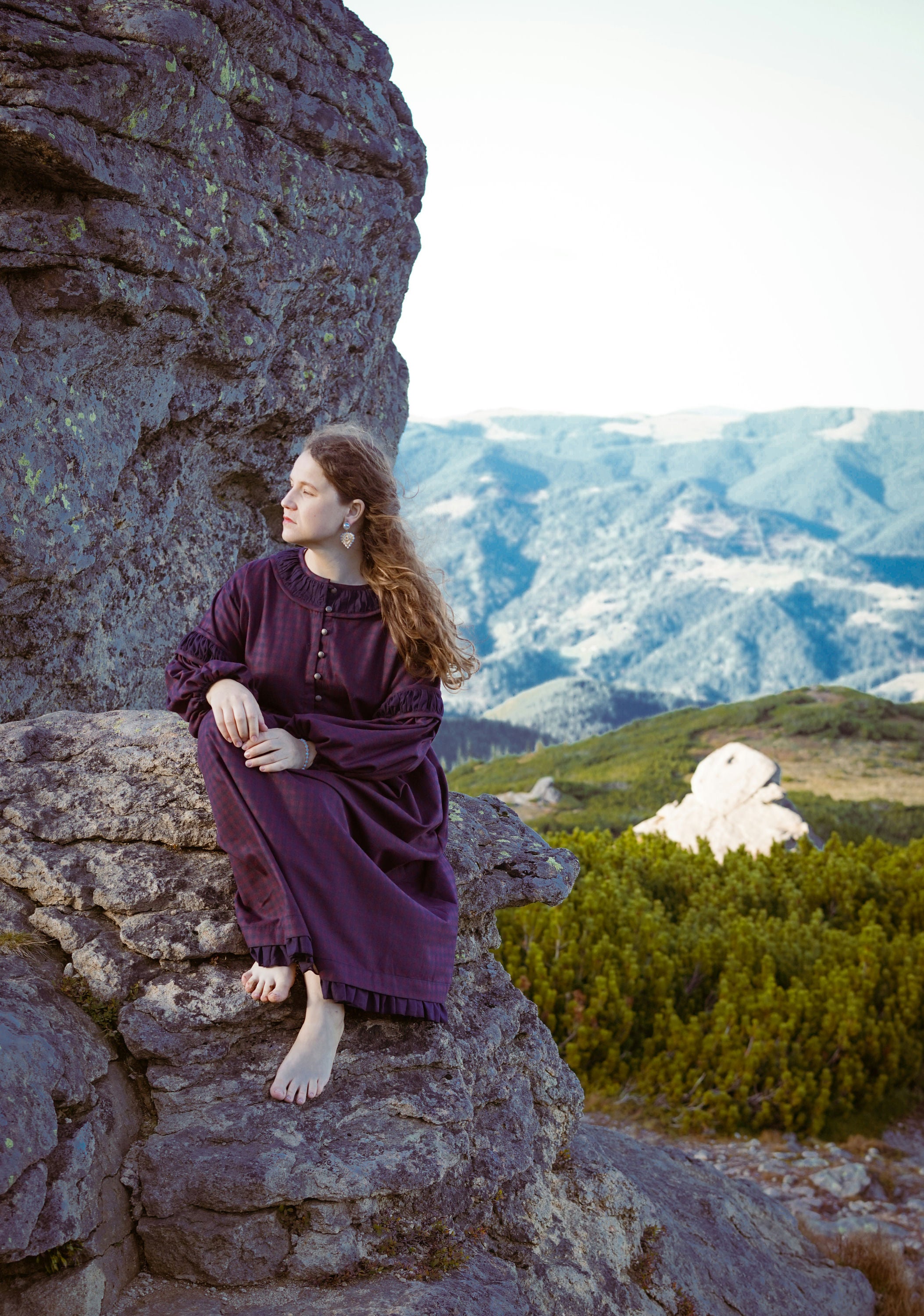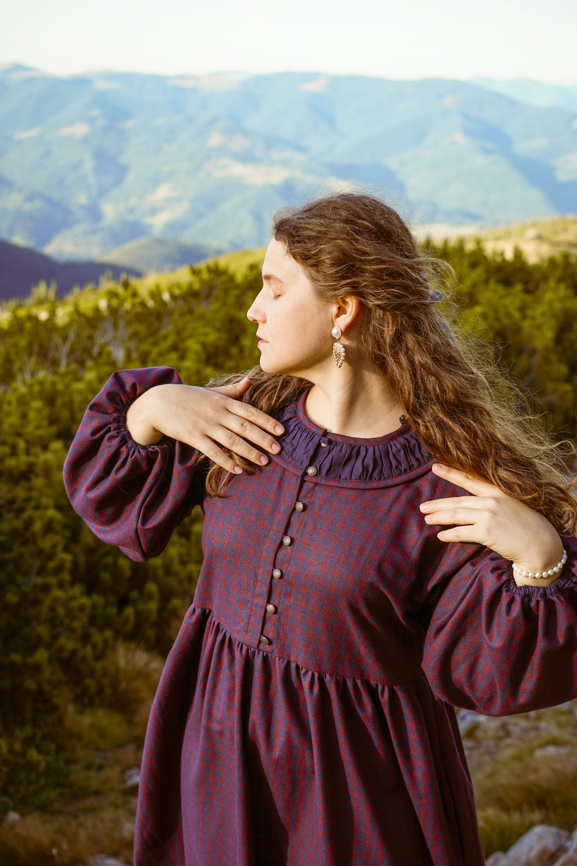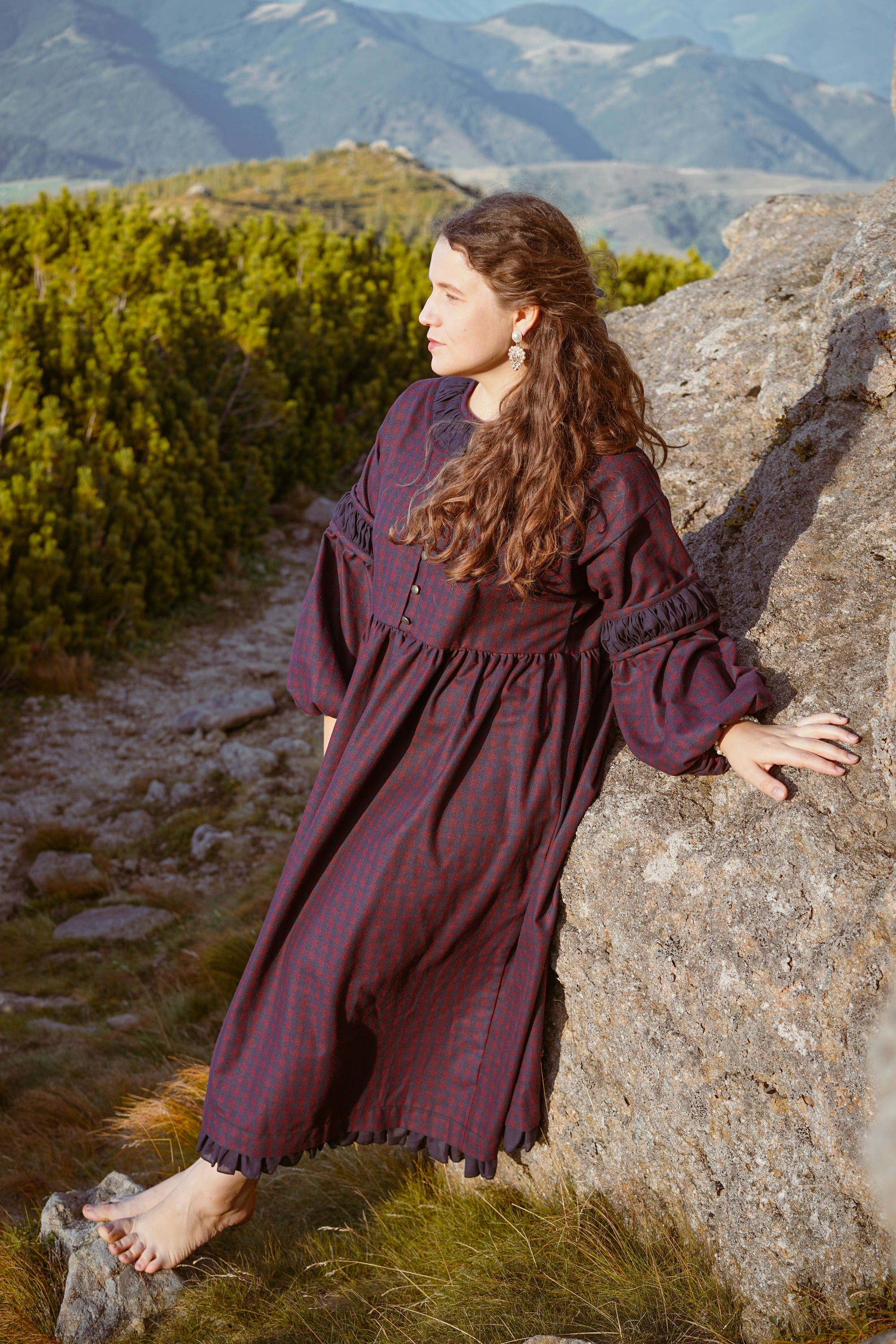Теплое платье миди из хлопковой фланели с завышенной талией, кокеткой на пуговицах и карманами. С пышным длинным рукавом и ластовицей. Вырез горловины и рукава украшены батистом. Материал фланель и батист.
