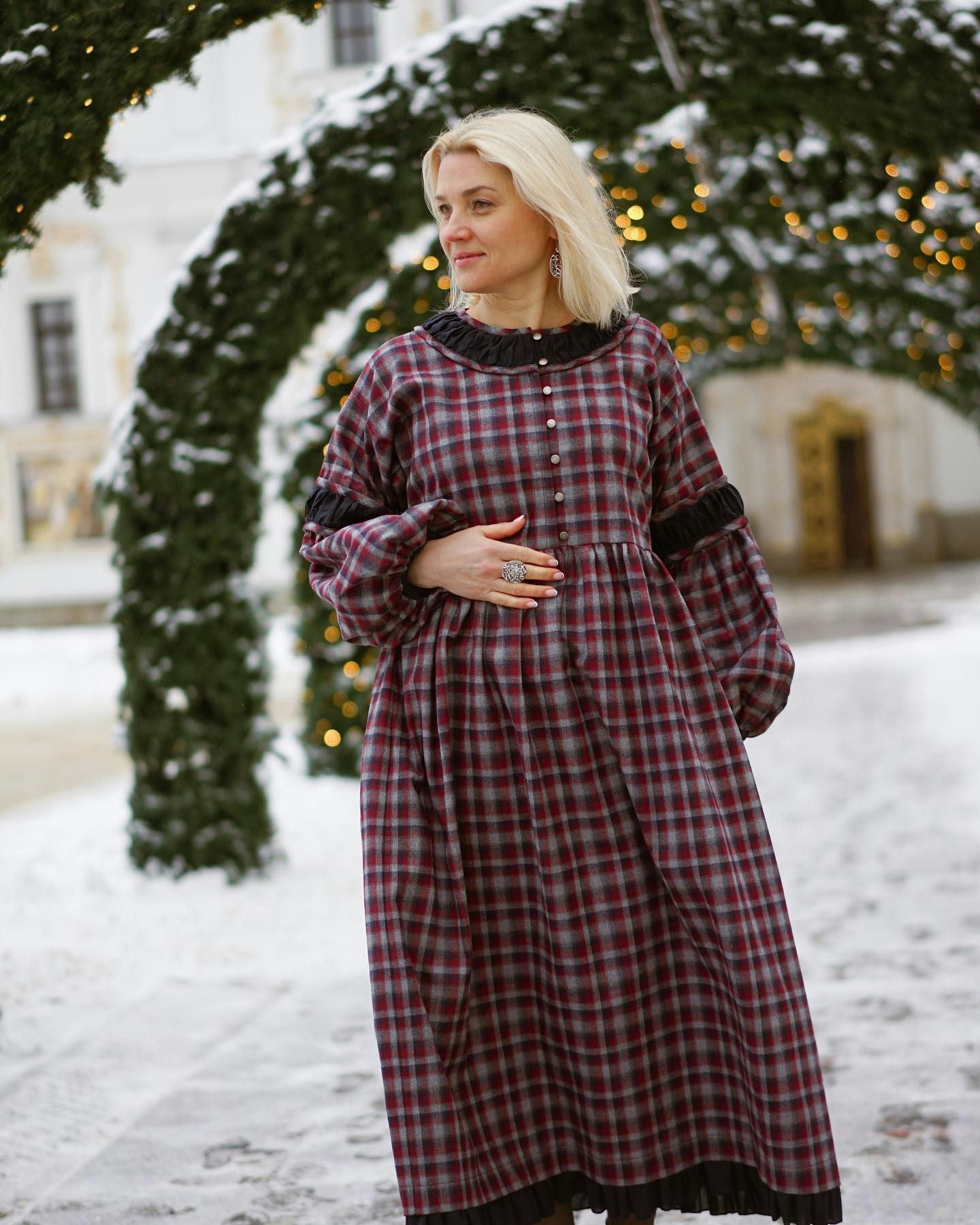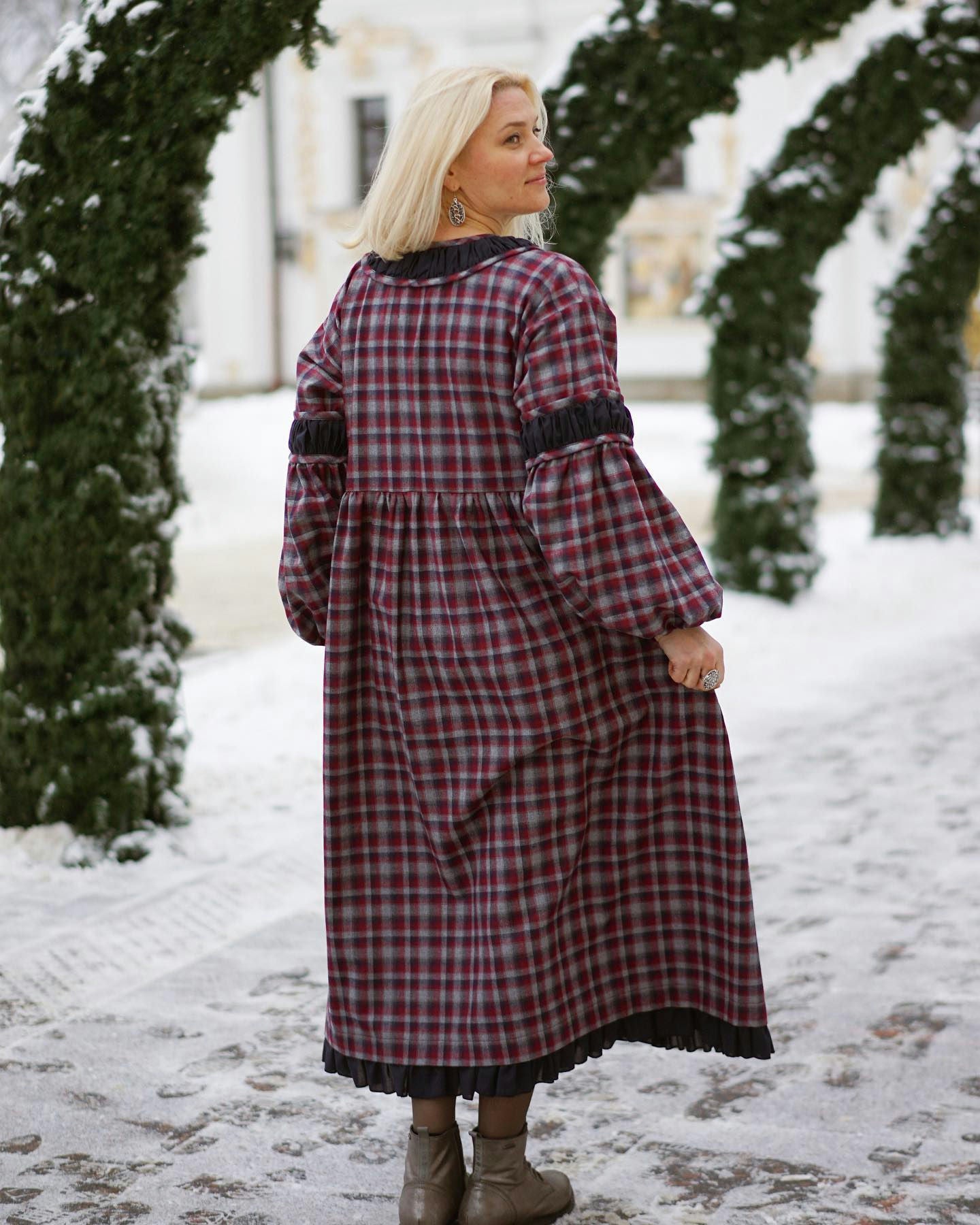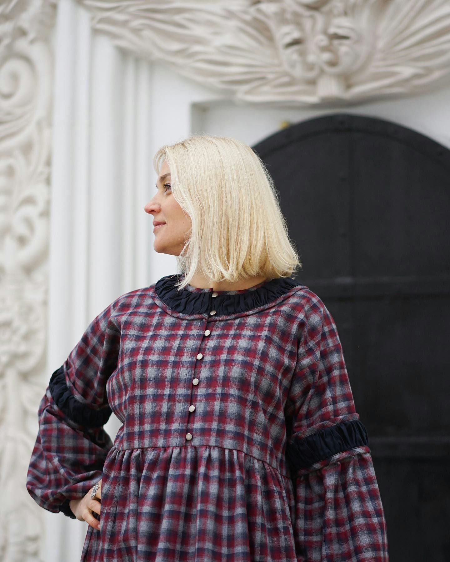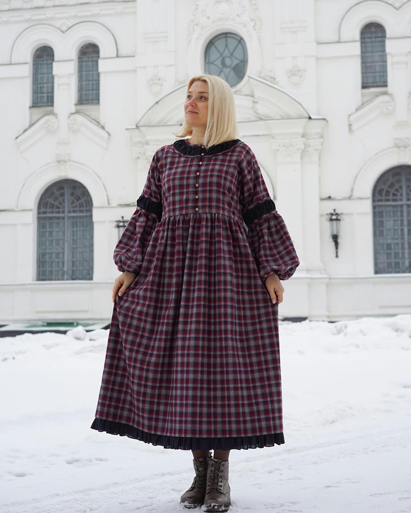 Теплое платье миди из хлопковой фланели с завышенной талией, кокеткой на пуговицах и карманами. С пышным длинным рукавом и ластовицей. Вырез горловины и рукава украшены батистом. Материал фланель и батист.
