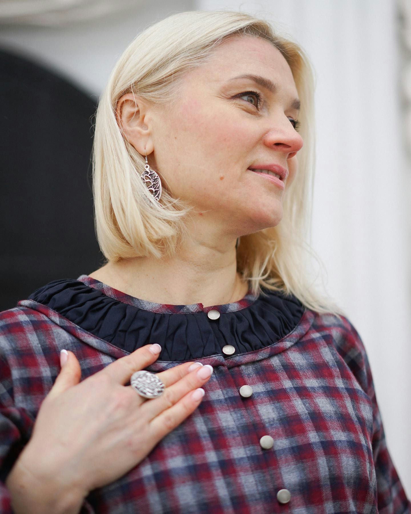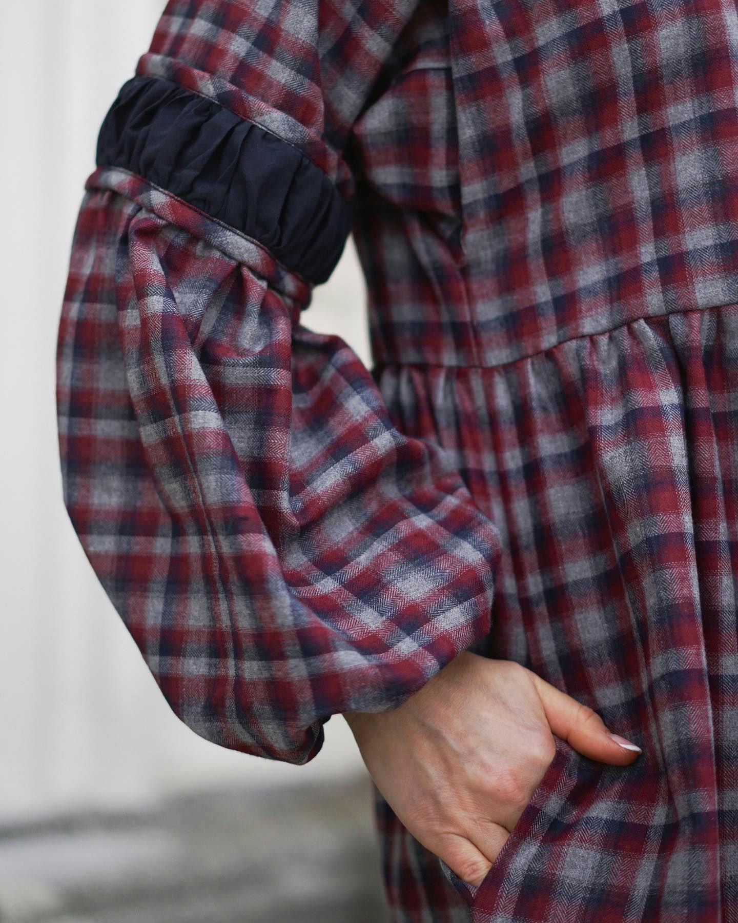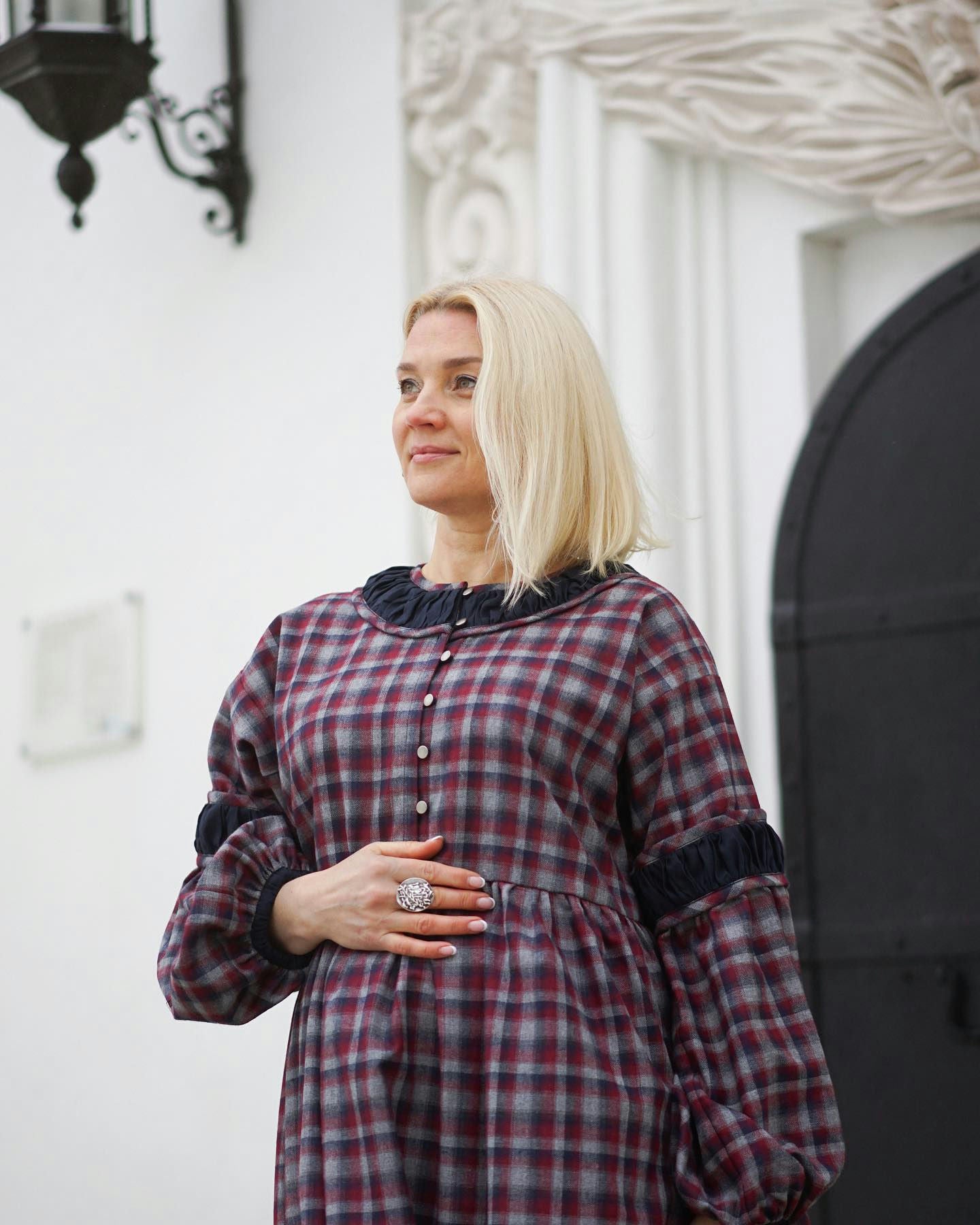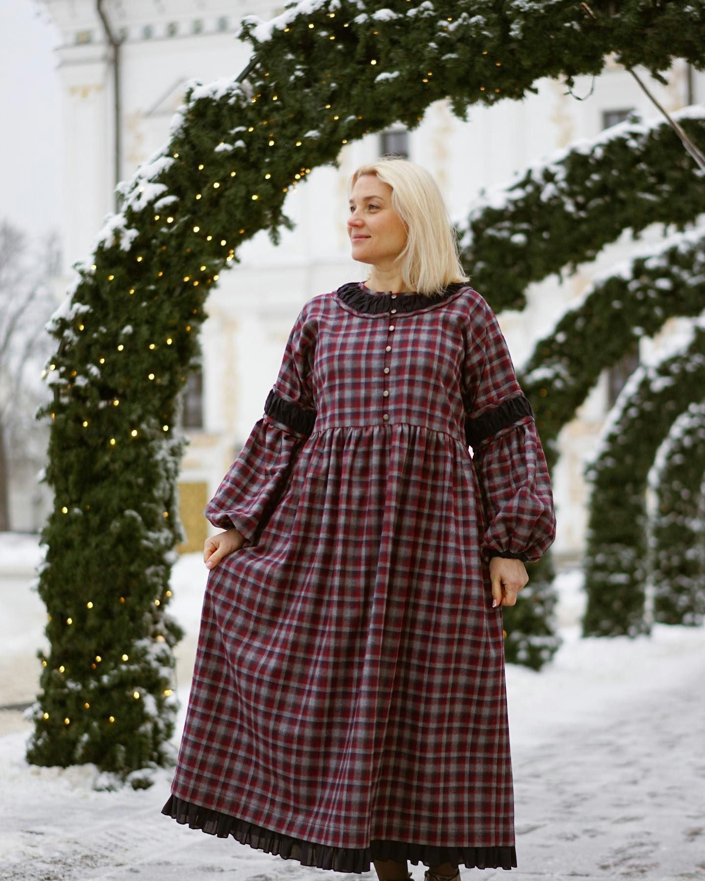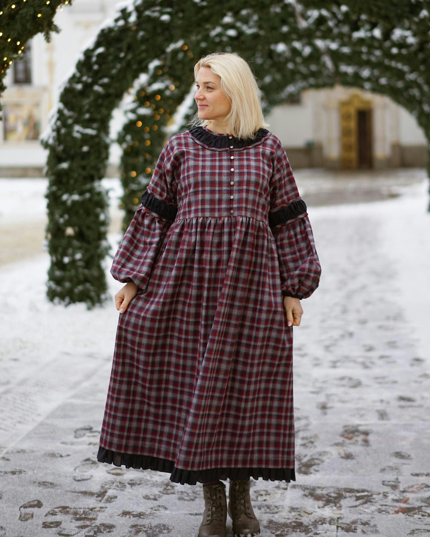 Теплое платье миди из хлопковой фланели с завышенной талией, кокеткой на пуговицах и карманами. С пышным длинным рукавом и ластовицей. Вырез горловины и рукава украшены батистом. Материал фланель и батист.