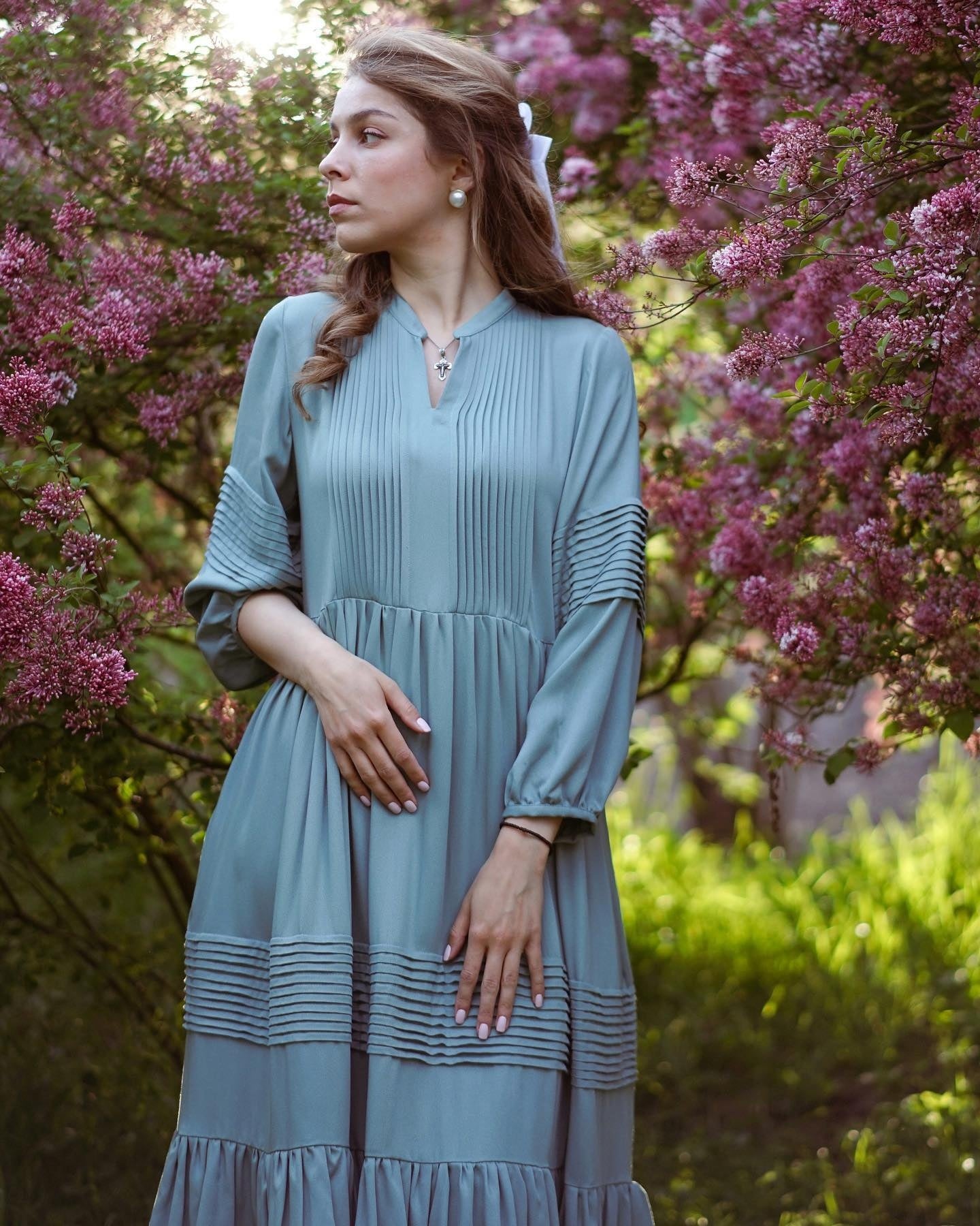 Сукня «Олімпія» міді довжини з вшивним рукавом та зручними кишенями у бокових швах. Перед, спинка, рукави та спідниця оздоблені витонченими защипами, що додають конструктивної виразності. По низу сукні — пришита оборка, яка надає виробу легкого об’єму. Комір-стійка підкреслює лаконічний та елегантний силует. Матеріал — 100% віскоза.