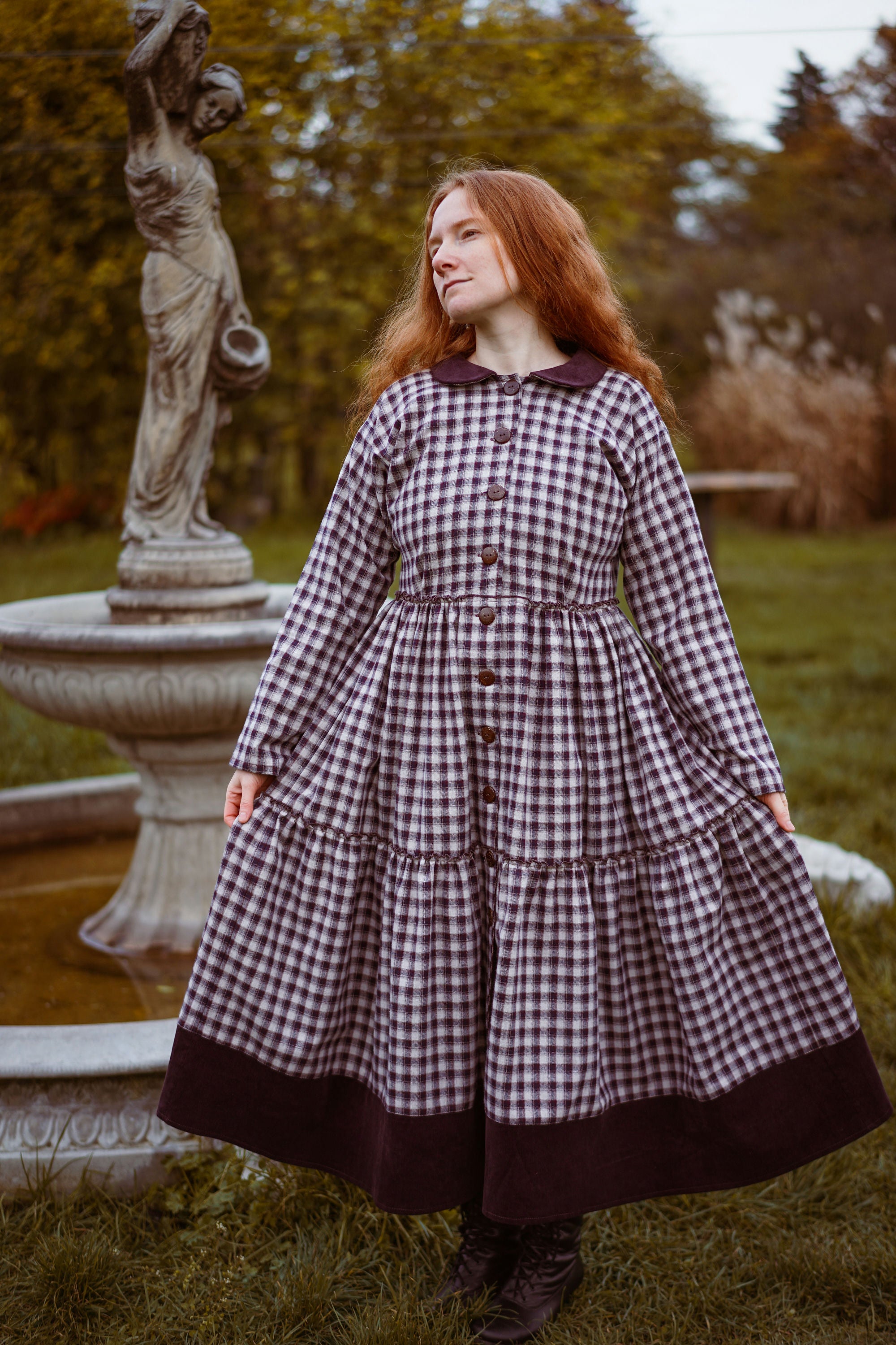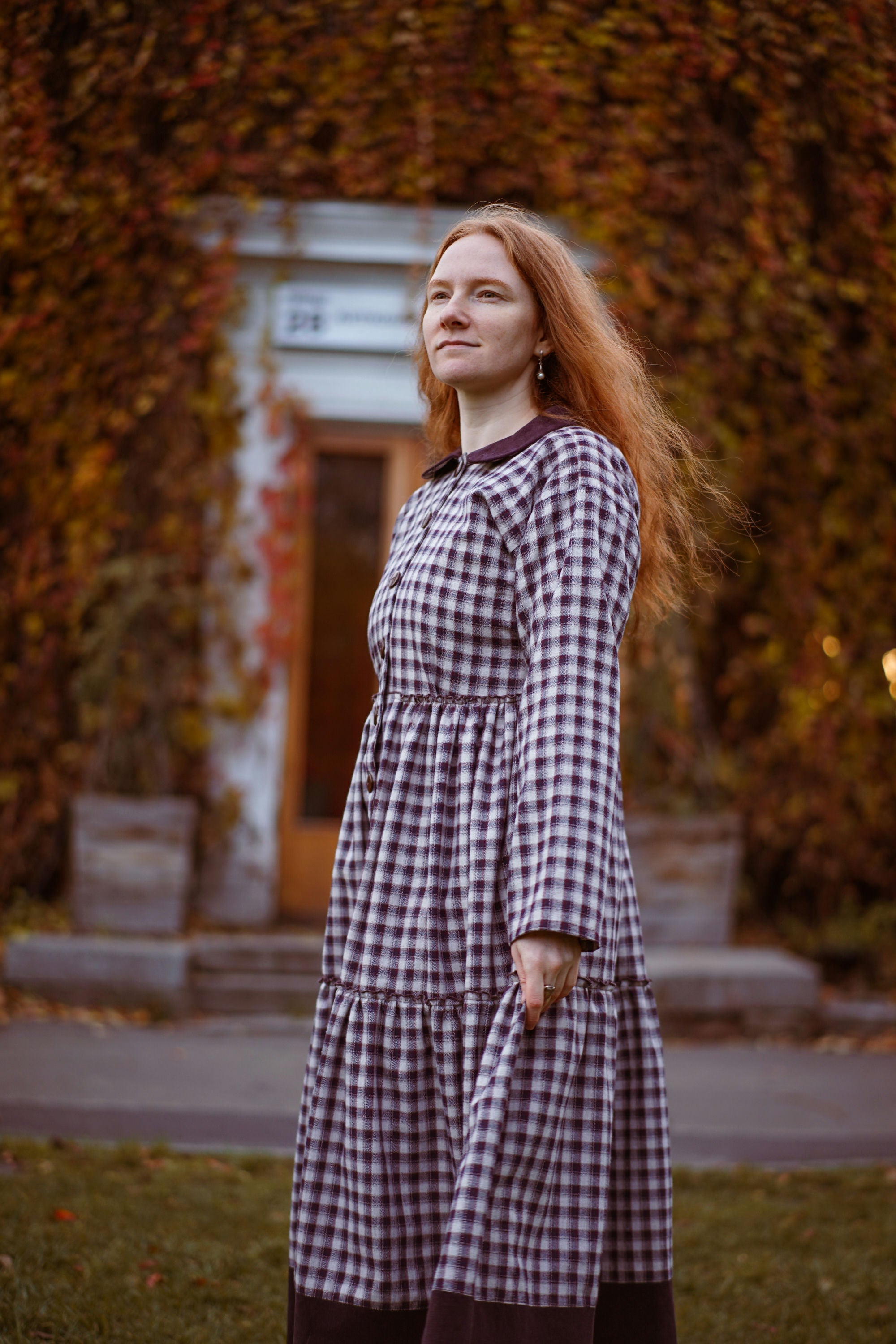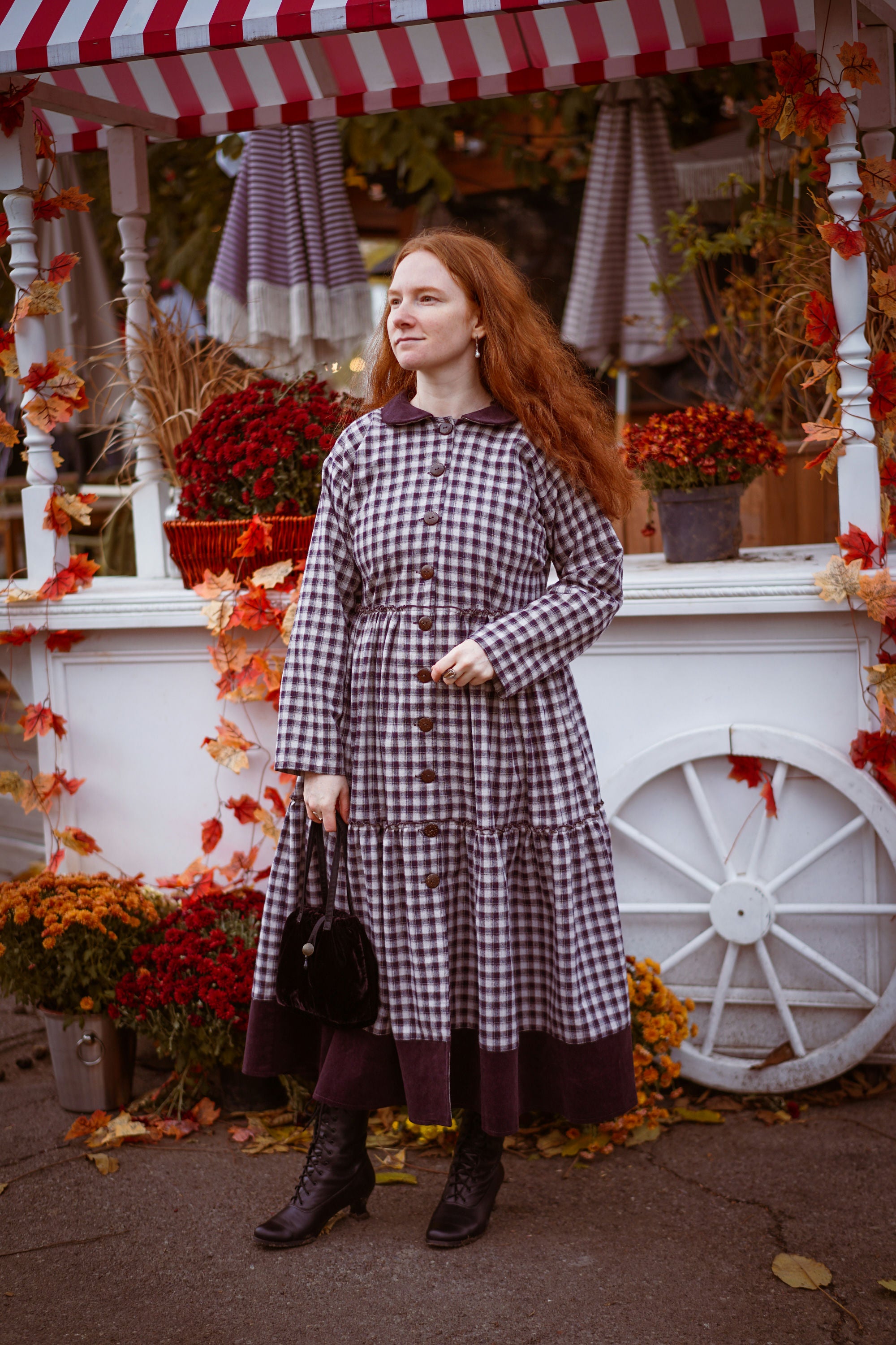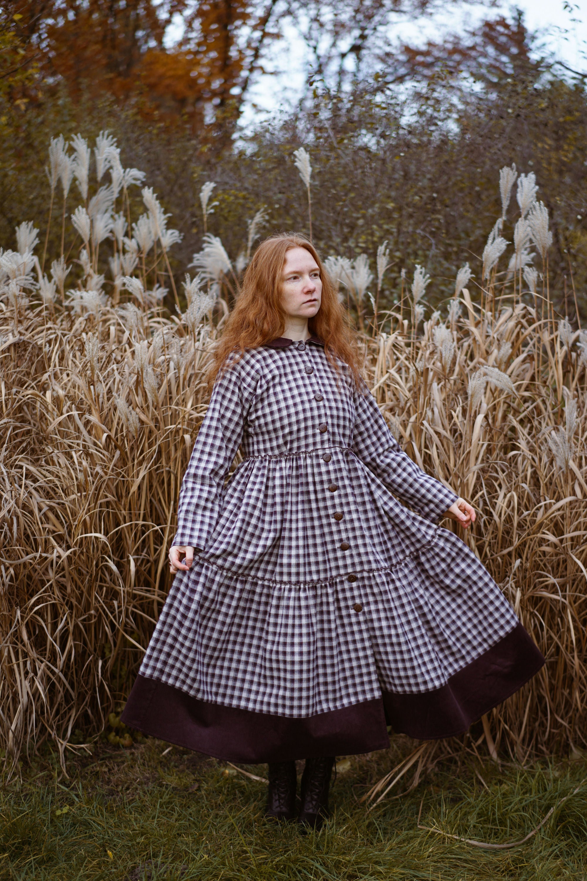 Тёплое платье миди с воротником, застёгивается на пуговицы и имеет скрытые карманы. У платья заниженная талия и двухъярусная юбка, швами наружу. Рукав длинный с ластовицей. Подол отделан бархатом. Материал фланель и бархат.