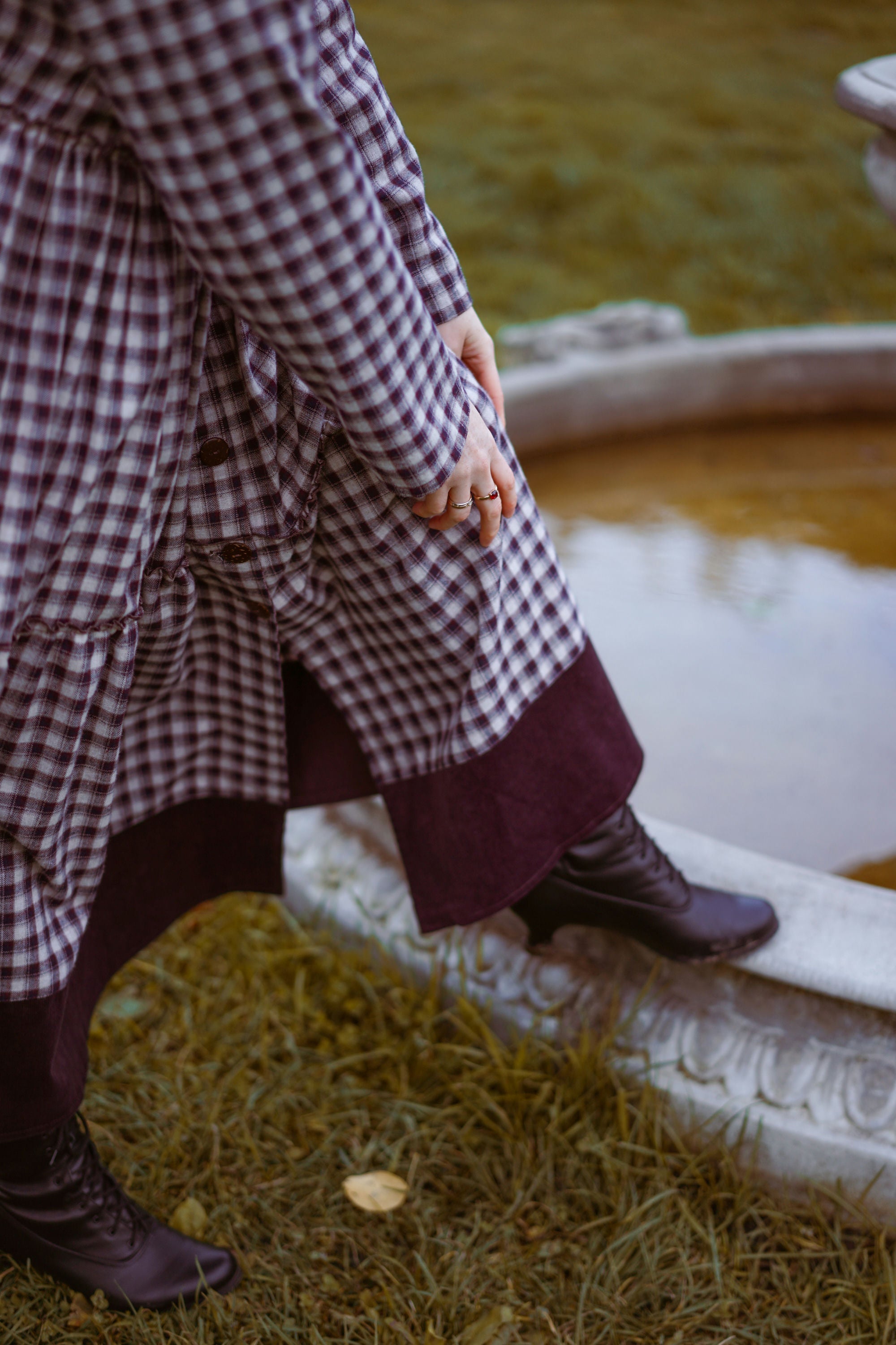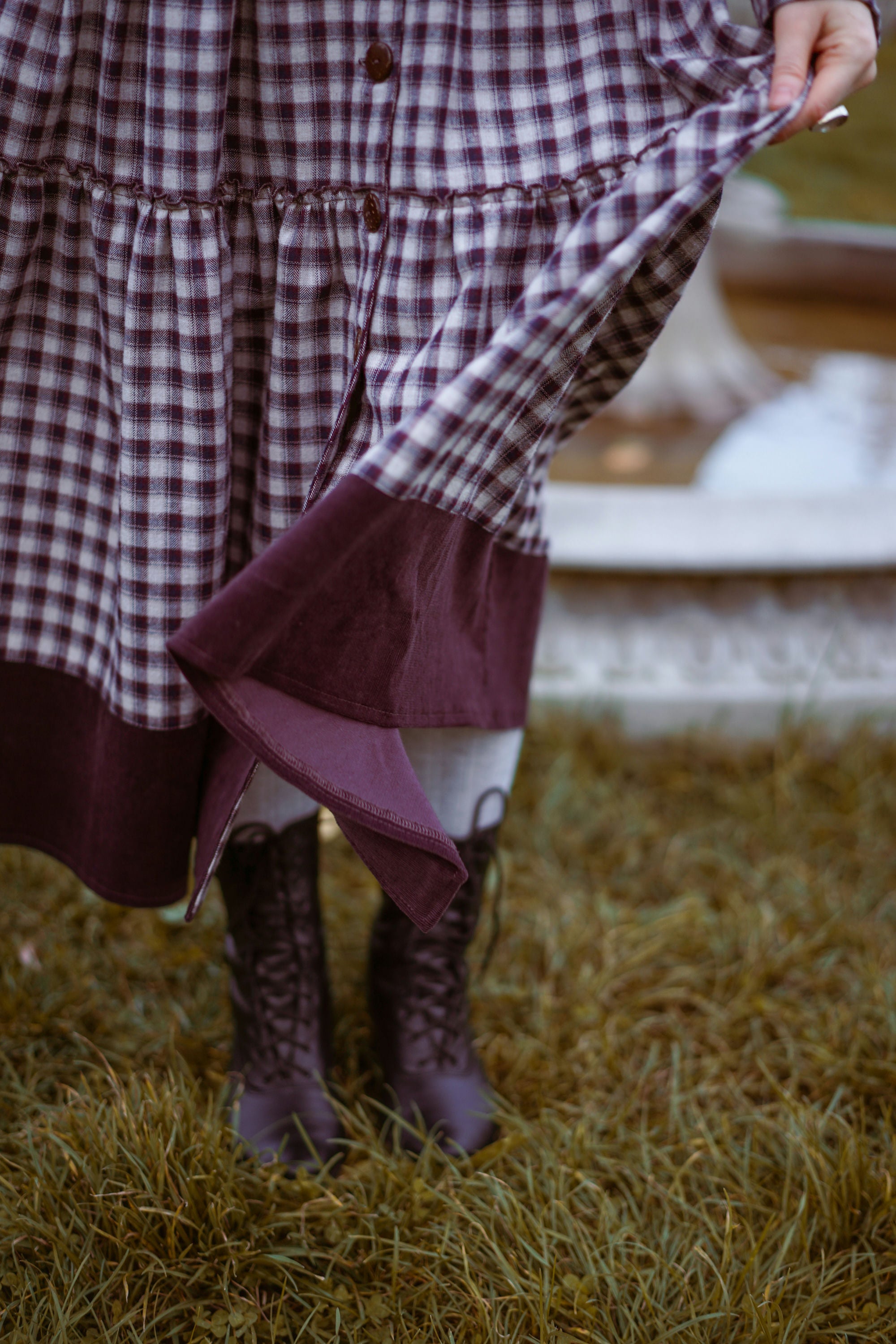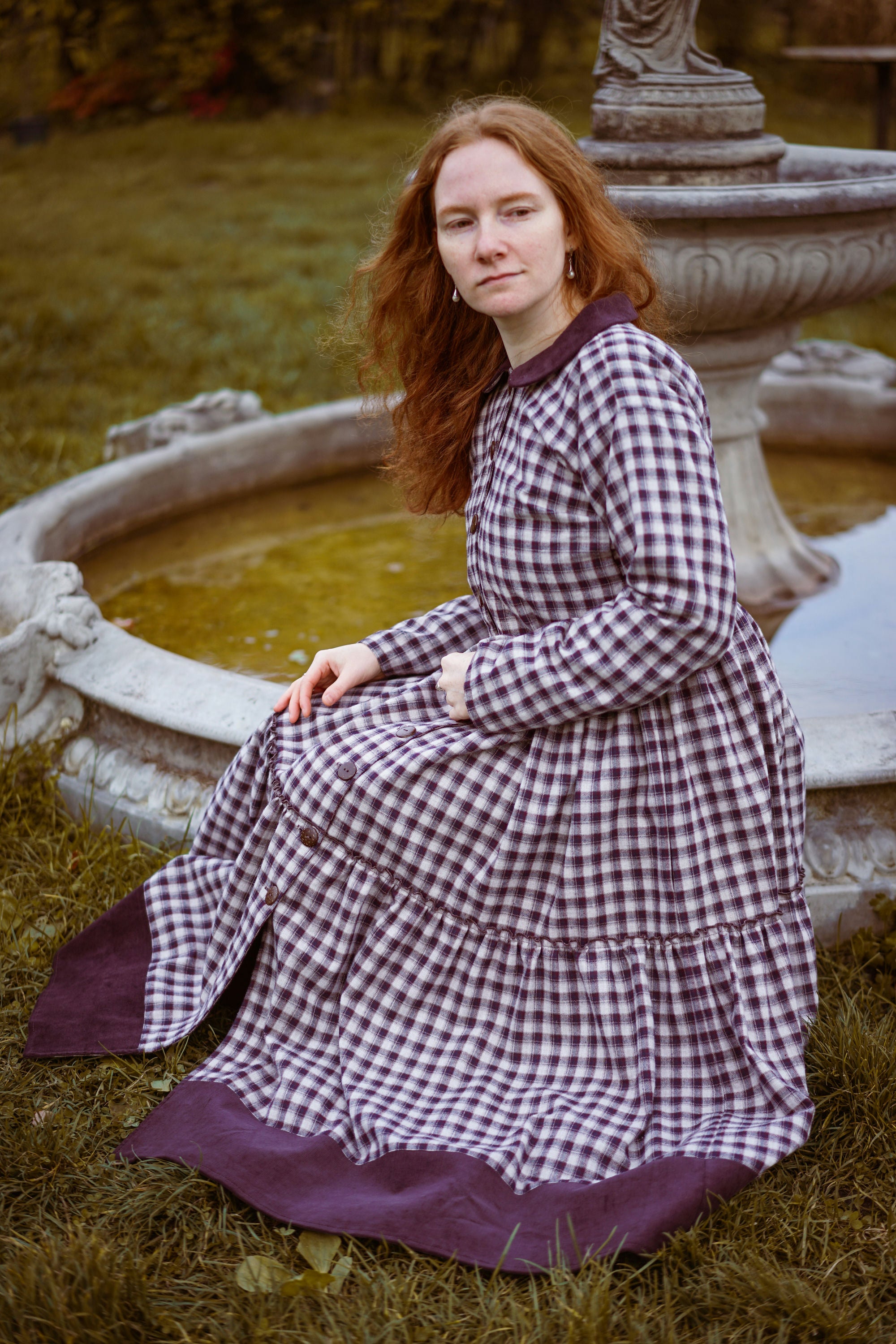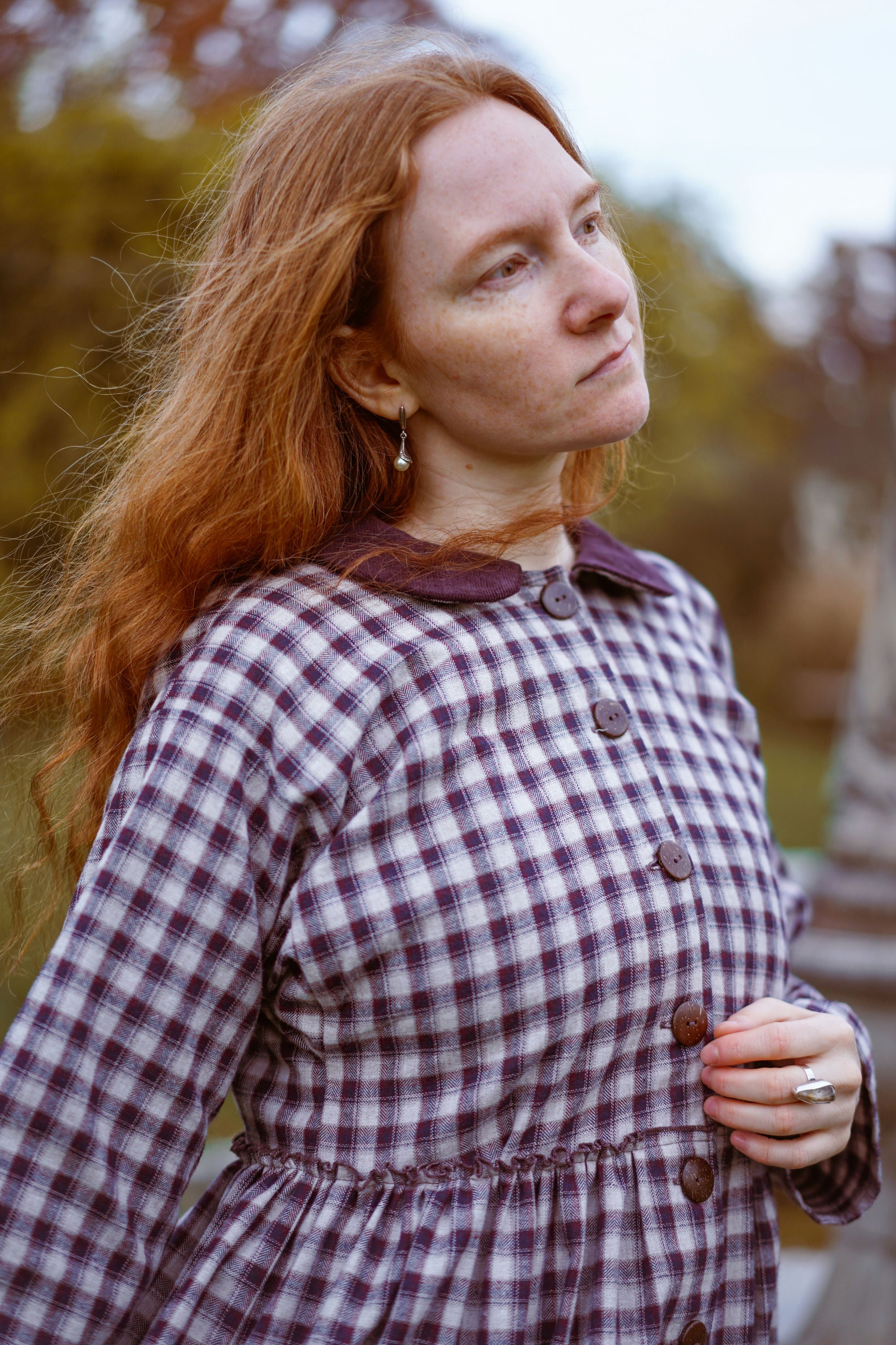 Тёплое платье миди с воротником, застёгивается на пуговицы и имеет скрытые карманы. У платья заниженная талия и двухъярусная юбка, швами наружу. Рукав длинный с ластовицей. Подол отделан бархатом. Материал фланель и бархат.