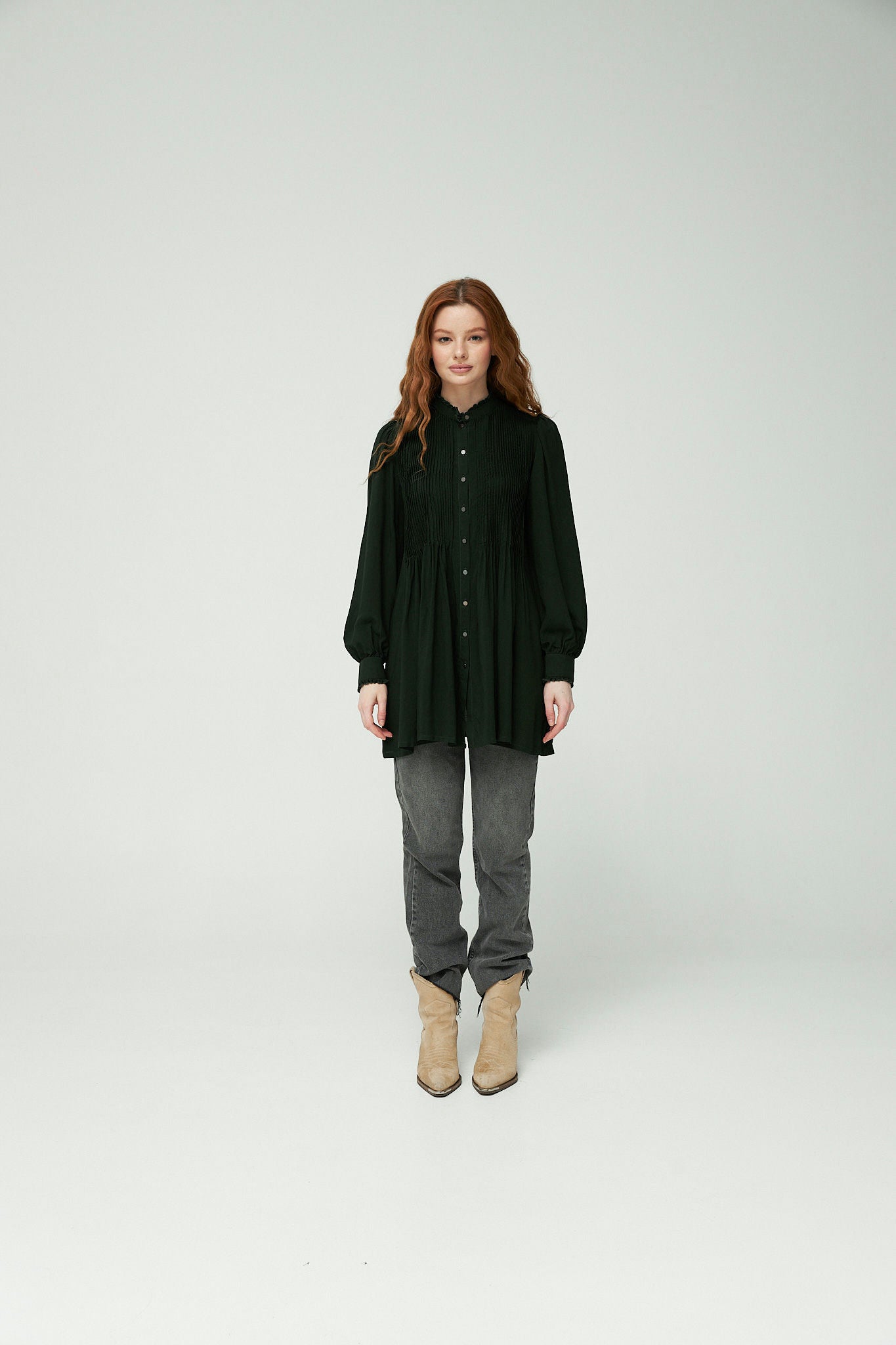 Однотонная блуза с воротником-стойкой. Имеет вертикальные вытачки спереди и сзади, застегивается на пуговицы. Втачной рукав с манжетом, присборенный по окату. Блузка украшена рюшами из основной ткани.