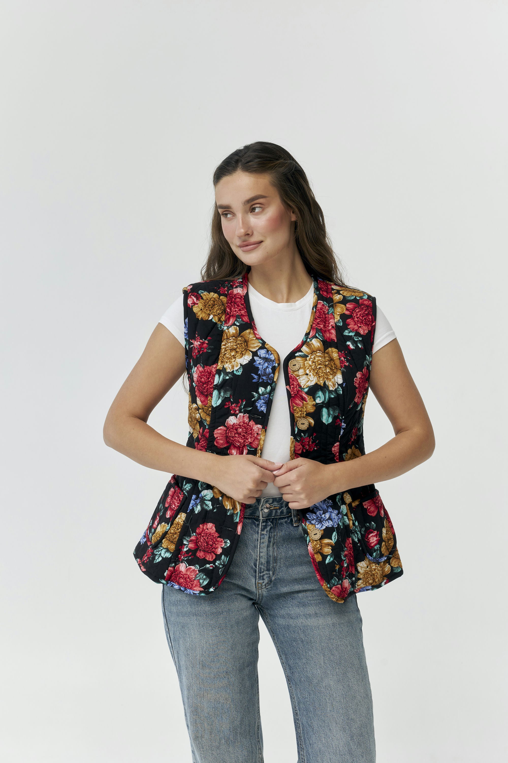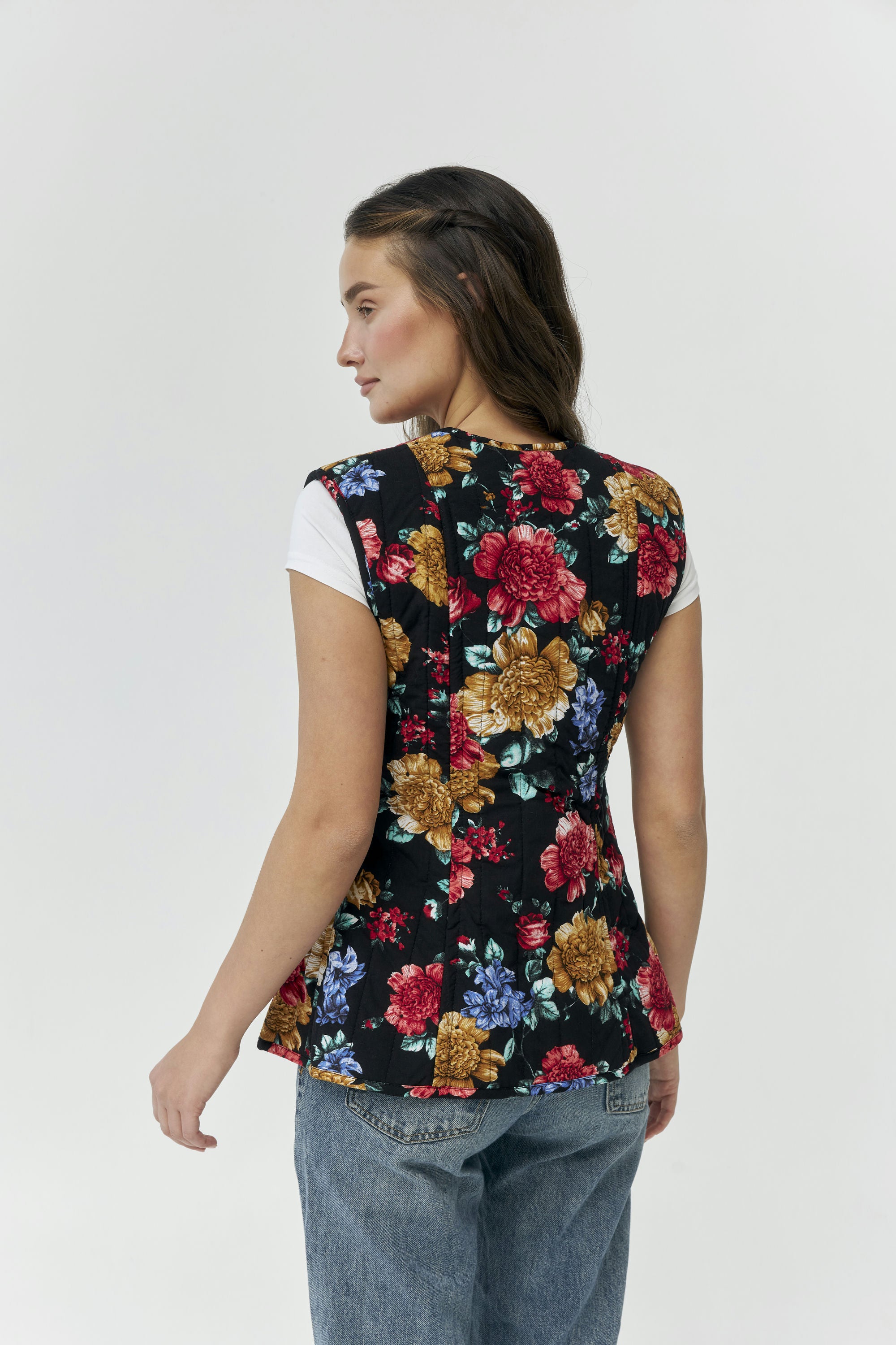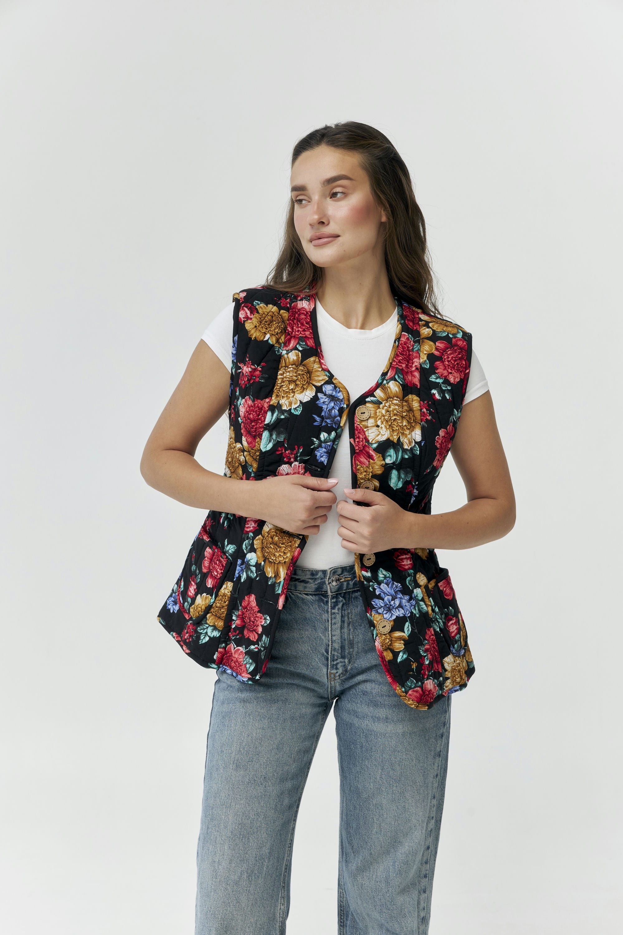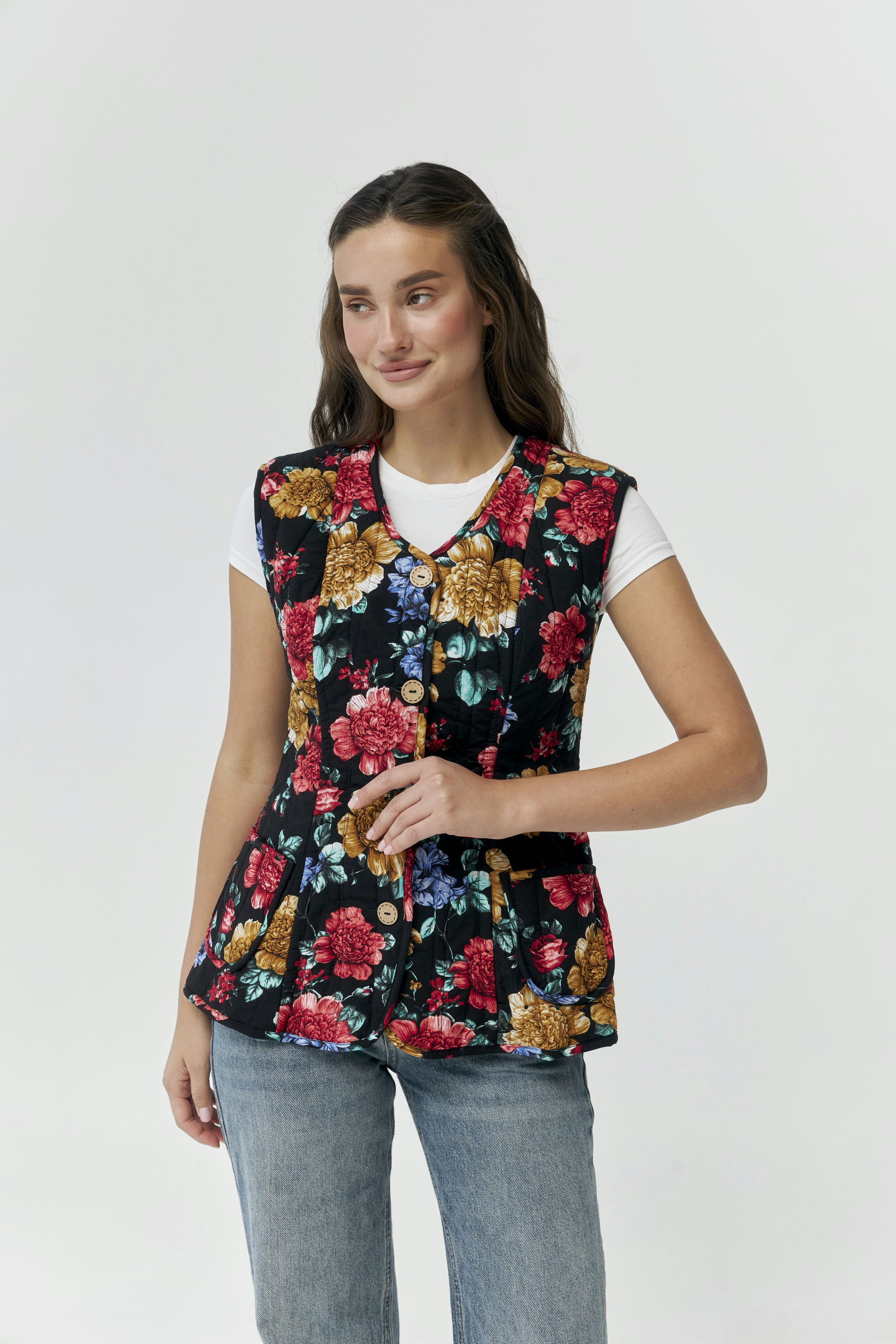 Тёплая приталенная жилетка. Застёгивается на пуговицы. Ткань - штапель. Подкладка - хлопковая. Наполнитель - шерстяной ватин.