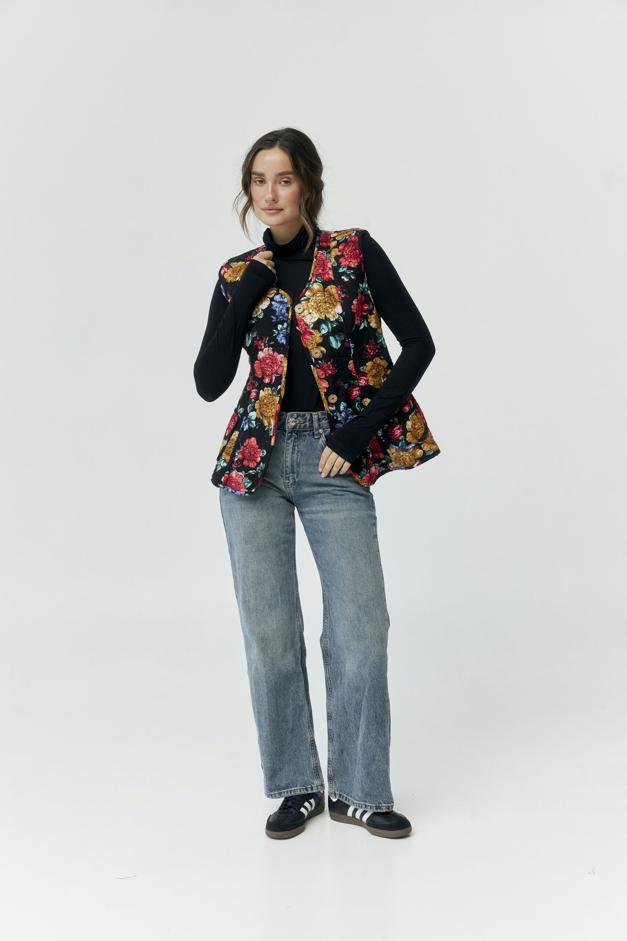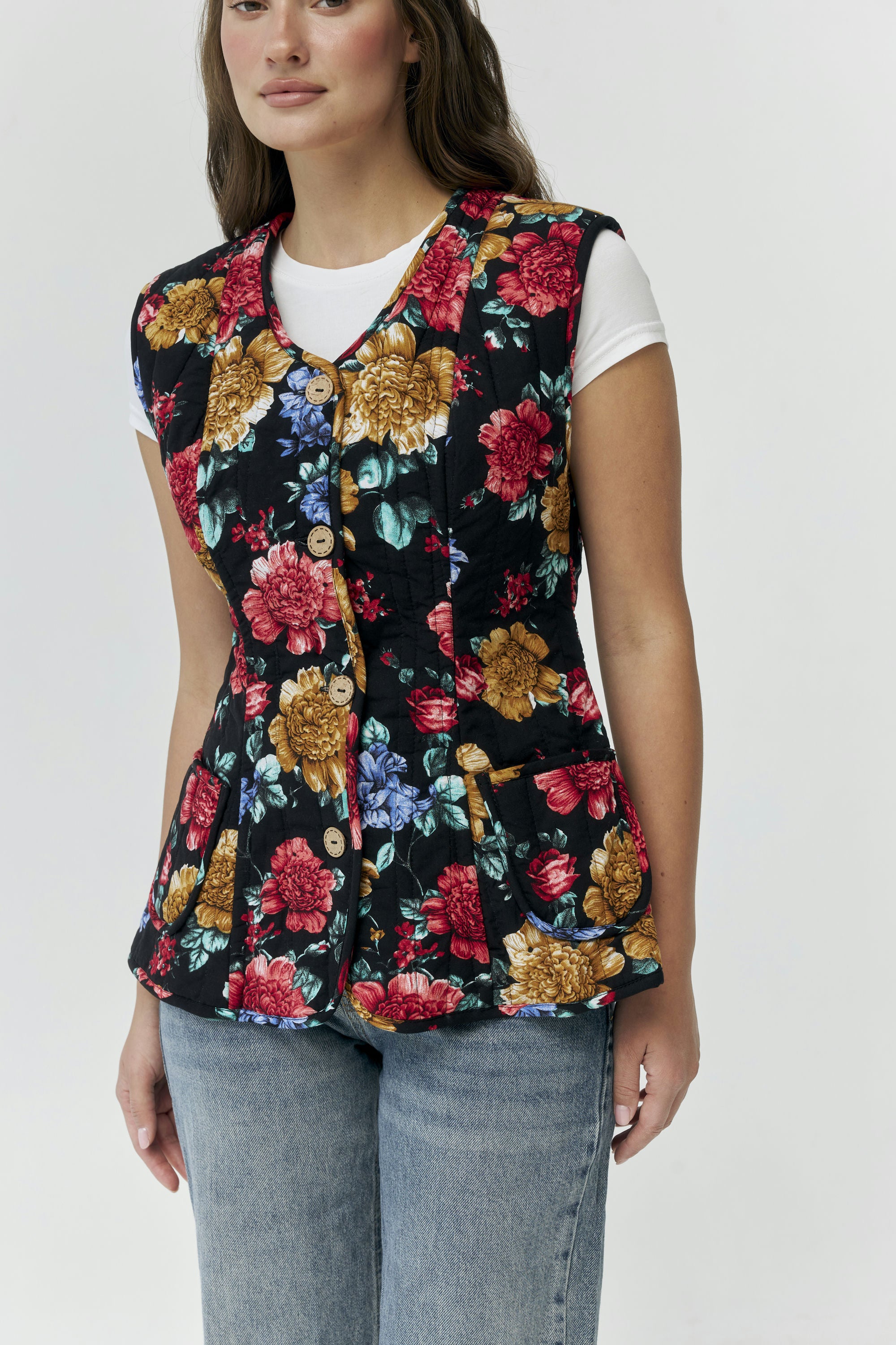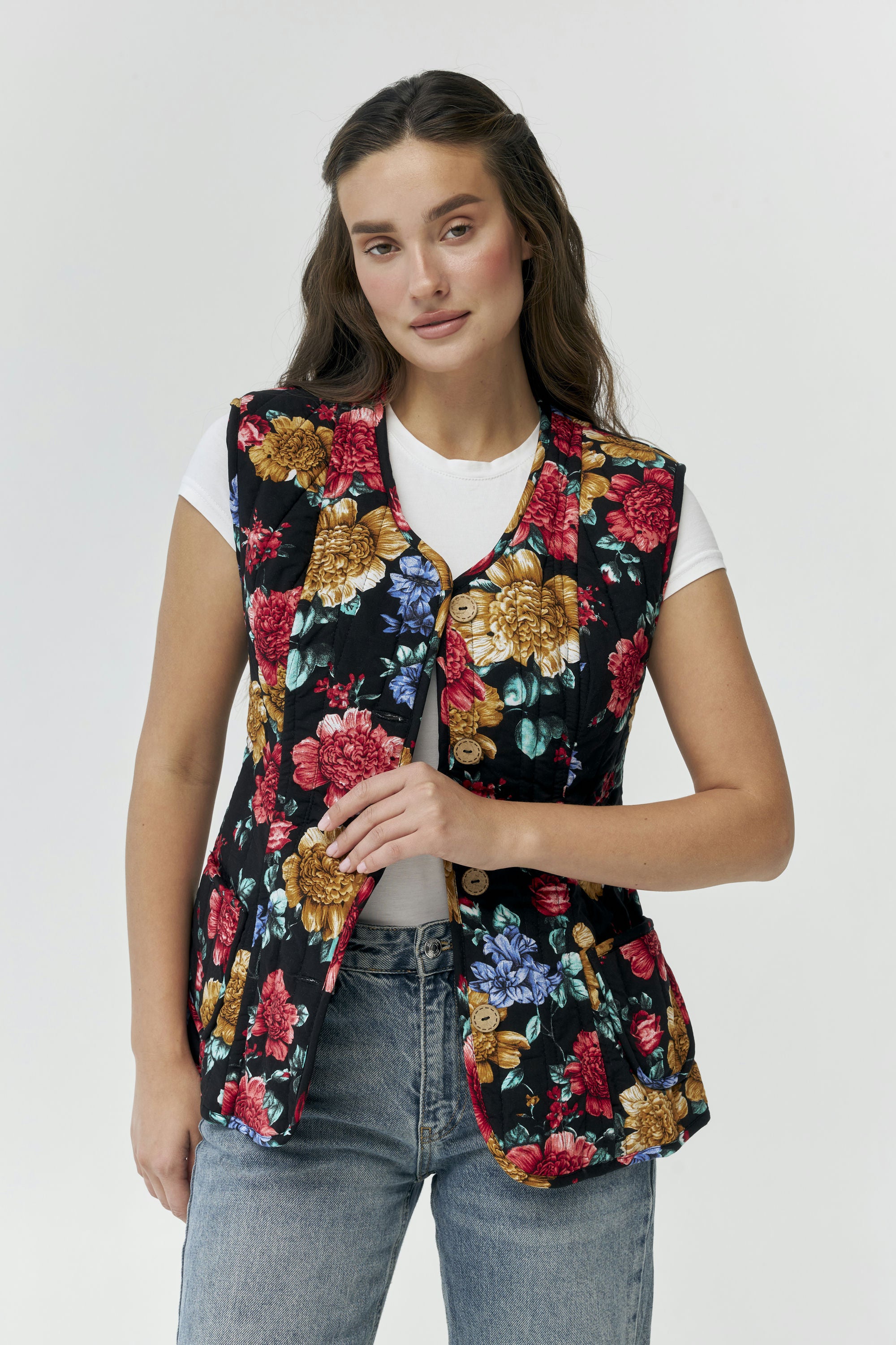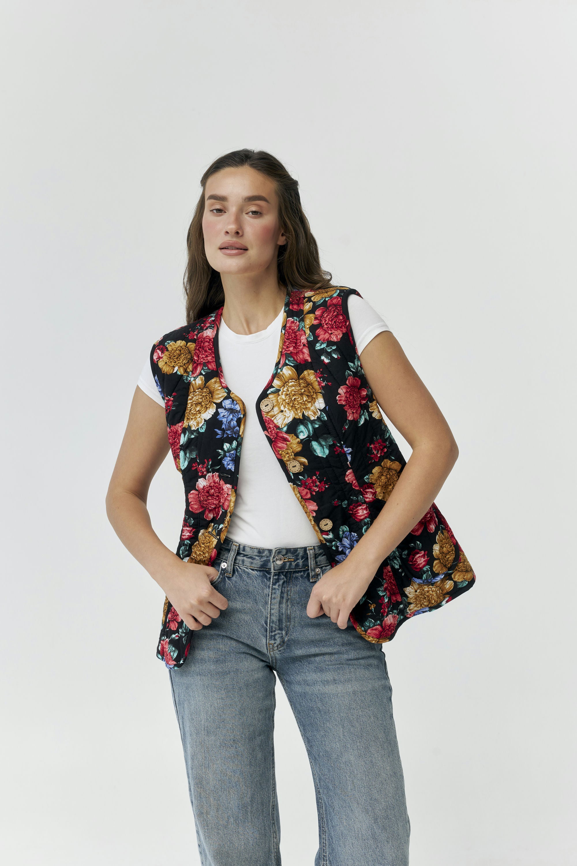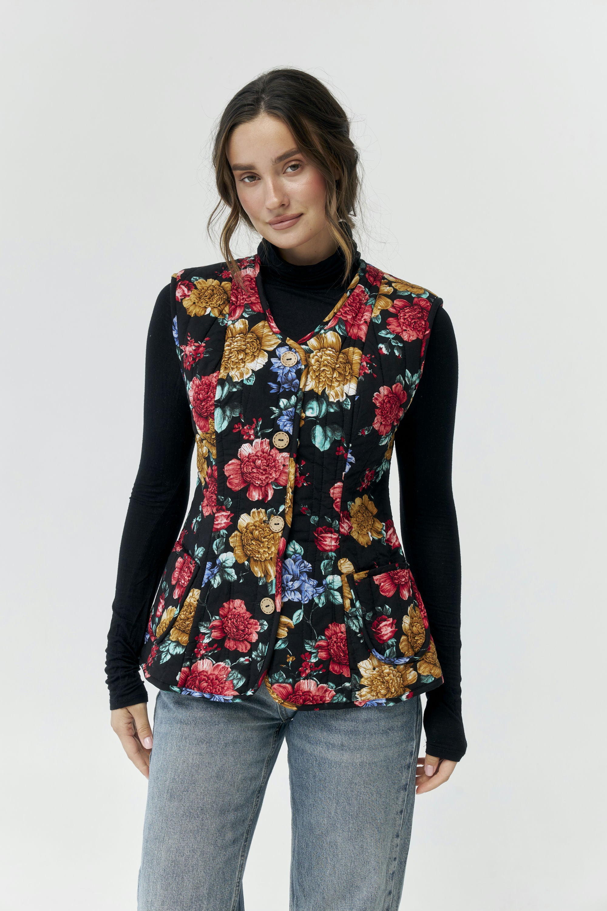 Тёплая приталенная жилетка. Застёгивается на пуговицы. Ткань - штапель. Подкладка - хлопковая. Наполнитель - шерстяной ватин.