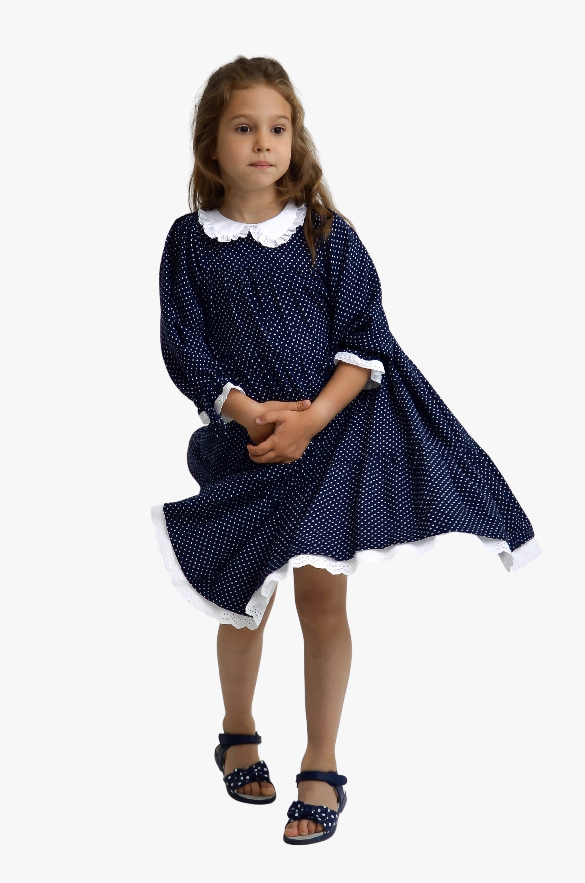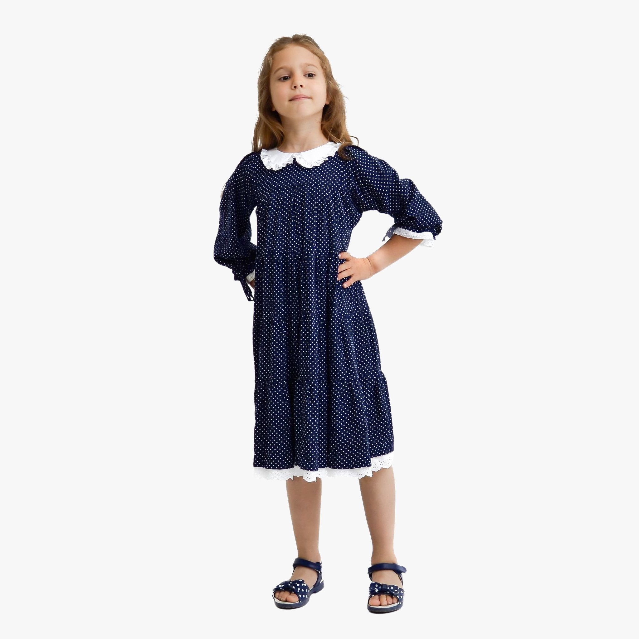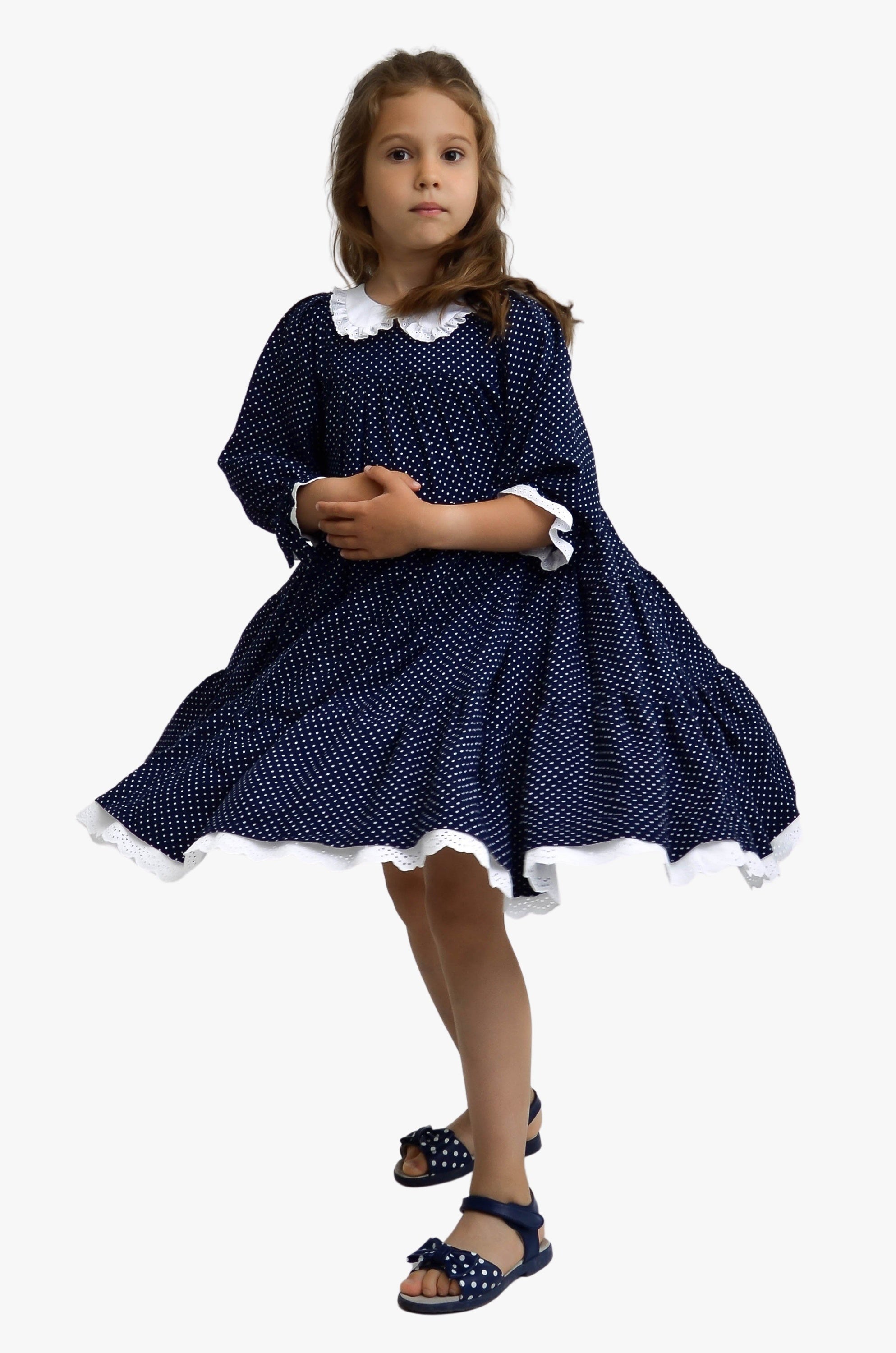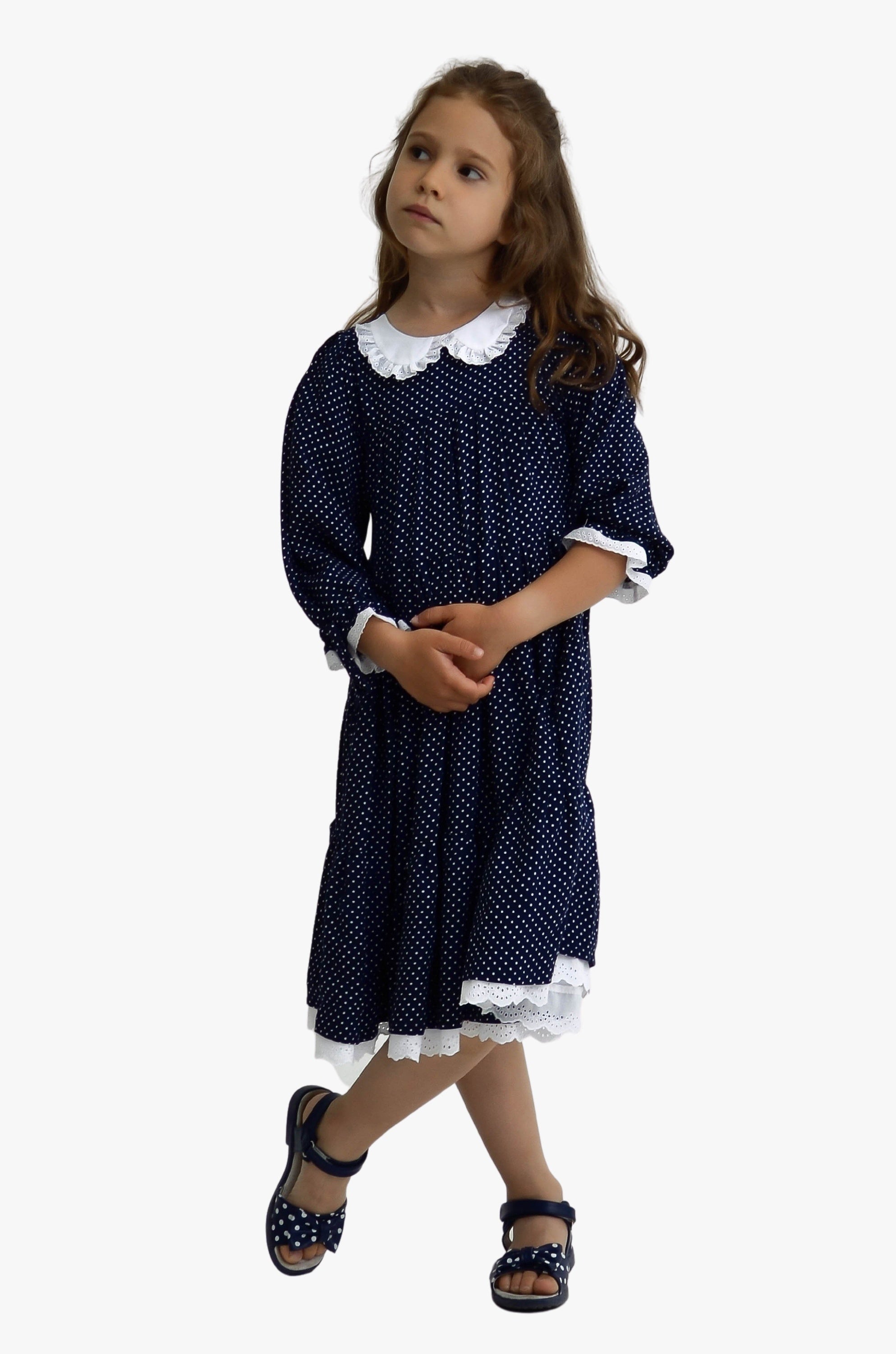 Детское платье свободного кроя с ярусами. Имеет круглый воротник, рукава 3/4 с ластовицей и завязки. Воротник и край рукава украшены кружевом. Подол имеет двойной ярус и также украшен кружевом. Ткань - вискоза и хлопок.