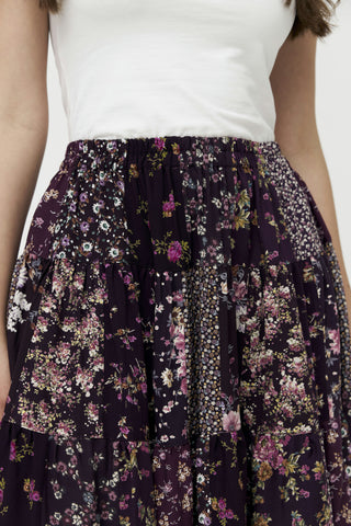 Юбка миди свободного кроя сшита ярусами в технике лоскутного шитья. Расположение и принт лоскутков могут изменяться, сохраняя цветовую гамму и творческую целостность. Талия на широкой резинке. Ткань - вискоза.