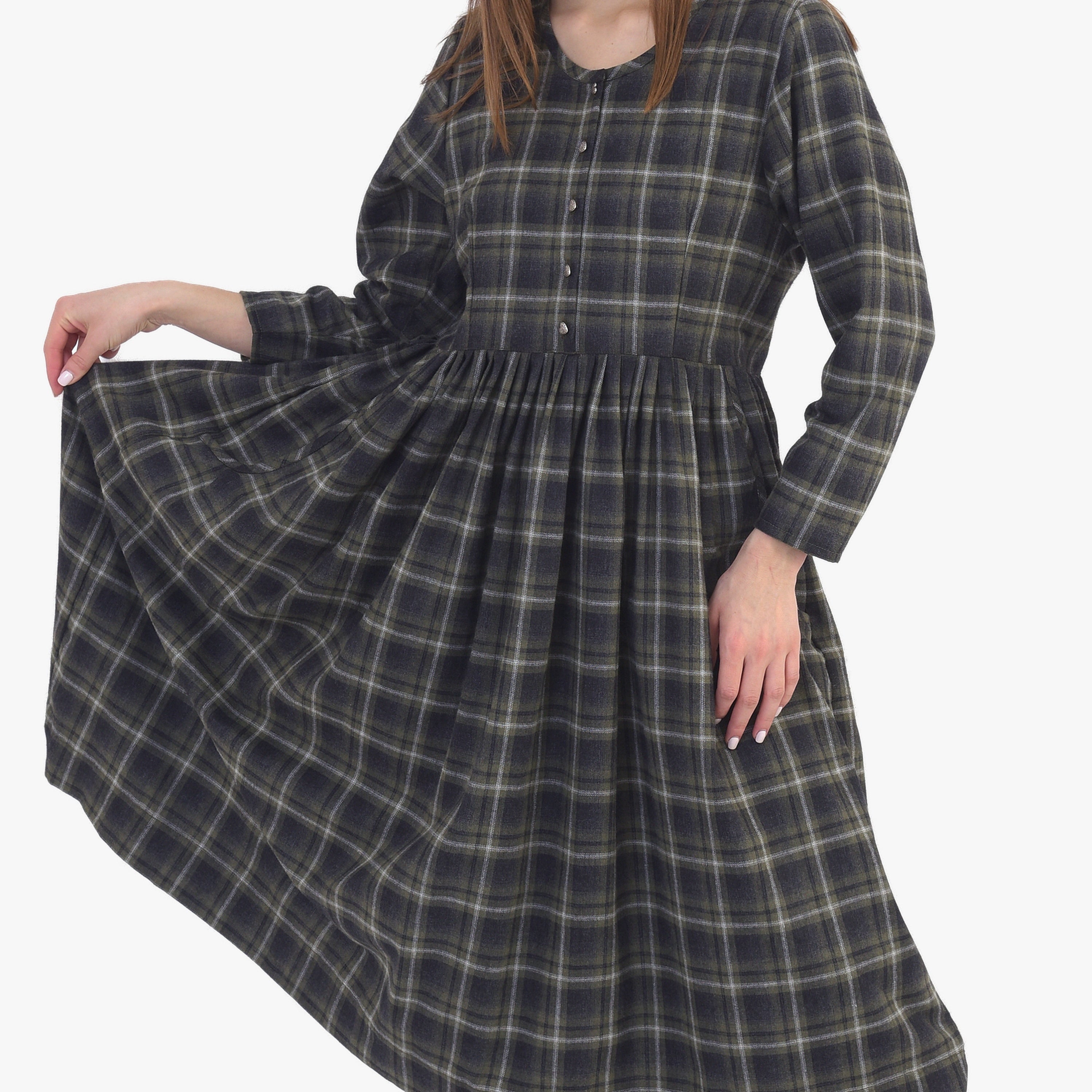 Теплое платье миди с карманами и отрезной талией. Имеет рукав 7/8 и застегивается на пуговицы. По линии талии слегка присборено. Ткань - байка.