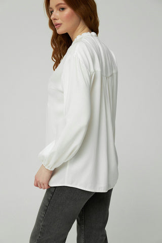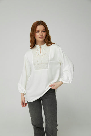 Блузка с вшитым рукавом и воротником-стойкой со шнурком. Передняя часть имеет двойную вставку с разрезом, низ рукавов на резинке. Низ изделия оформлен фигурным разрезом по бокам. Передняя вставка выполнена из льняного полотна. Основной материал — вискоза.