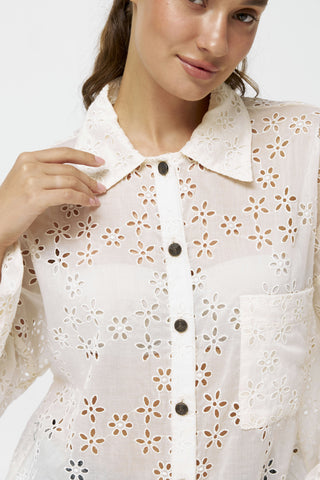 Блузка прямого кроя с воротником-стойкой. Застёгивается на пуговицы. Длинный рукав. Ткань — кружево.