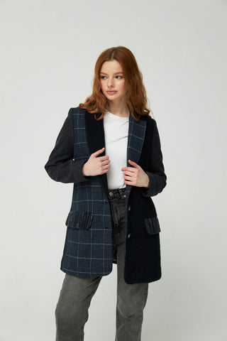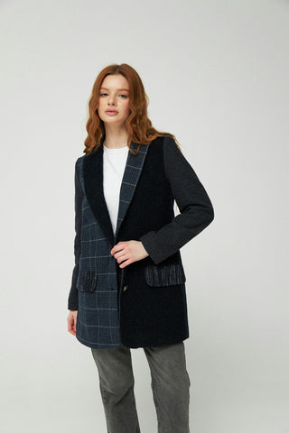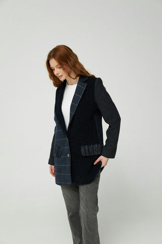 Жакет прямого кроя, с втачным рукавом и отложным воротником с лацканами. Имеет однобортную застежку на пуговицы и карманы с клапаном. Выполнен в технике пэчворк. Материал - шерсть.