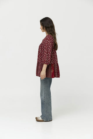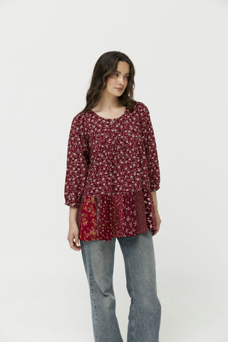 Туника свободного кроя с кокеткой над грудью и планкой на пуговицах. Рукав 3/4 с ластовицей. Принты нижнего яруса пэчворк могут изменяться, сохраняя цветовую гамму. Ткань 100% вискоза.
